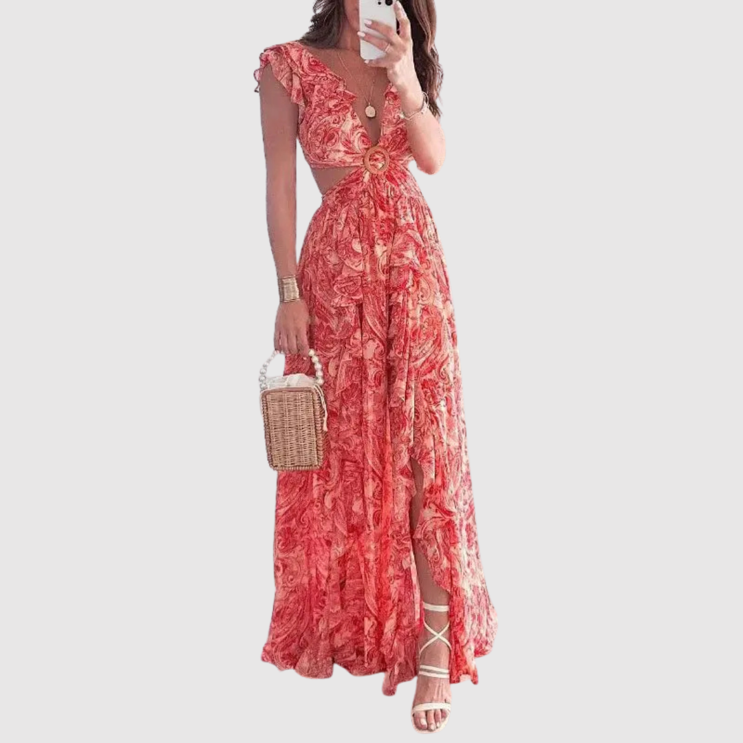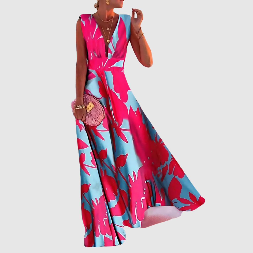 Лилия – Дълга рокля с V-образно деколте и принт