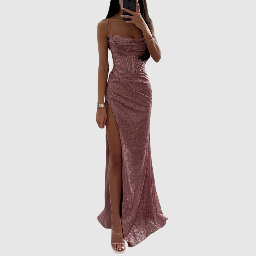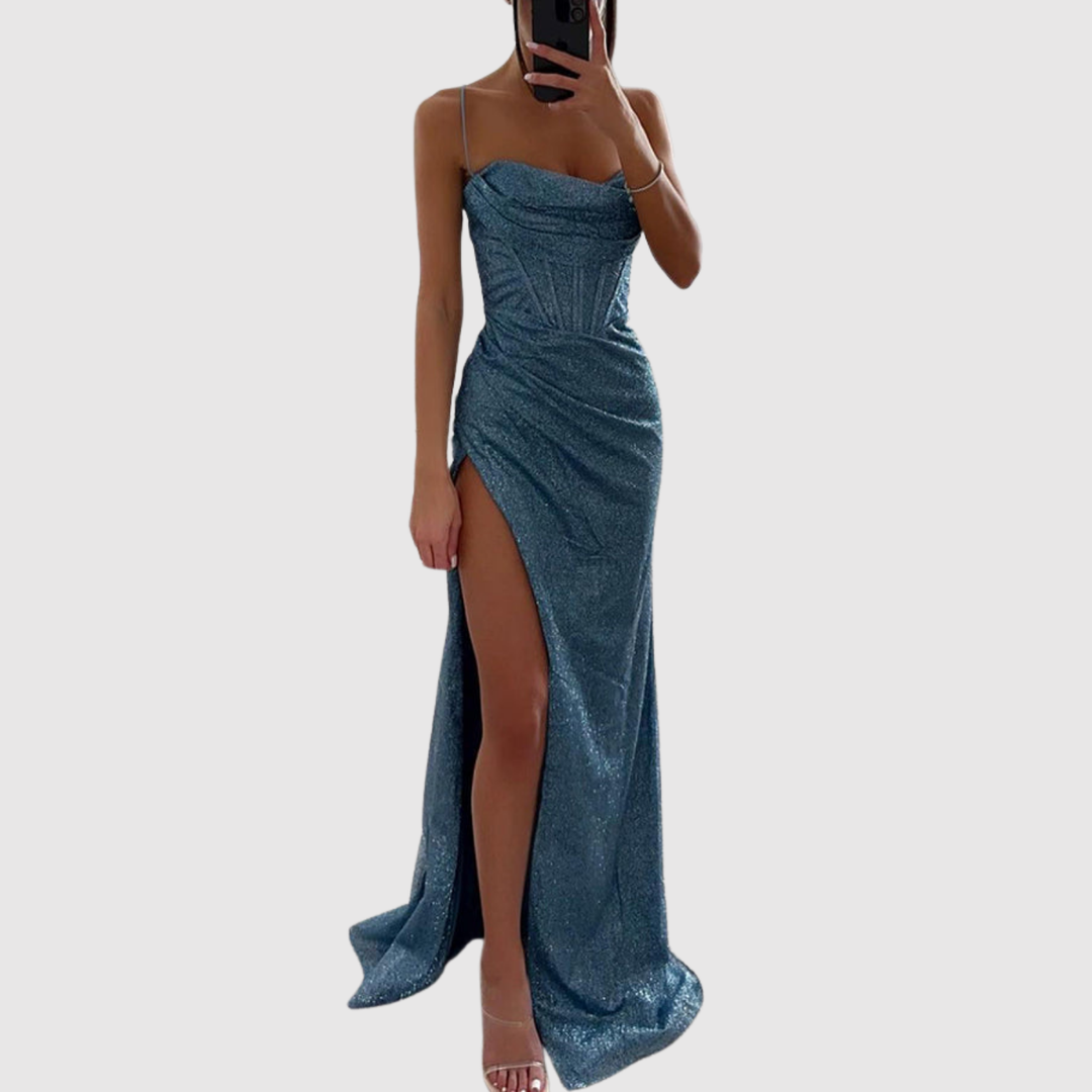 Лилия – Дълга вечерна рокля с висока цепка и блестящи детайли