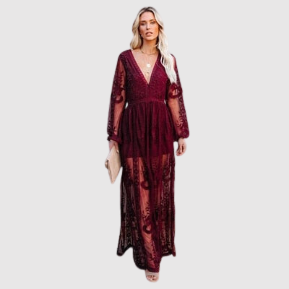 Лилия – Вечерна рокля с дантелени ръкави и течен шифон