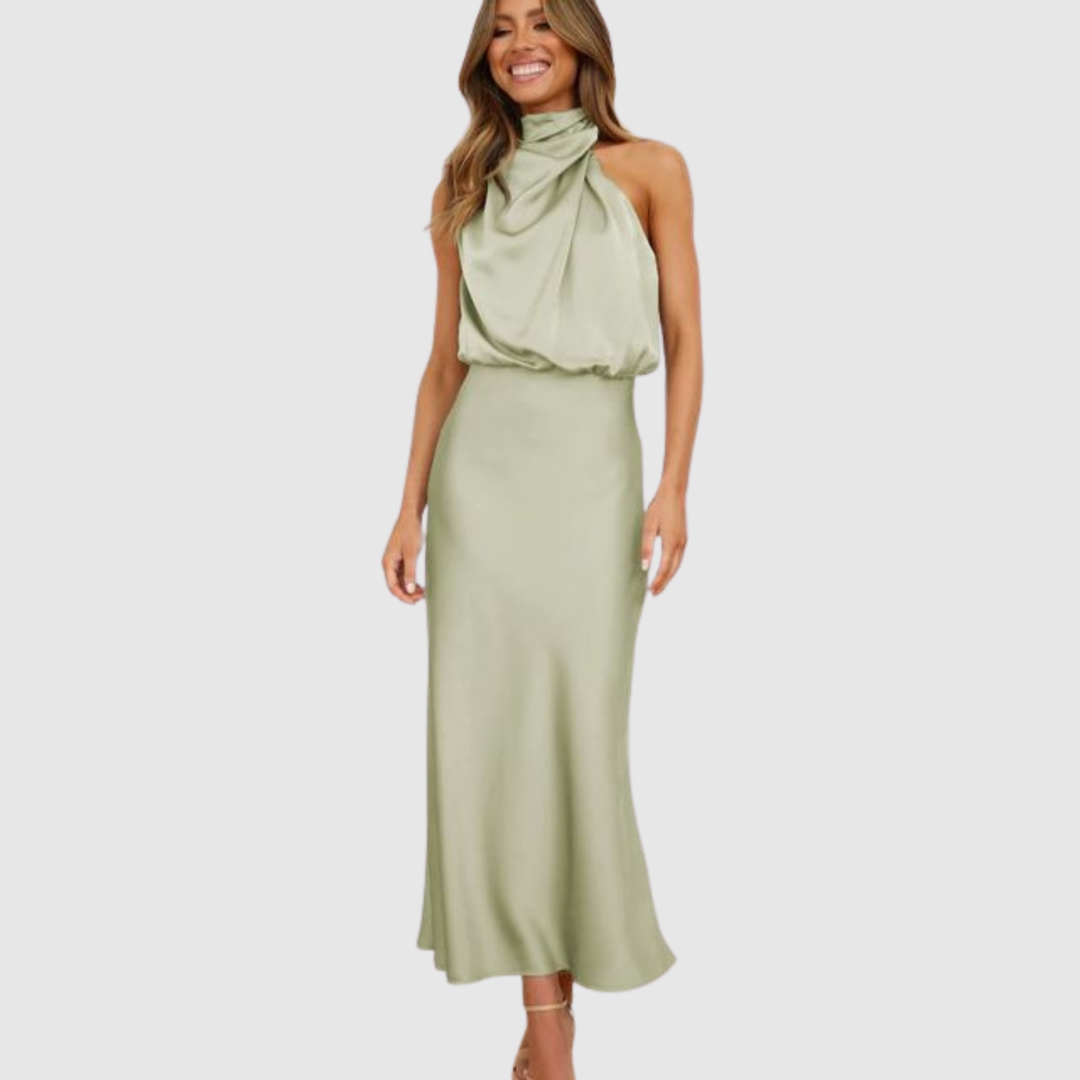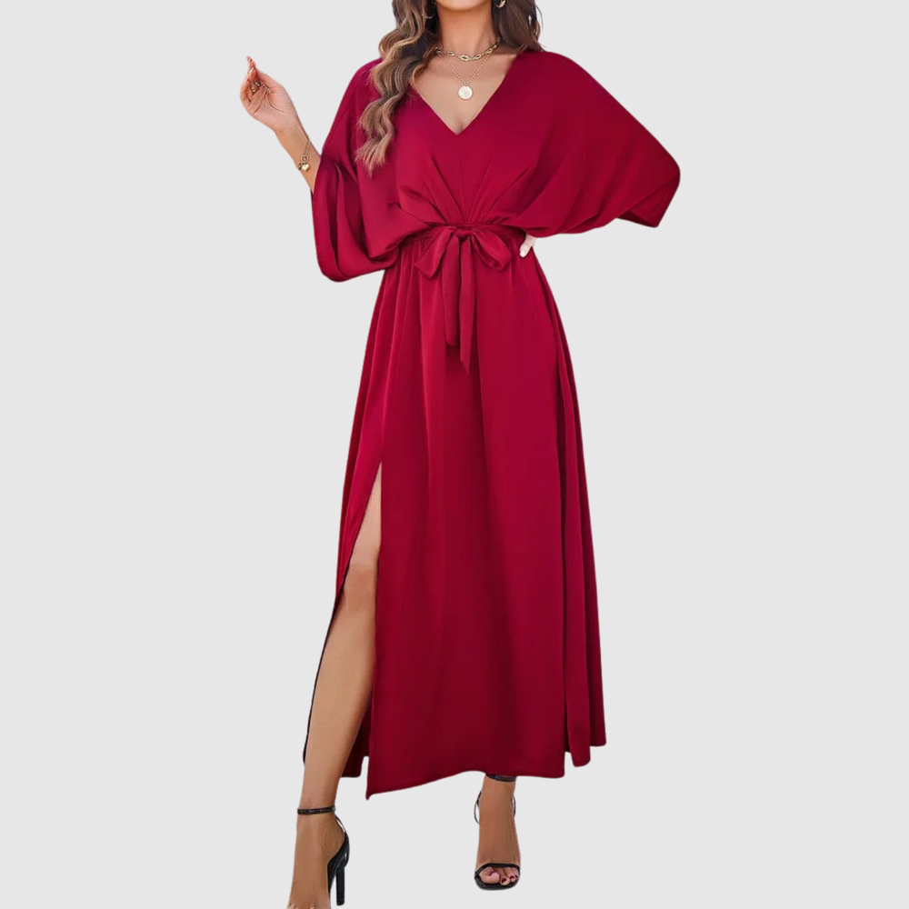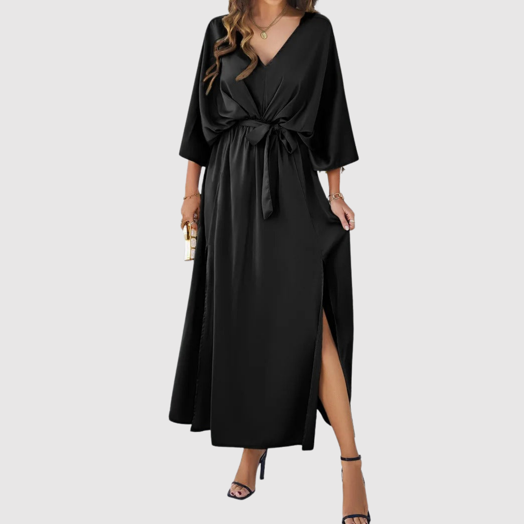 Лилия – Сатенена рокля с V-образно деколте и разрез