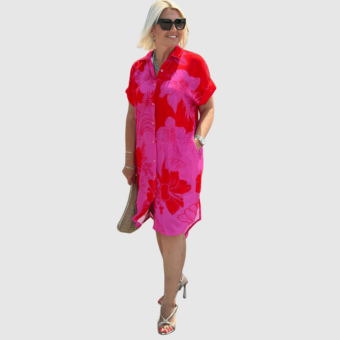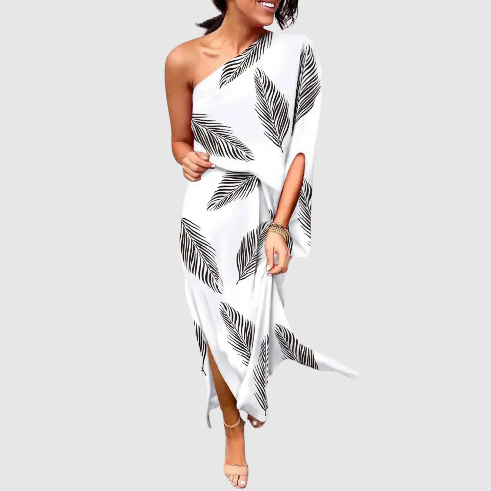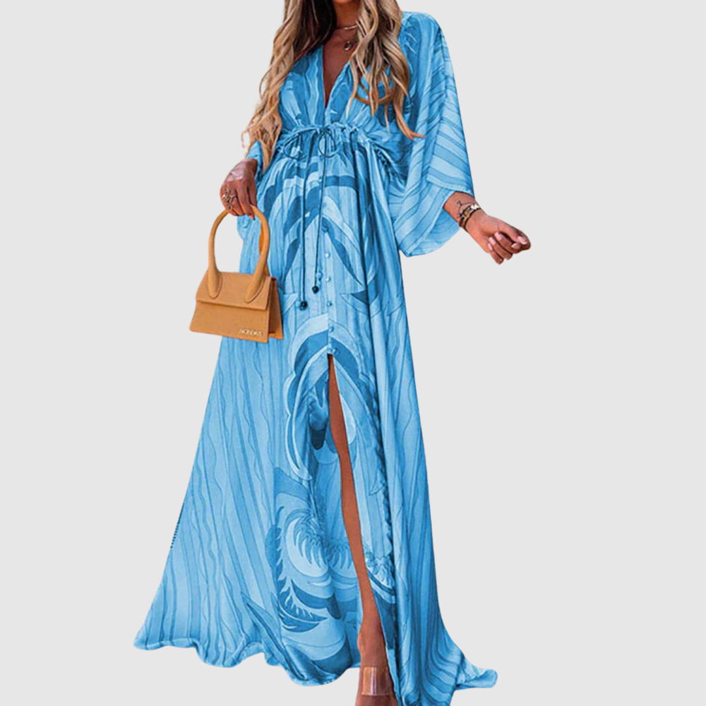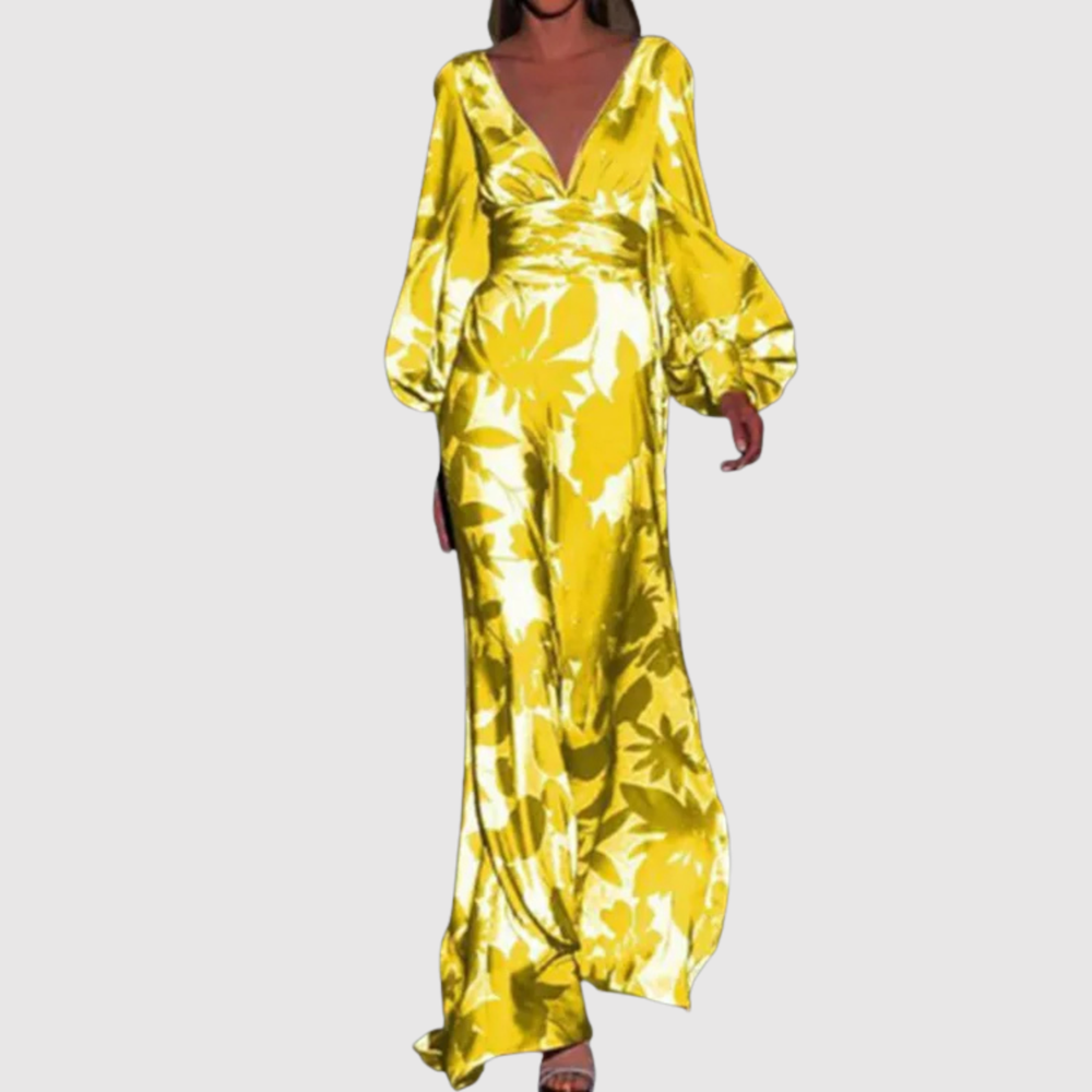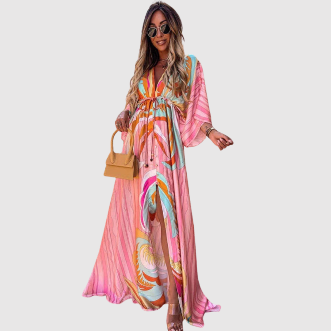 Лилия – Дълга рокля с тропически принт и дълбоко V-образно деколте