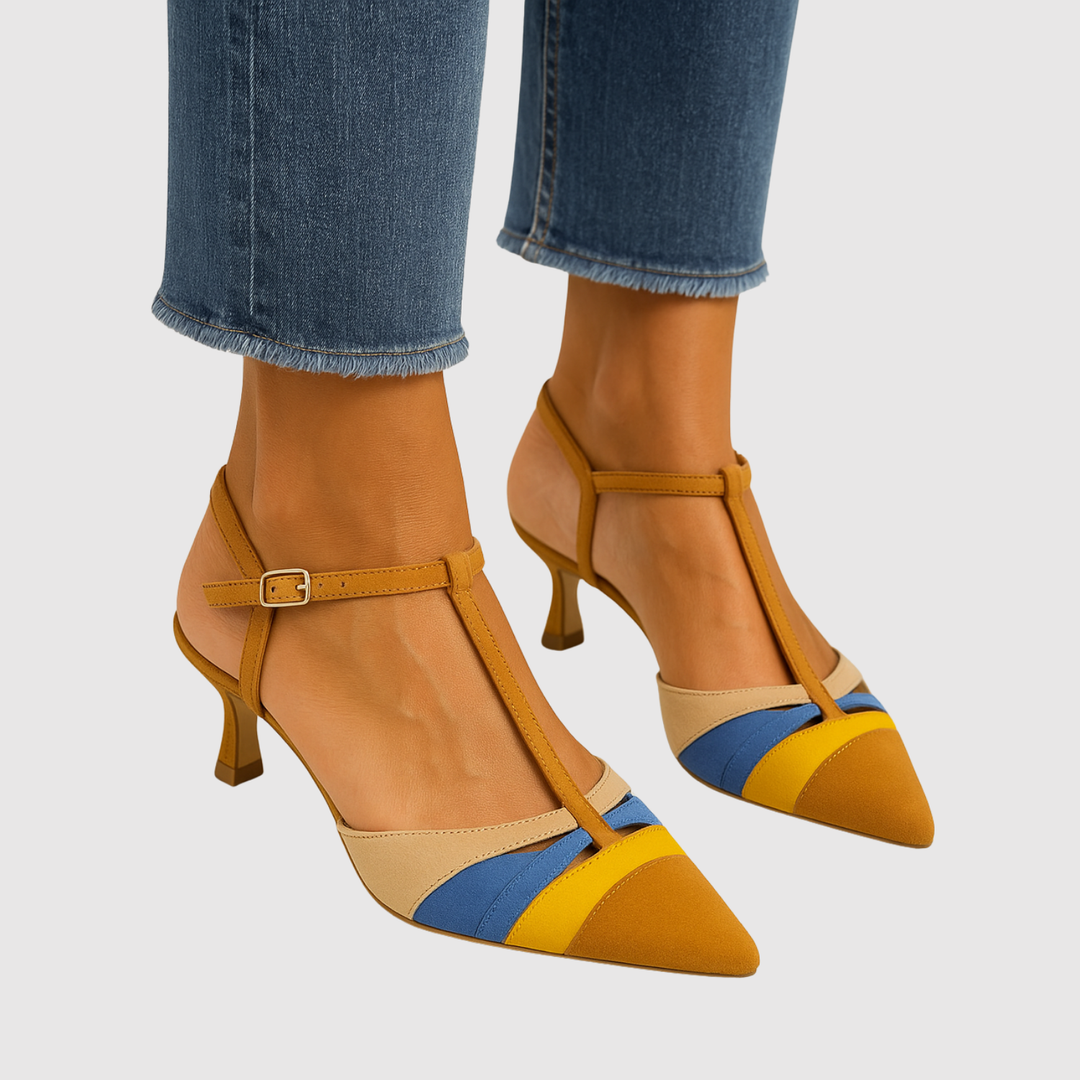 Теодора - Цветни блок-хилни сандали в розово и оранжево