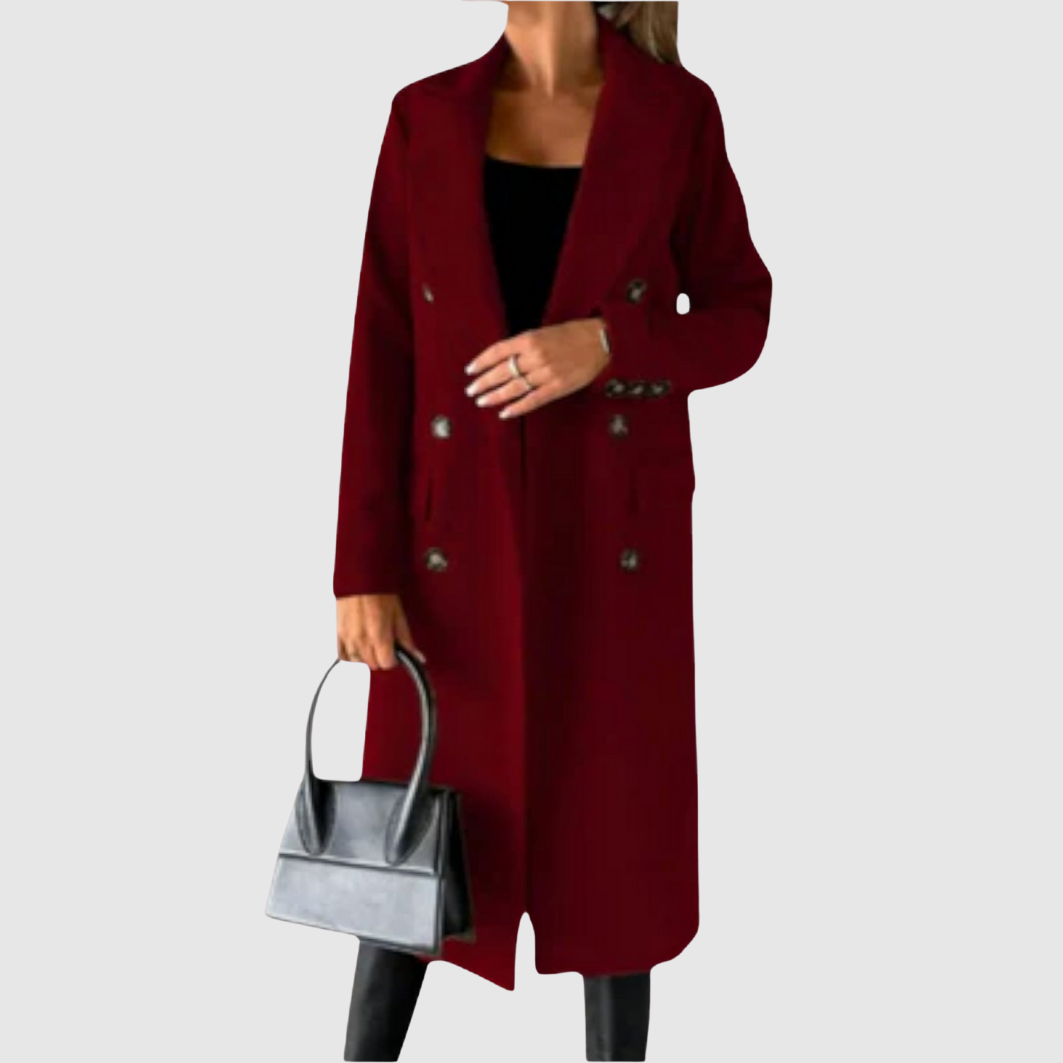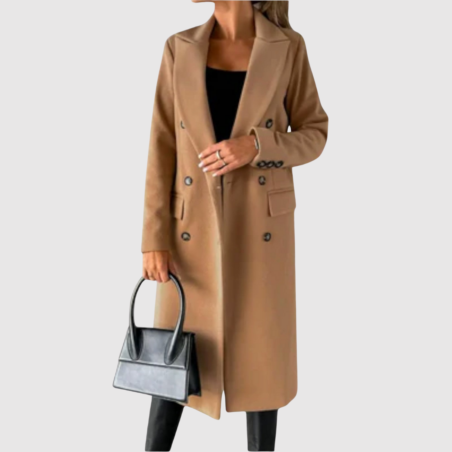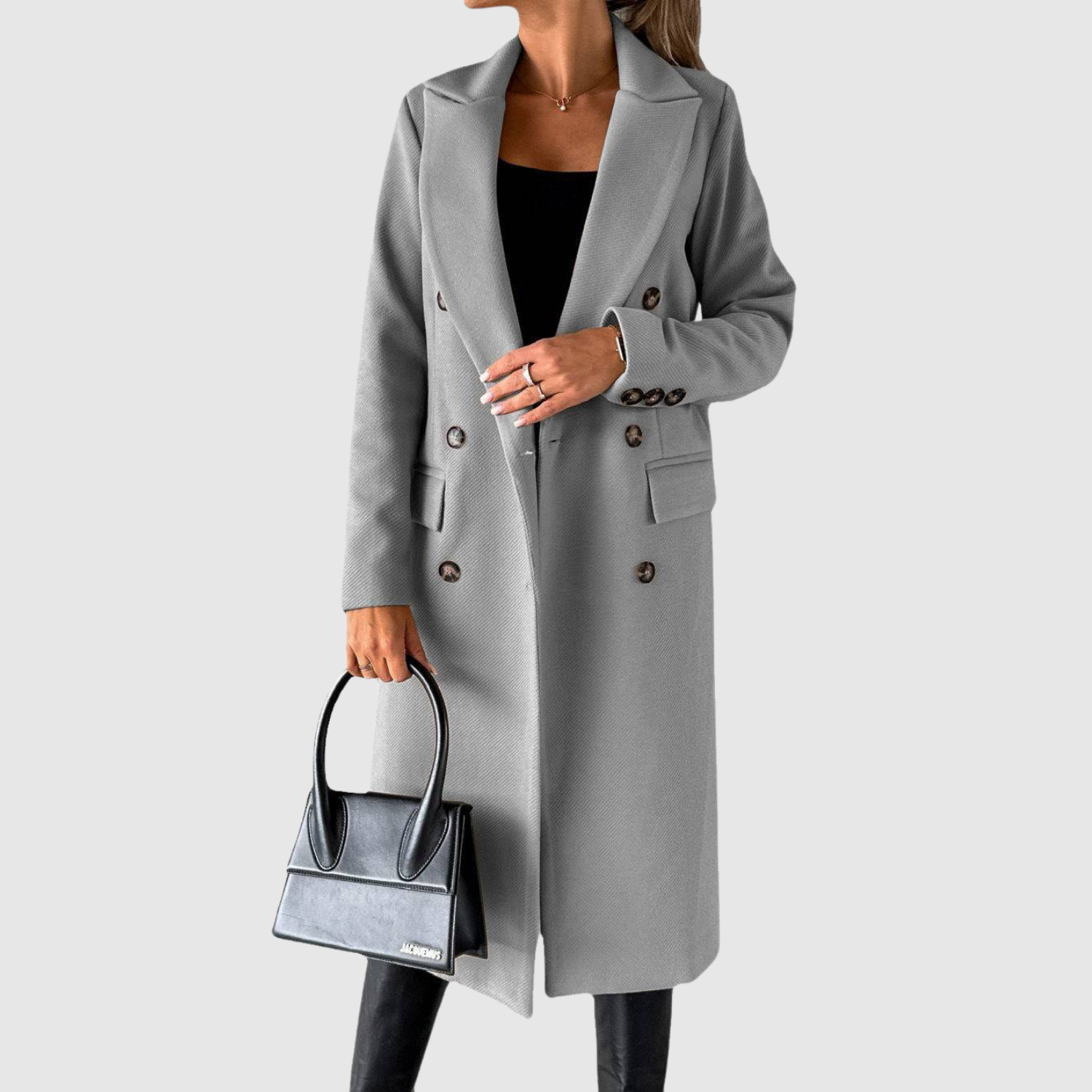 Това дълго палто съчетава sophistication с функционалност. Двойното закопчаване и чистите линии създават стилен вид, перфектен за ежедневието и по-официални поводи.