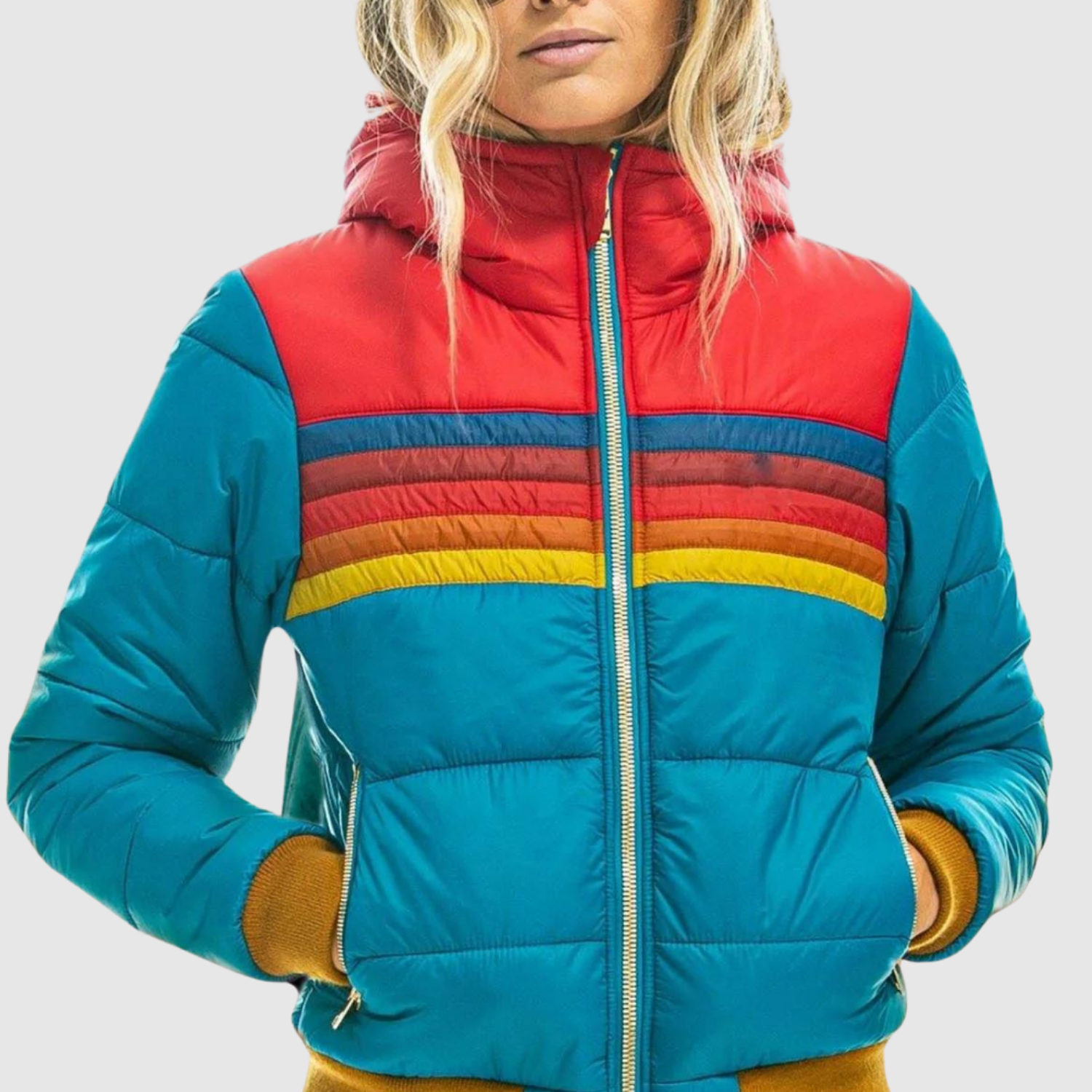 Това яке комбинира спортна инспирация с топъл, подплатен дизайн. Цветните ивици придават уникален ретро вид, докато меката изолация защитава от студа. Идеален избор за ежедневна употреба и за дейности на открито през преходните и зимните месеци.
