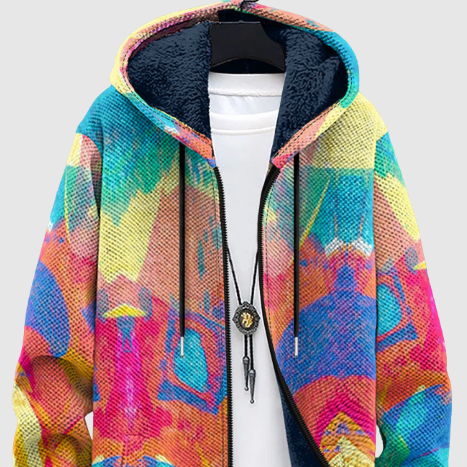 Тази худи съчетава меки преходи и силни цветови тонове в съвременен, абстрактен дизайн. Тя е перфектна за вас, които обичате креативността и комфорта – привлекателна за всеки ден и свободно време.