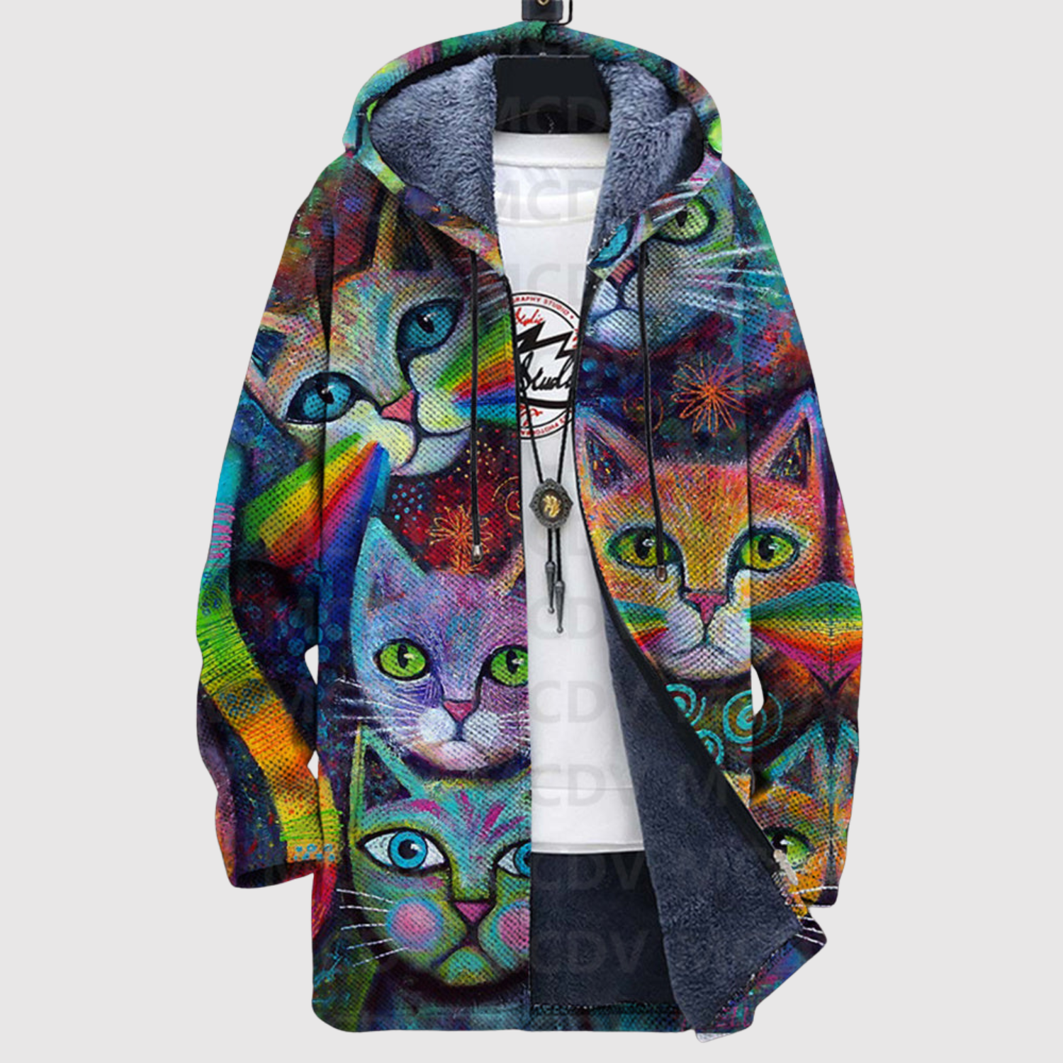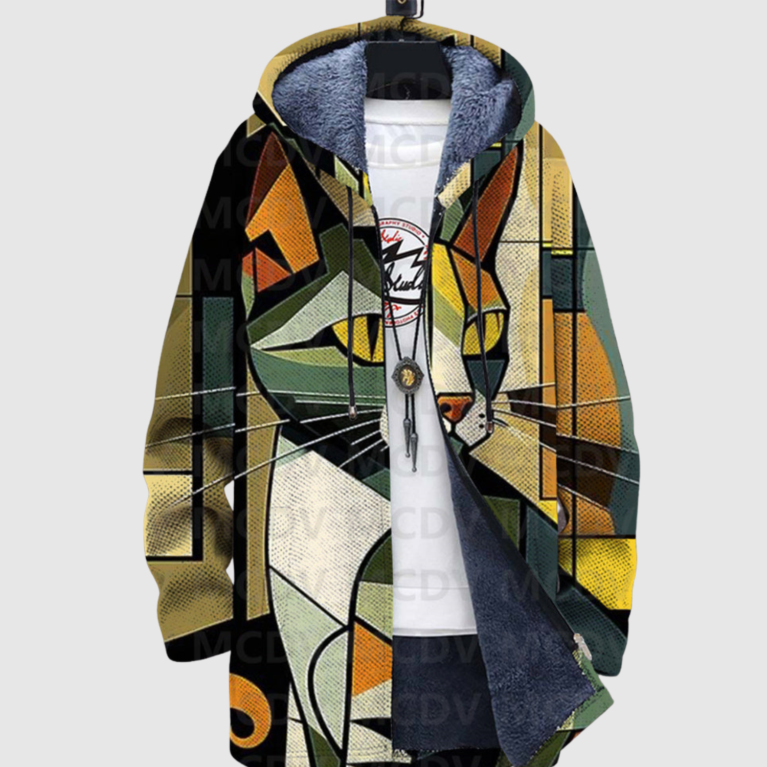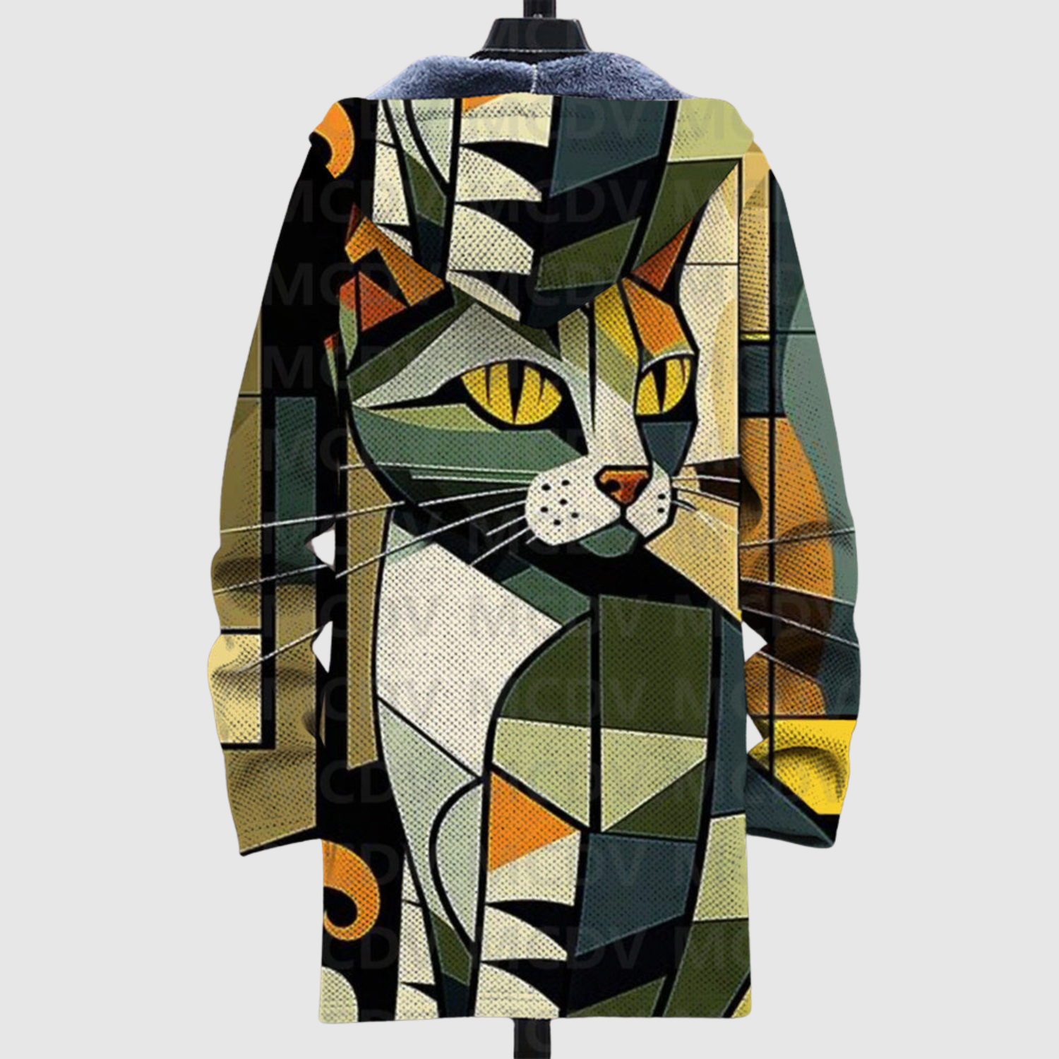 Тази худи комбинира геометрични форми и елегантни котешки мотиви в стилен дизайн. Топлите златисти и бежови тонове придават изискан вид, докато мекото материал осигурява максимален комфорт.