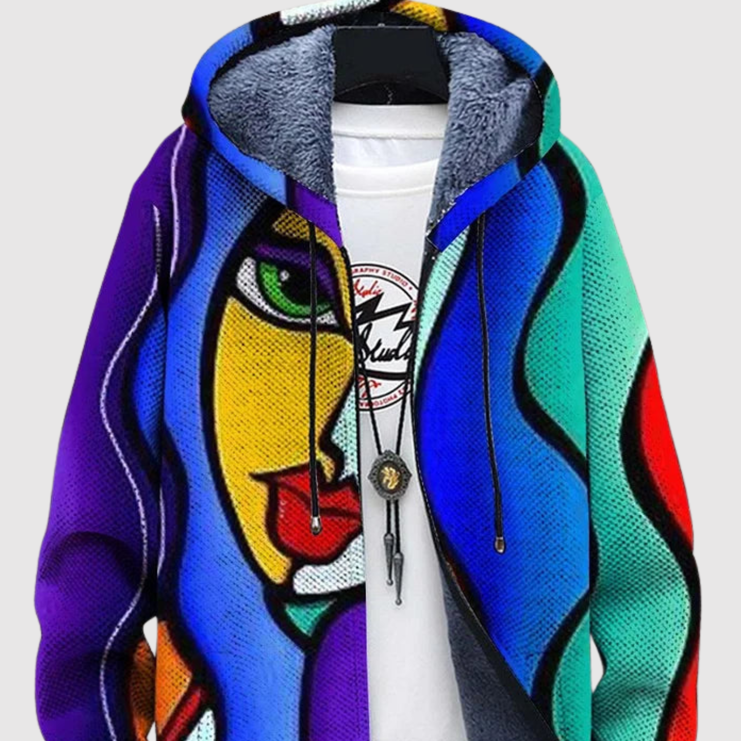 Тази худи комбинира силни цветове и артистични форми в абстрактно лицево изображение, което излъчва личност и свобода. Меката, топла подплата я прави перфектна за ежедневие и спокойни моменти с стил.