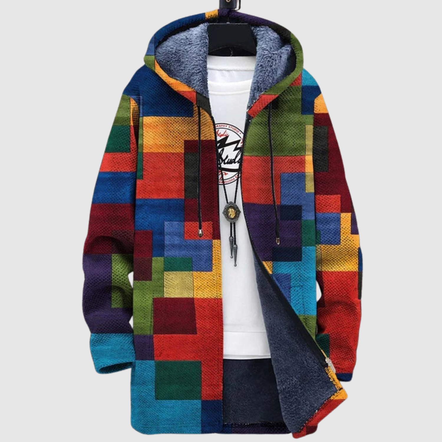 Тази худи съчетава живи цветове и графични форми в игрив дизайн. Мекото материало осигурява комфорт, докато геометричните шарки придават смел и креативен вид – перфектно за теб, който обичаш да се открояваш.