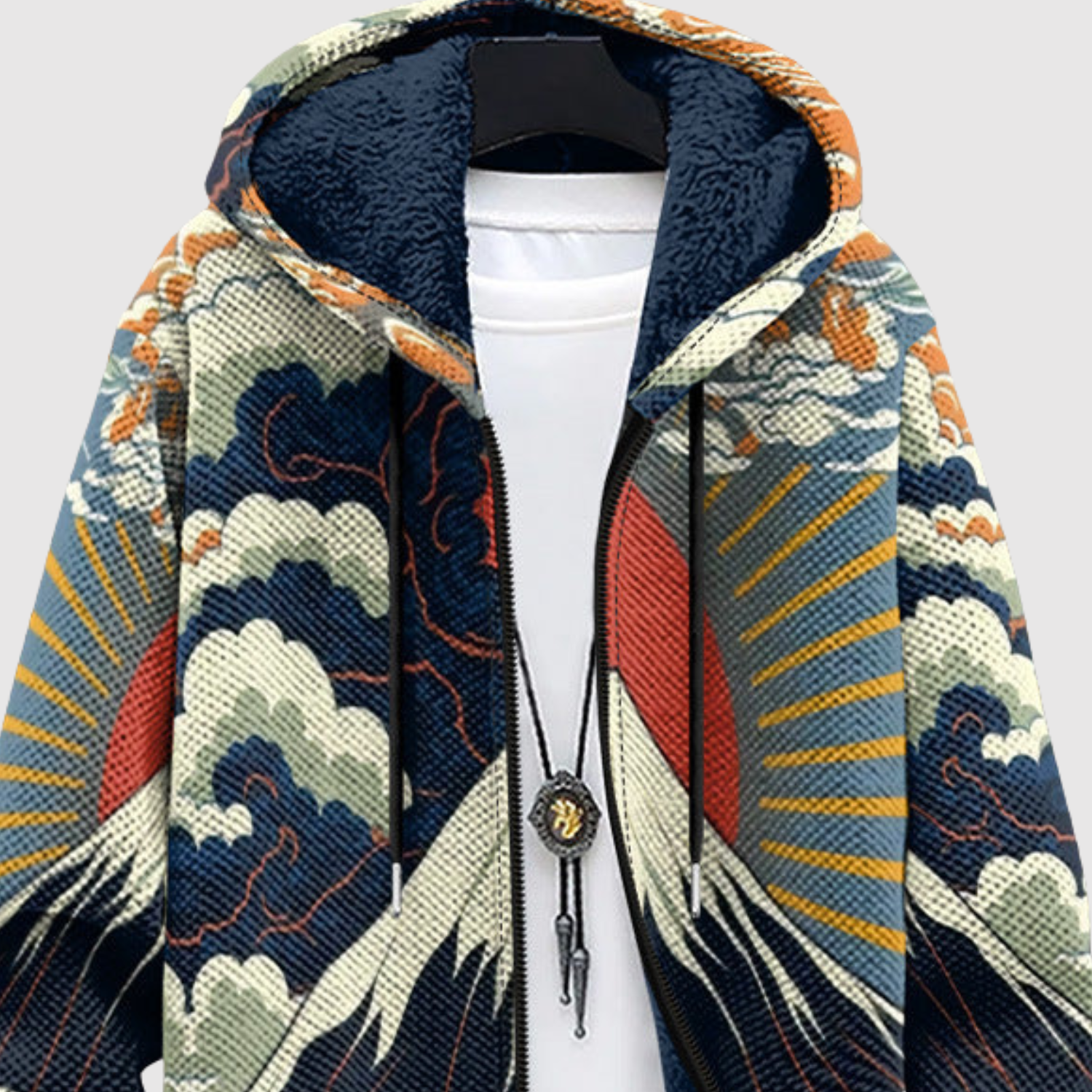 Тази худи е вдъхновена от традиционни японски пейзажи и комбинира вълни, планини и цветя в завладяващ дизайн. Топлата подплата и богатите цветове я правят едновременно елегантна и релаксираща – истинско изявление за стил.