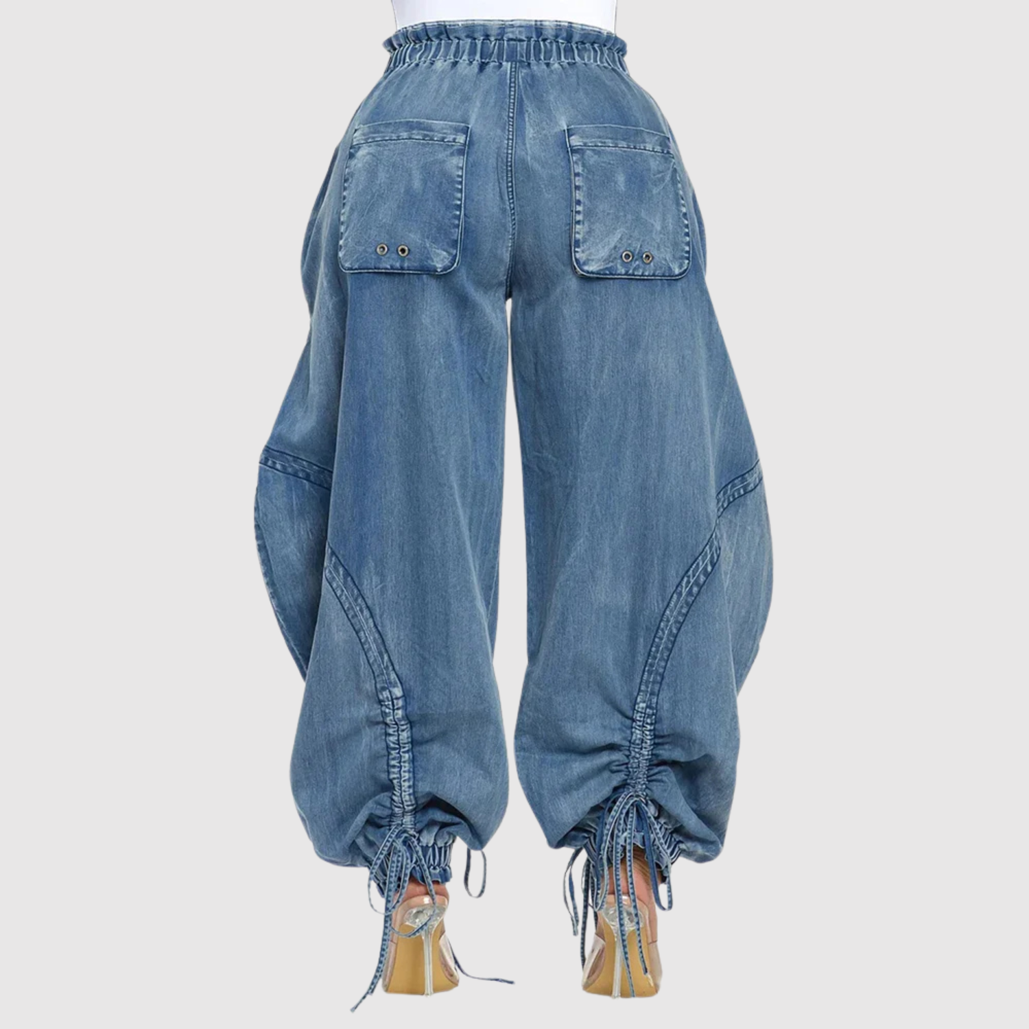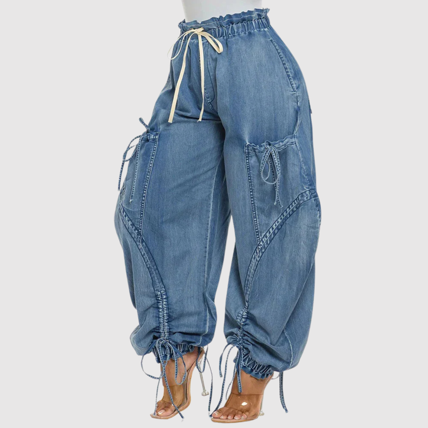 Тези багги дънки предлагат неформален и модерен вид. Връзките добавят уникален акцент, докато кройката остава удобна и практична.