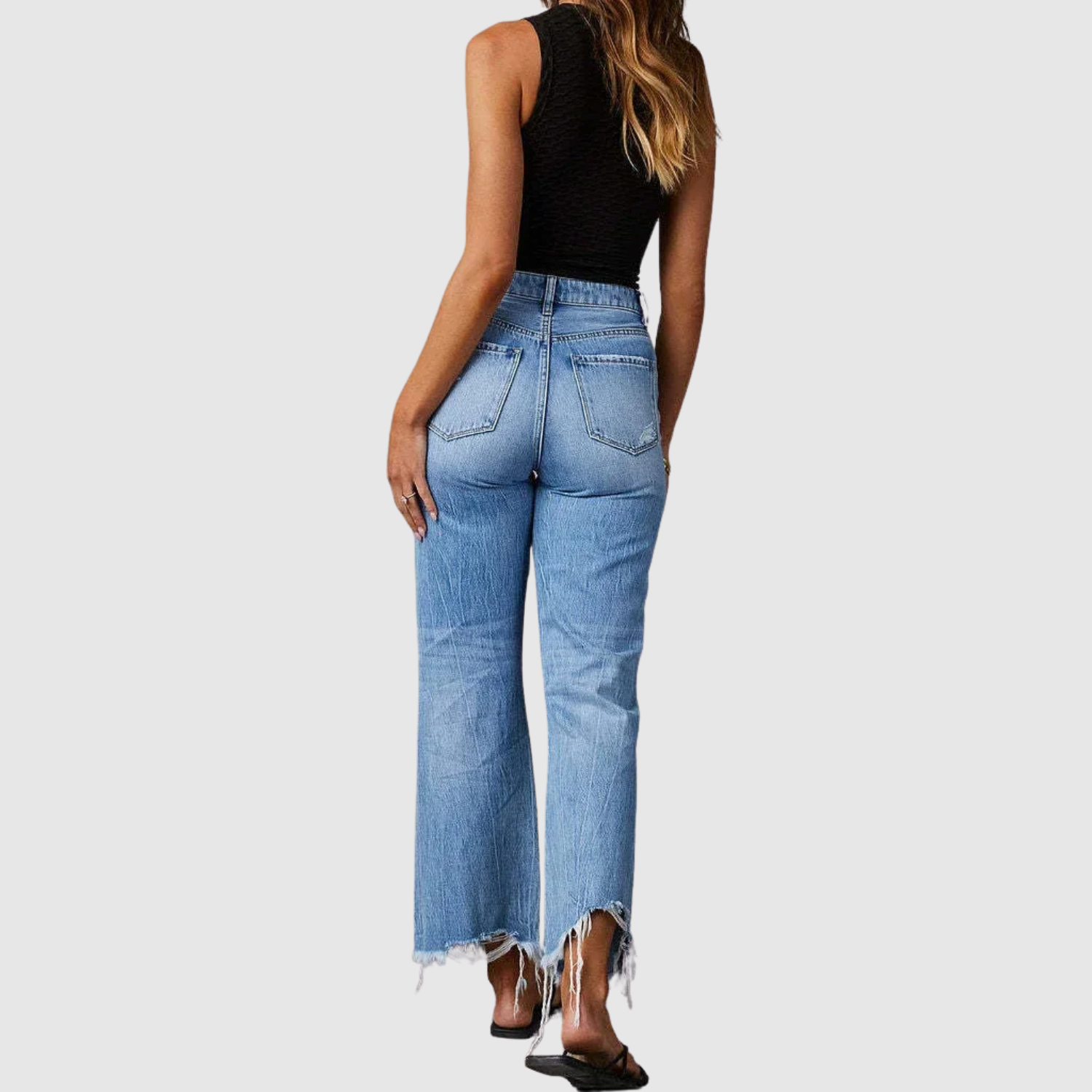Тези дънки съчетават небрежен вид с модерен флейр. Суровите ръбове придават edgy стил, перфектен за както за casual аутфити, така и за по-стилни комбинации.