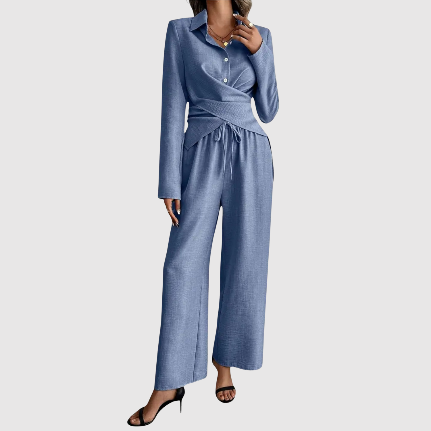 Двуделен комплект, състоящ се от завързваща се блуза и съвпадащи панталони, който комбинира стил и комфорт. Материята пада красиво и придава ласкателен силует, идеален както за ежедневни, така и за празнични поводи.