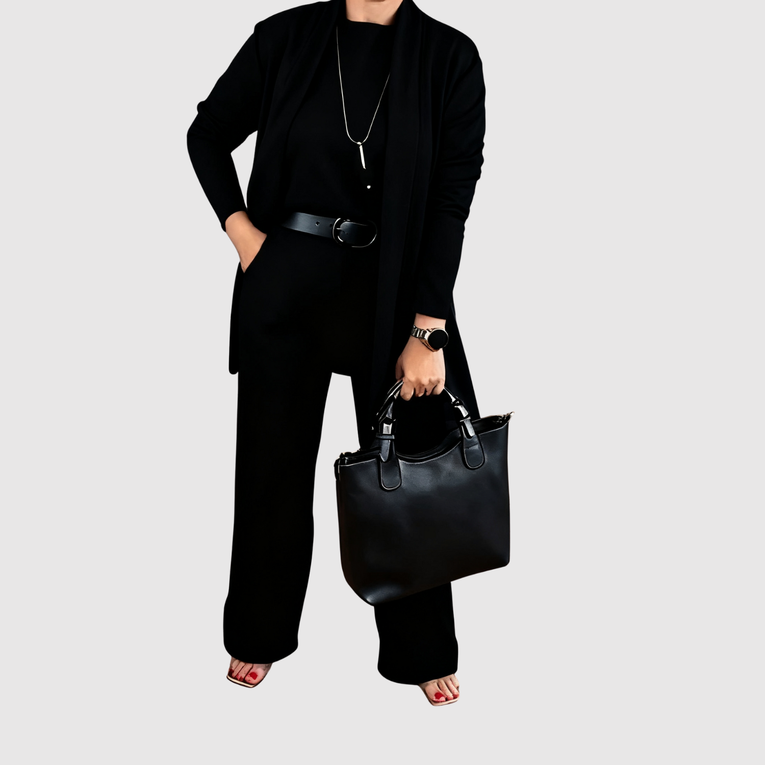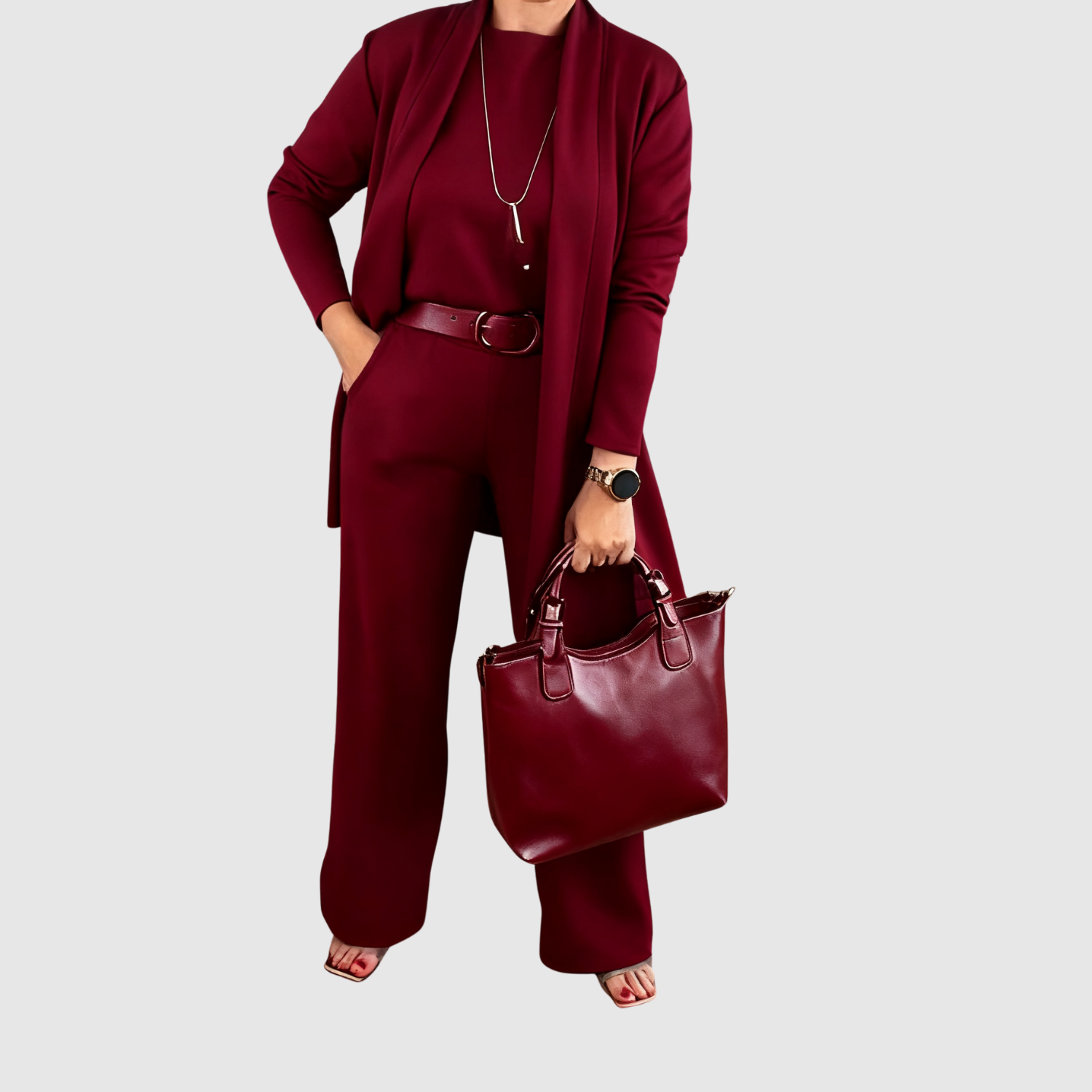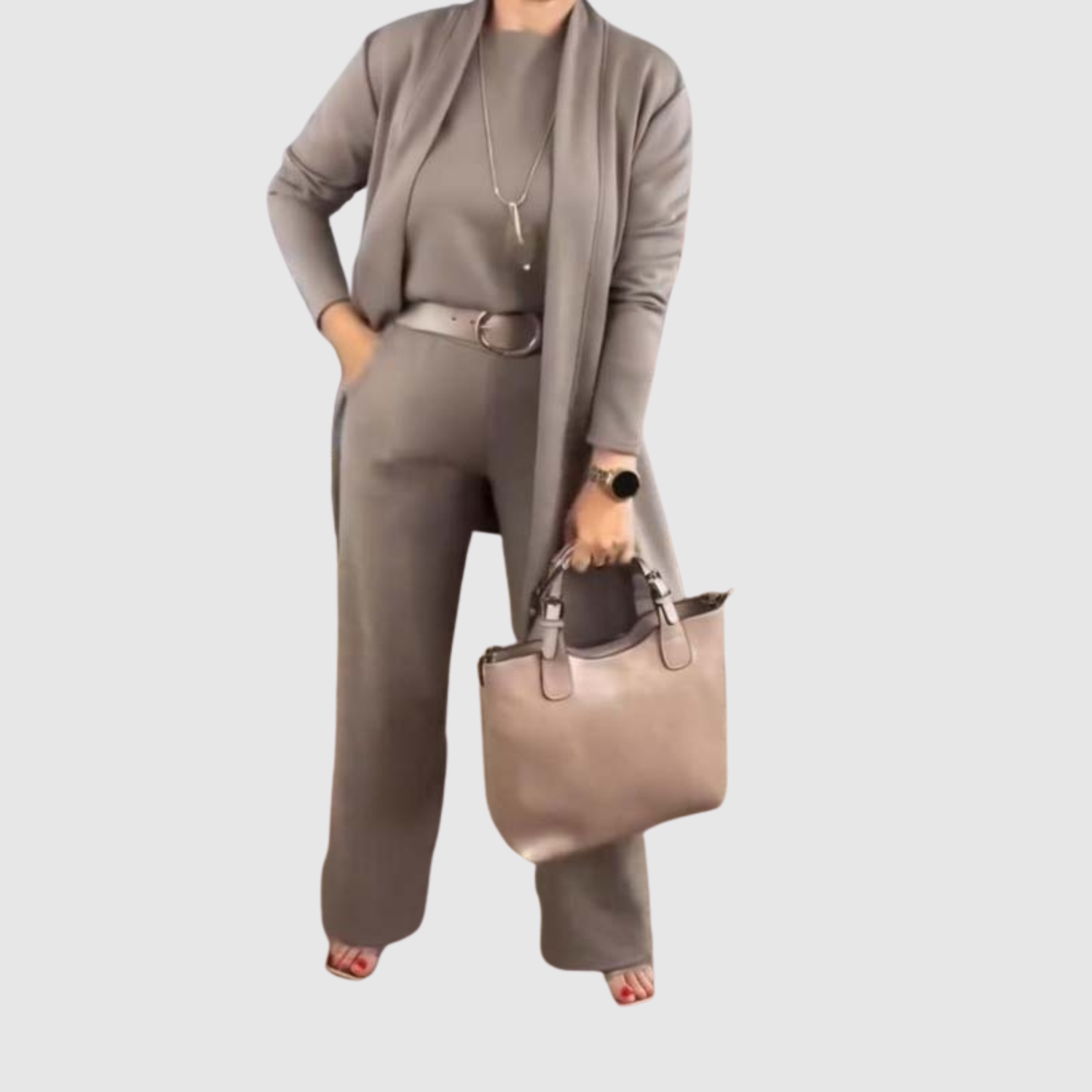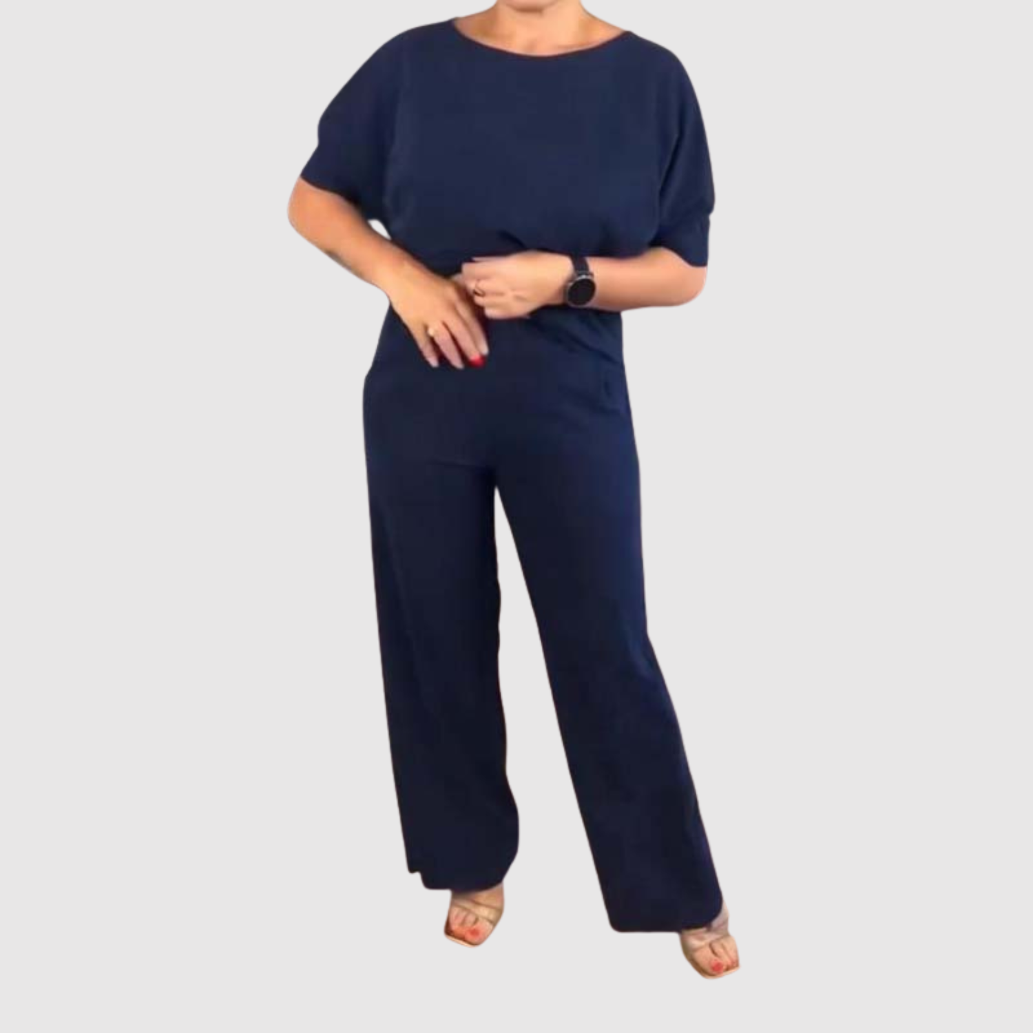 Този елегантен комплект комбинира лека риза с широки панталони за стилен и женствен вид. Перфектен за работа, вечери навън и спокойни дни със стил.