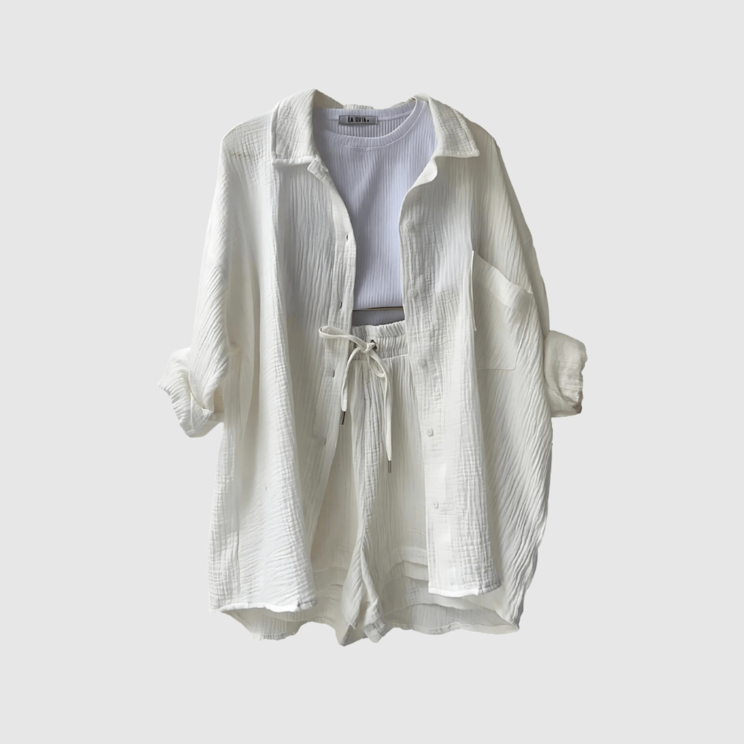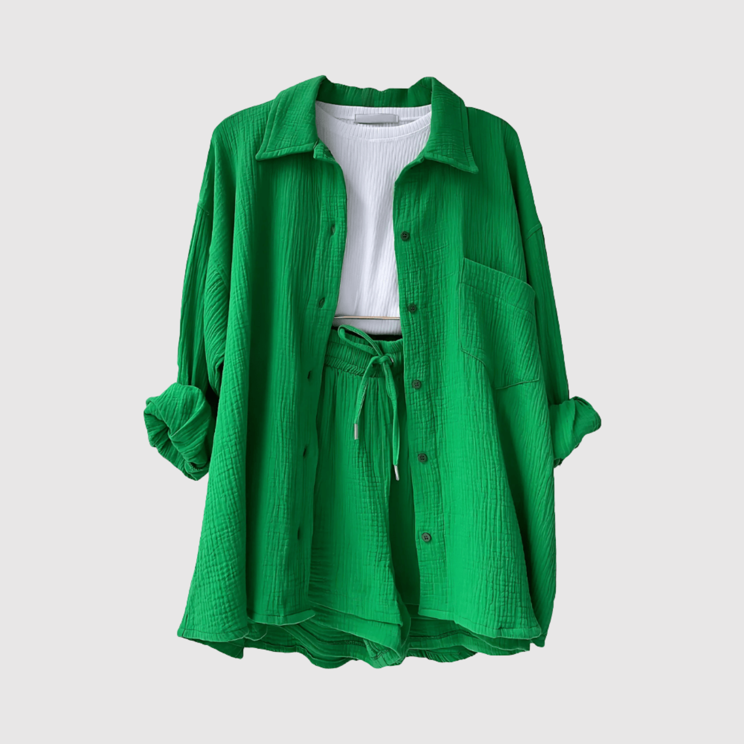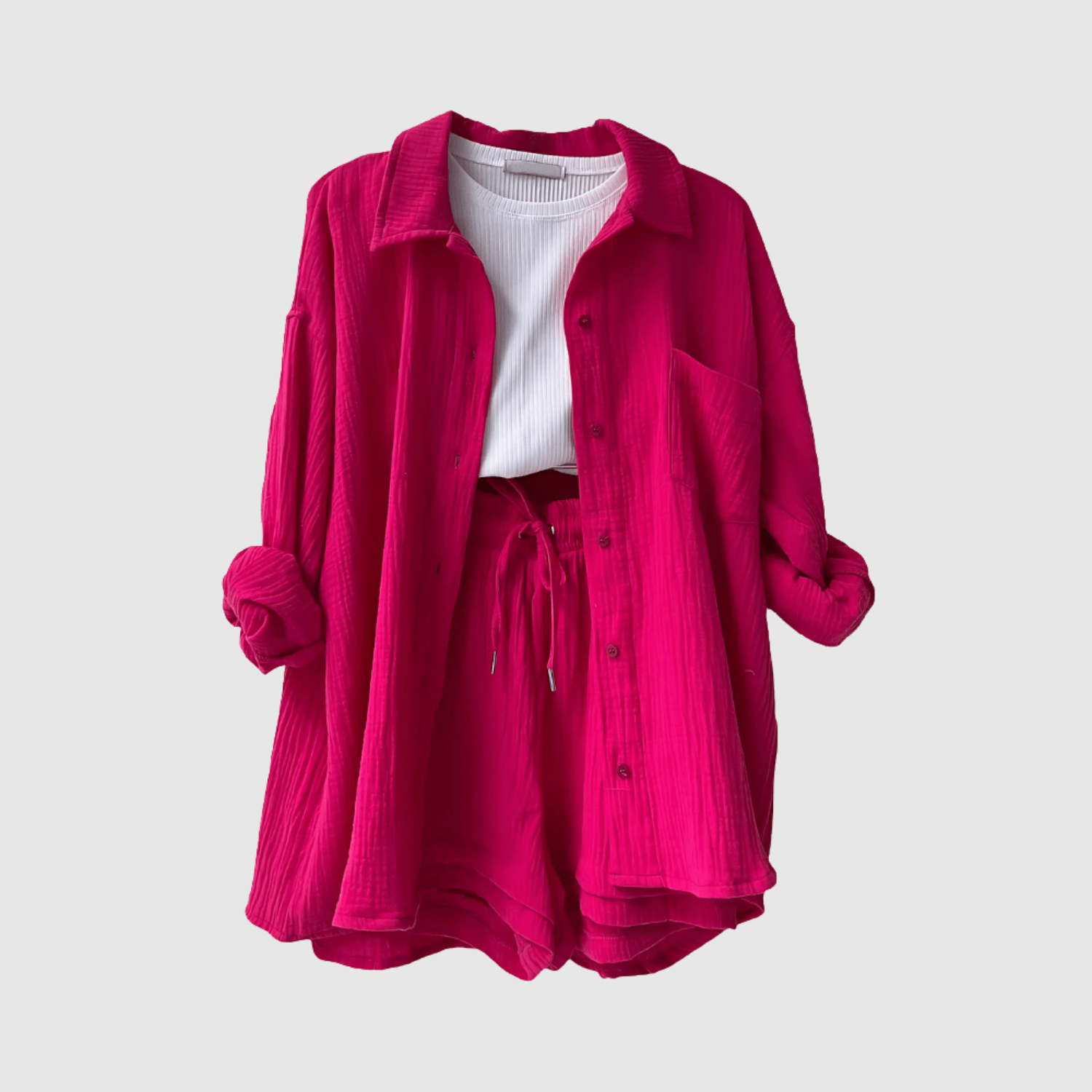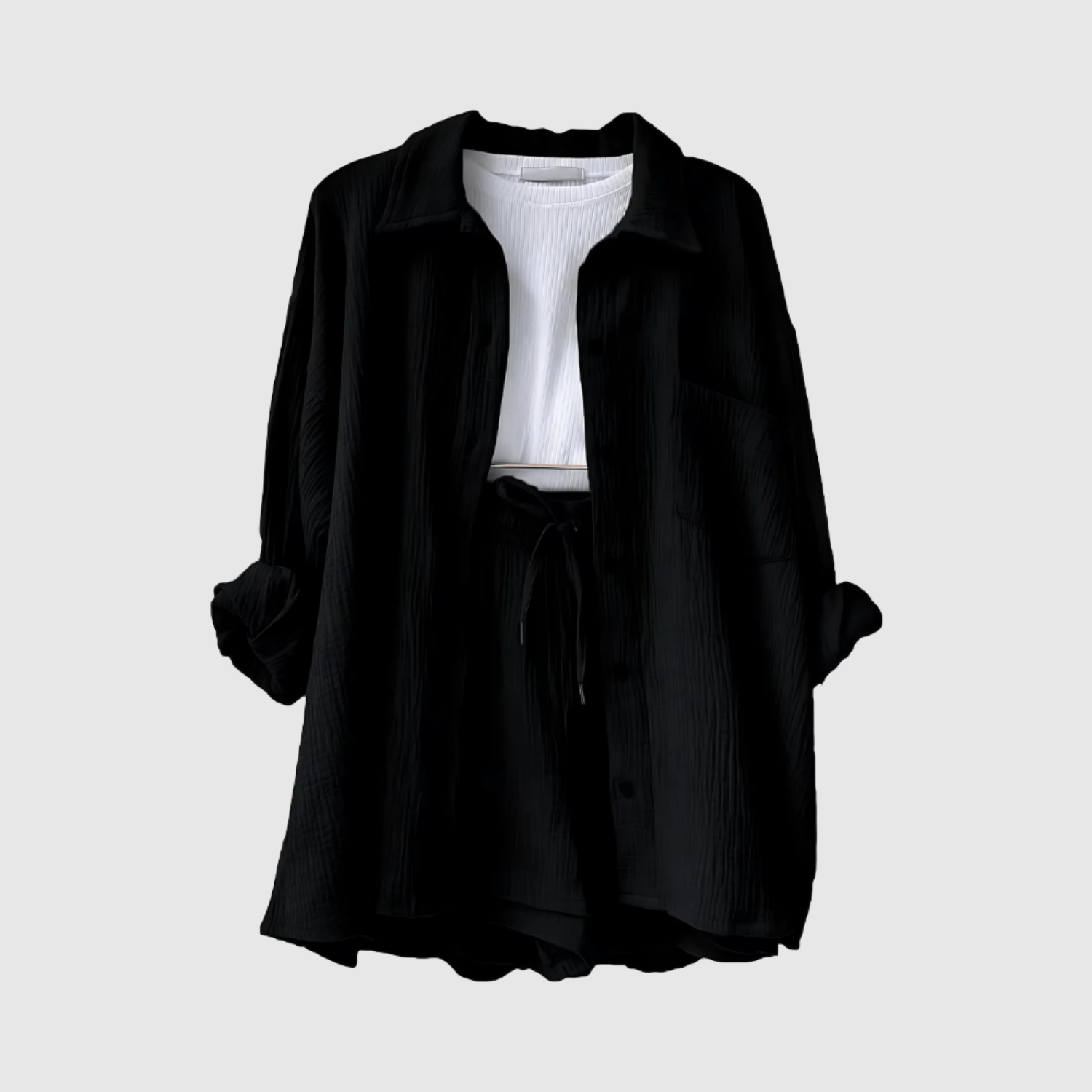 Този комплект комбинира лека риза и съвпадащи шорти, което създава въздушен и модерен вид. Перфектен за горещи дни, когато комфортът и стилът вървят ръка за ръка. Многофункционално облекло, което може да се носи както за всеки ден, така и за ваканция.