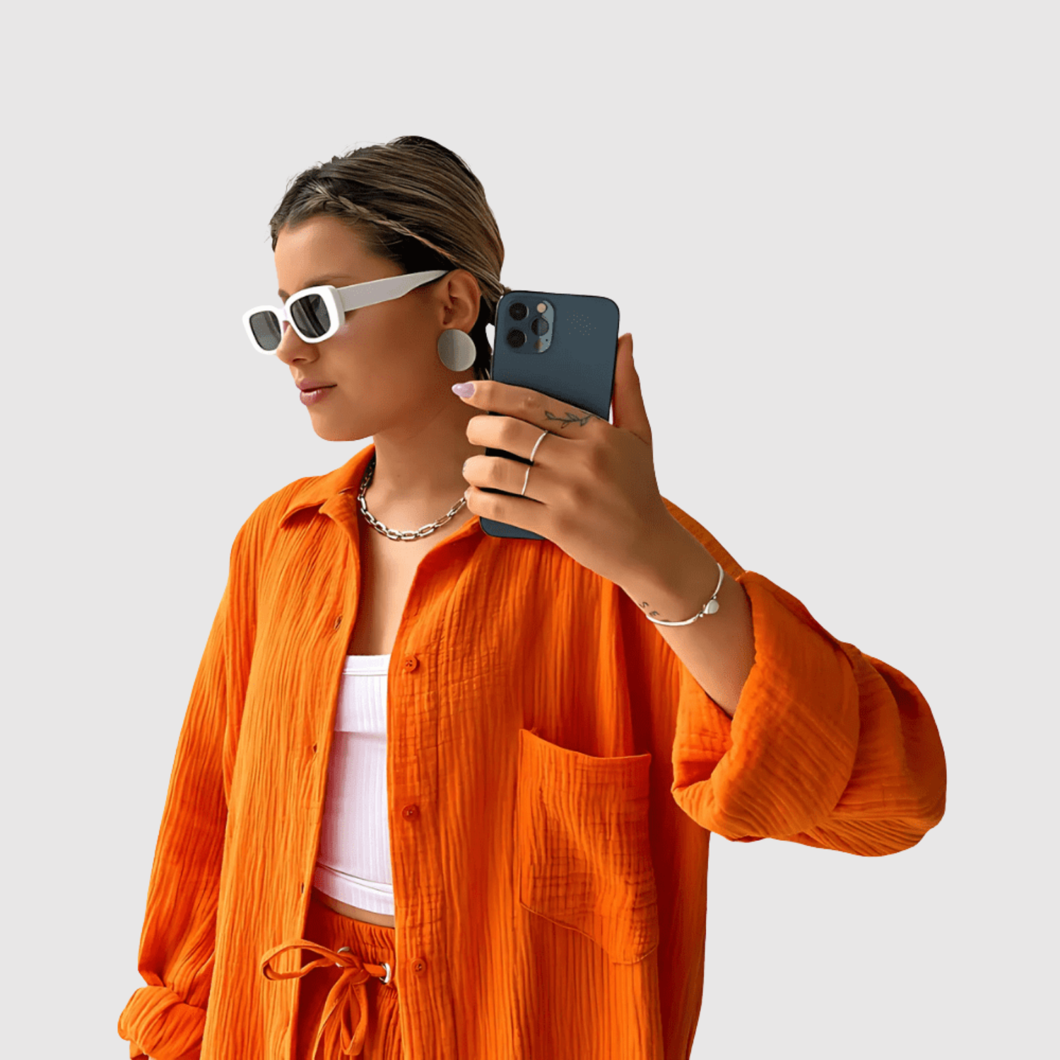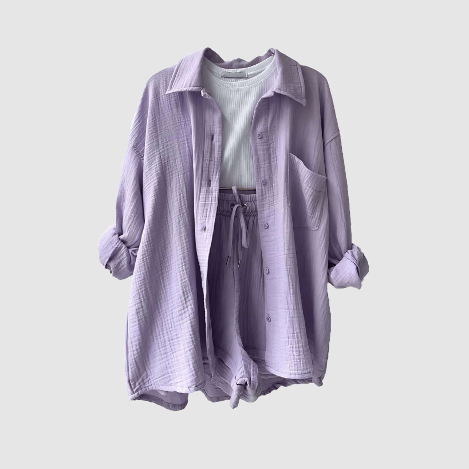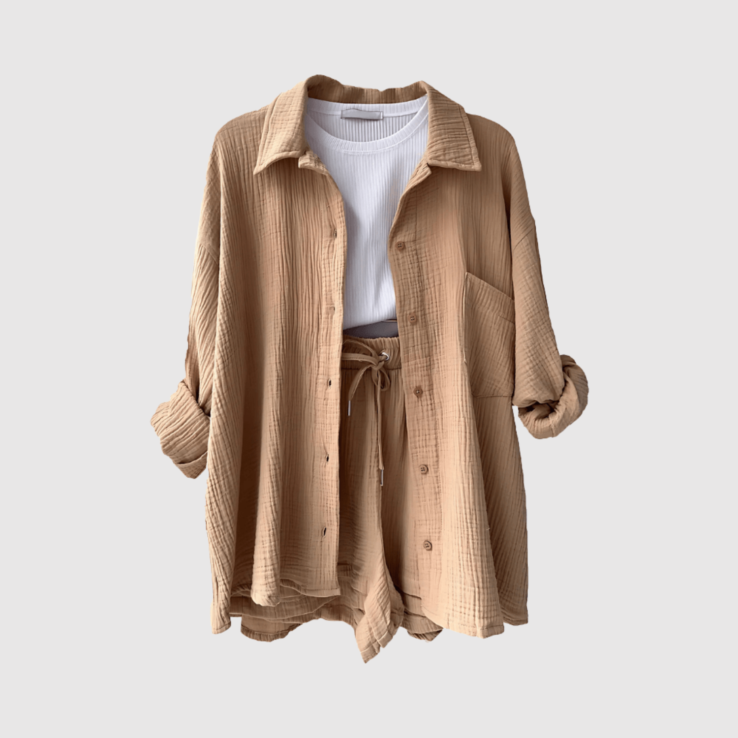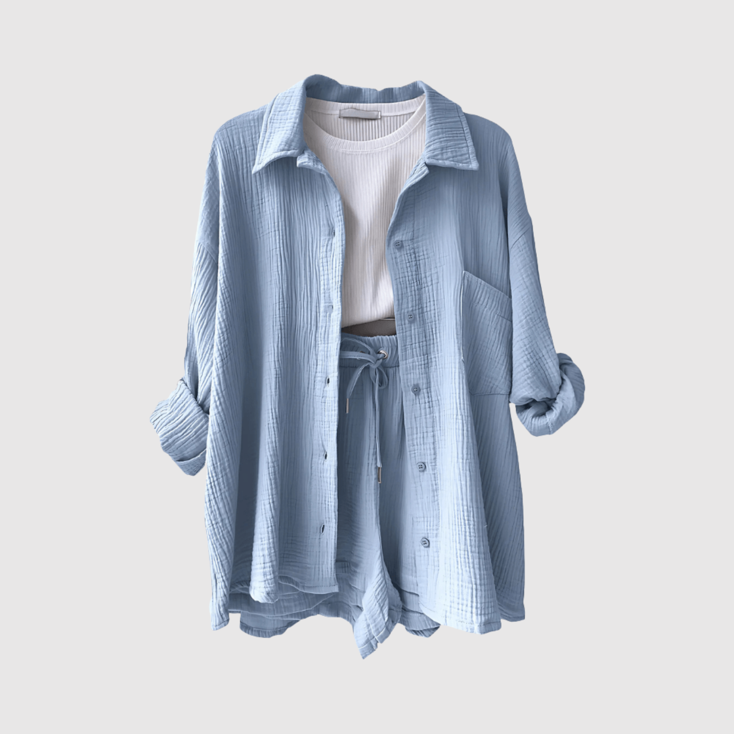 Този комплект комбинира лека риза и съвпадащи шорти, което създава въздушен и модерен вид. Перфектен за горещи дни, когато комфортът и стилът вървят ръка за ръка. Многофункционално облекло, което може да се носи както за всеки ден, така и за ваканция.