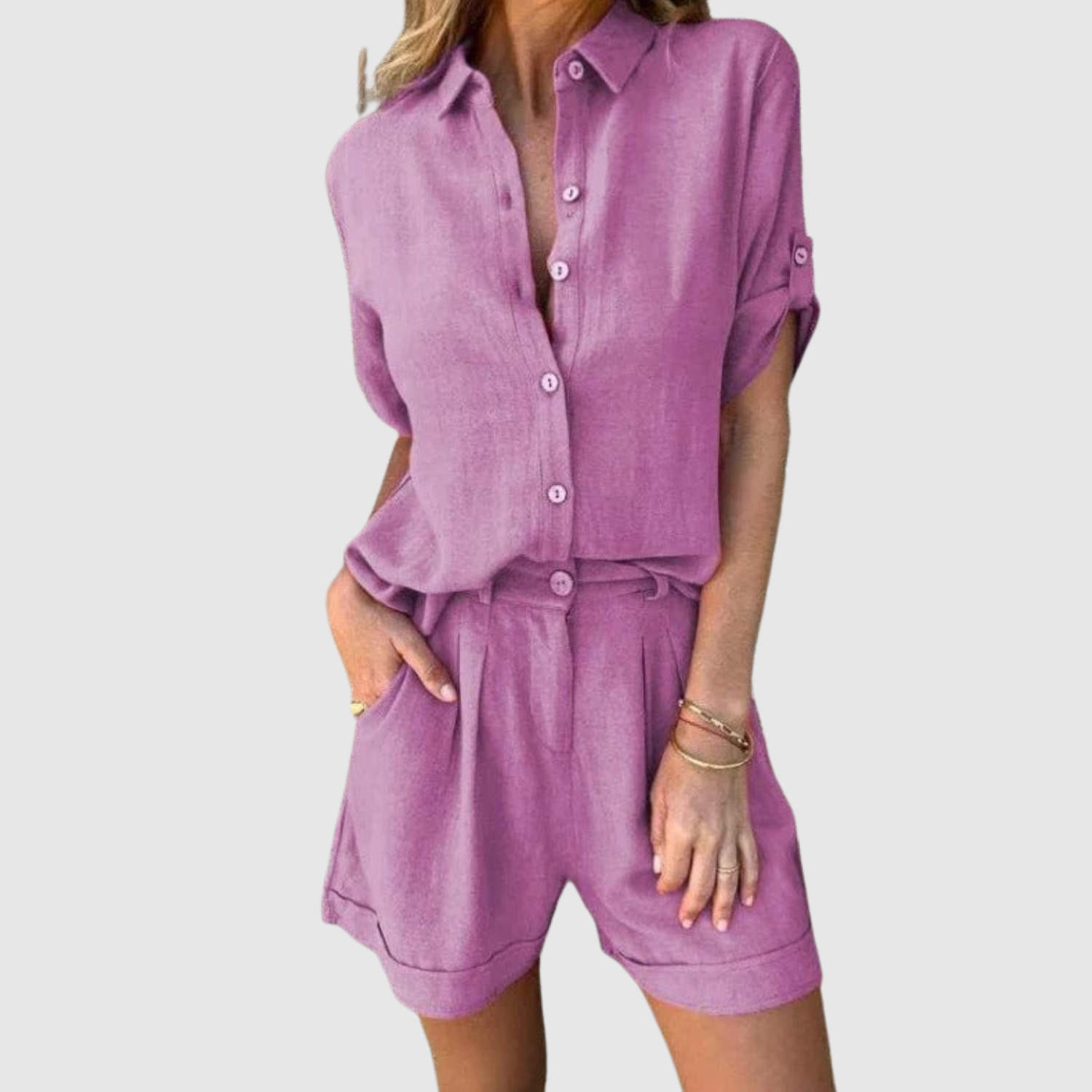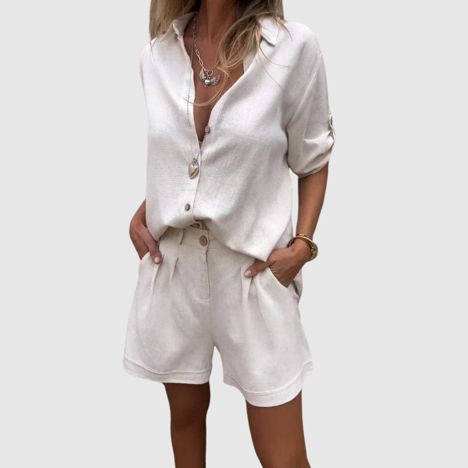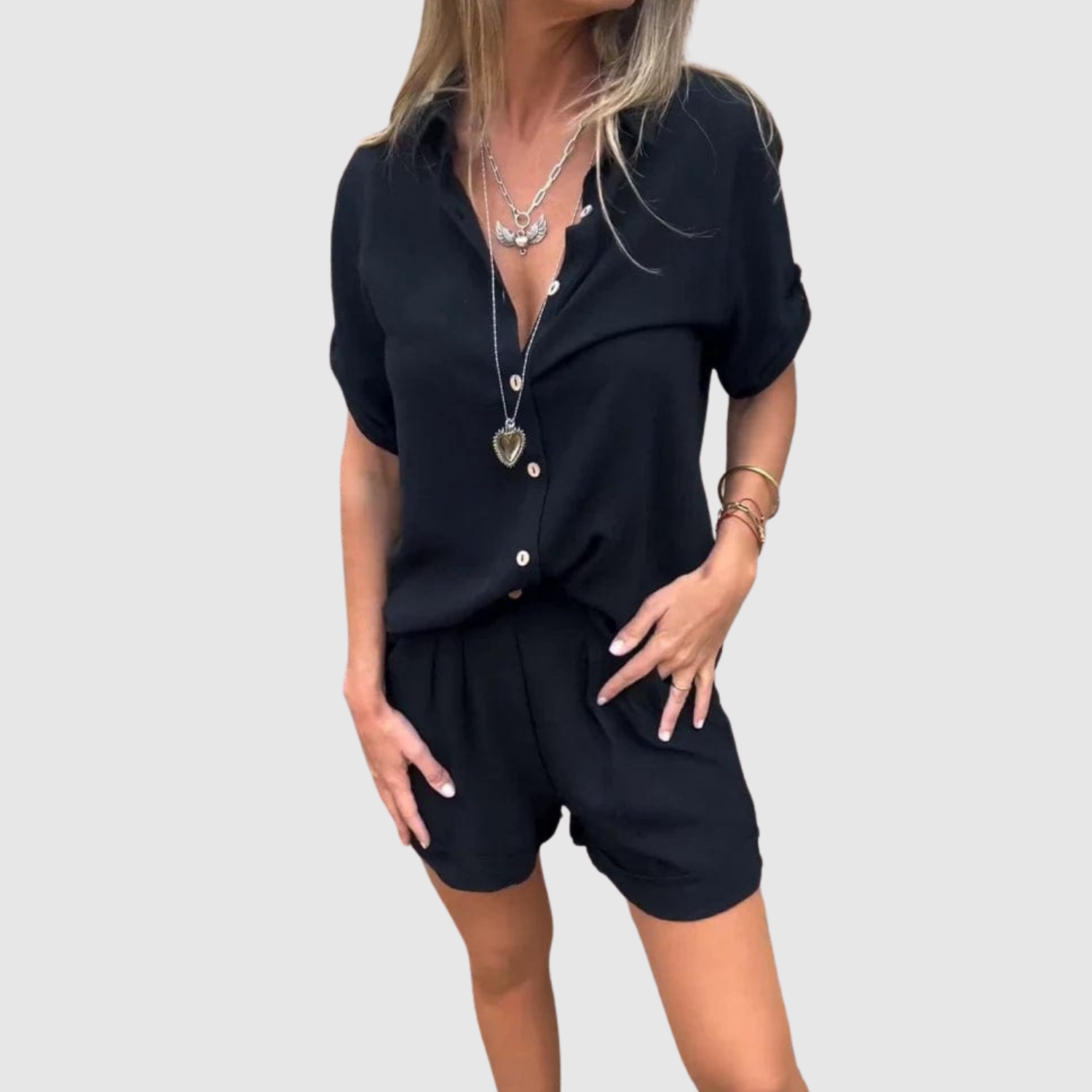 Лек и въздушен комплект, състоящ се от свободно стояща риза и съвпадащи шорти. Проектиран за горещи дни, когато комфортът и стилът вървят ръка за ръка. Перфектен както за плажа, така и за нощен излаз или за релаксиращ ден у дома.