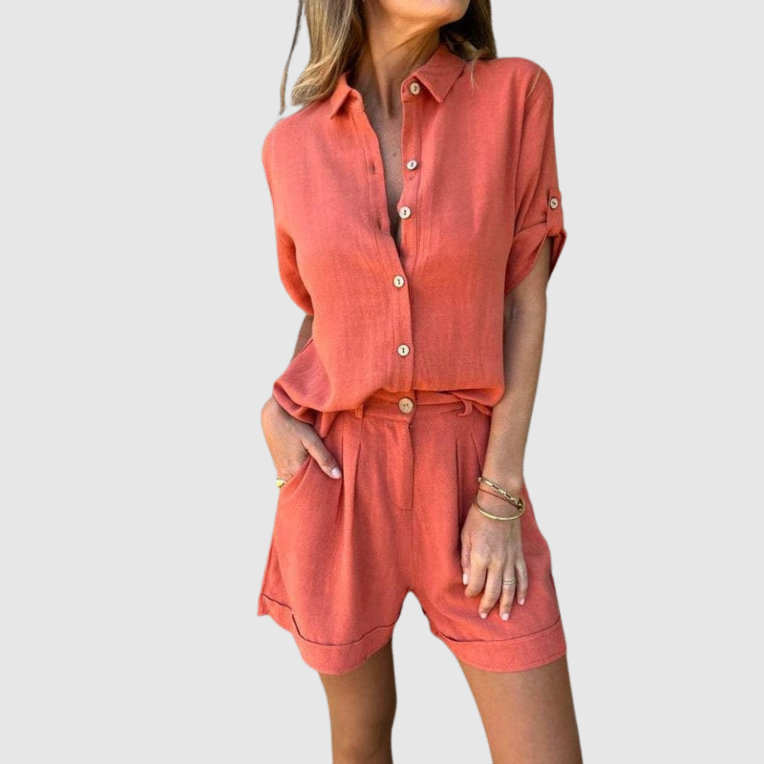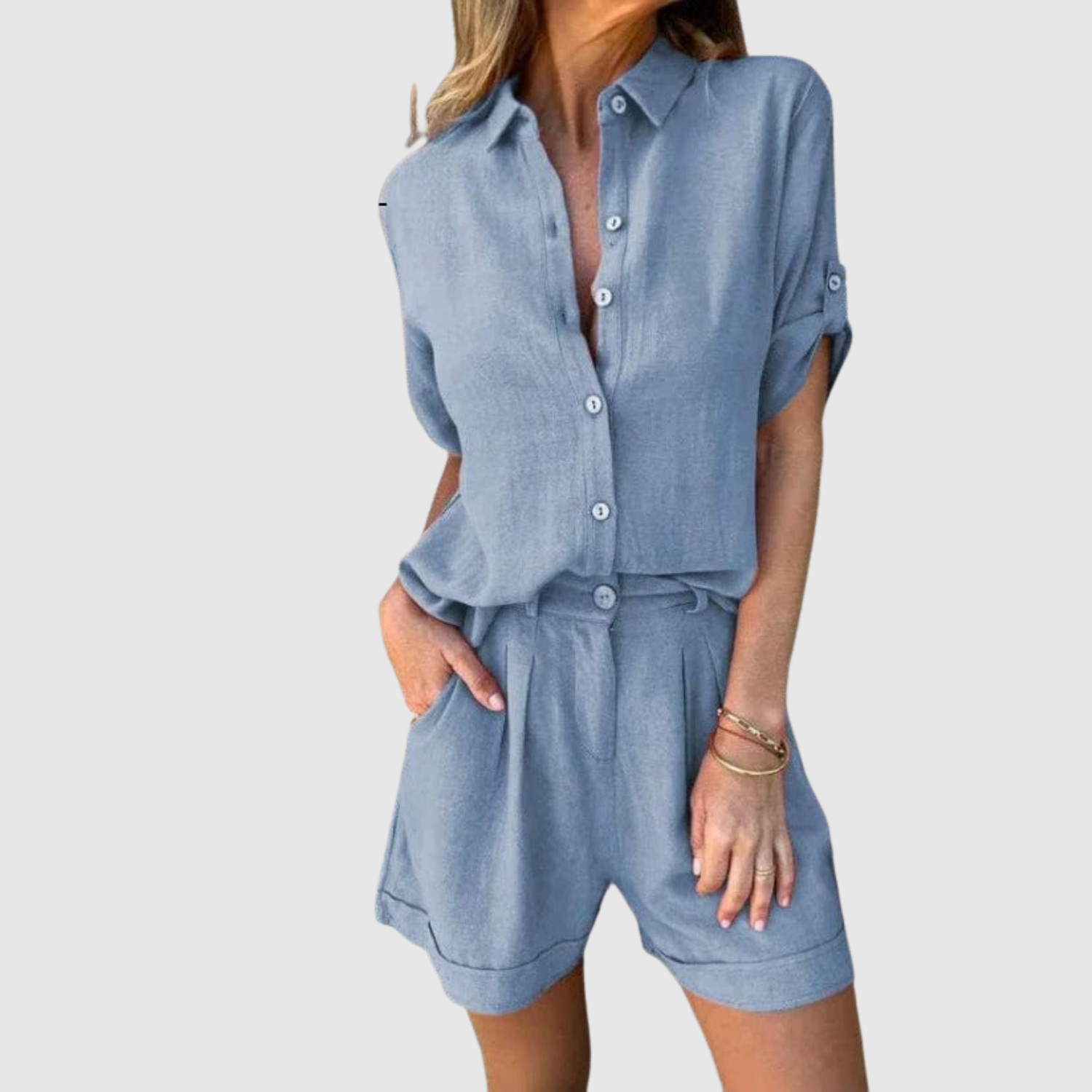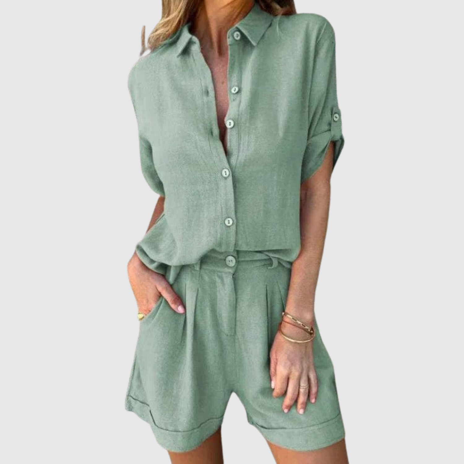 Лек и въздушен комплект, състоящ се от свободно стояща риза и съвпадащи шорти. Проектиран за горещи дни, когато комфортът и стилът вървят ръка за ръка. Перфектен както за плажа, така и за нощен излаз или за релаксиращ ден у дома.