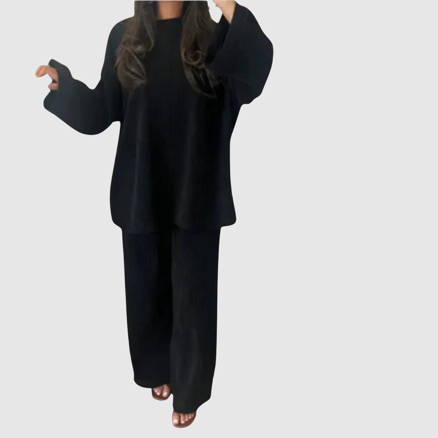 Модерен комплект с свободна кройка, състоящ се от овърсайз блуза и съответстващи панталони. Материалът пада естествено и придава както изискан, така и неформален вид. Идеален за ежедневна употреба, пътувания или уютни вечери.