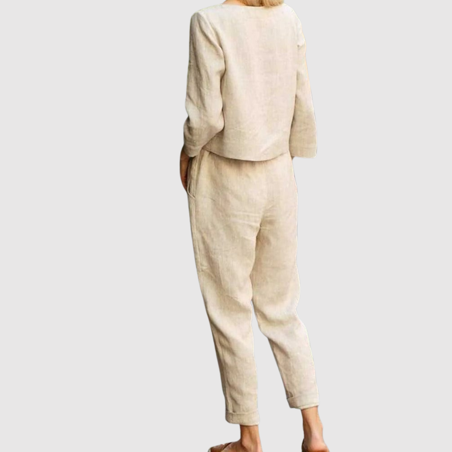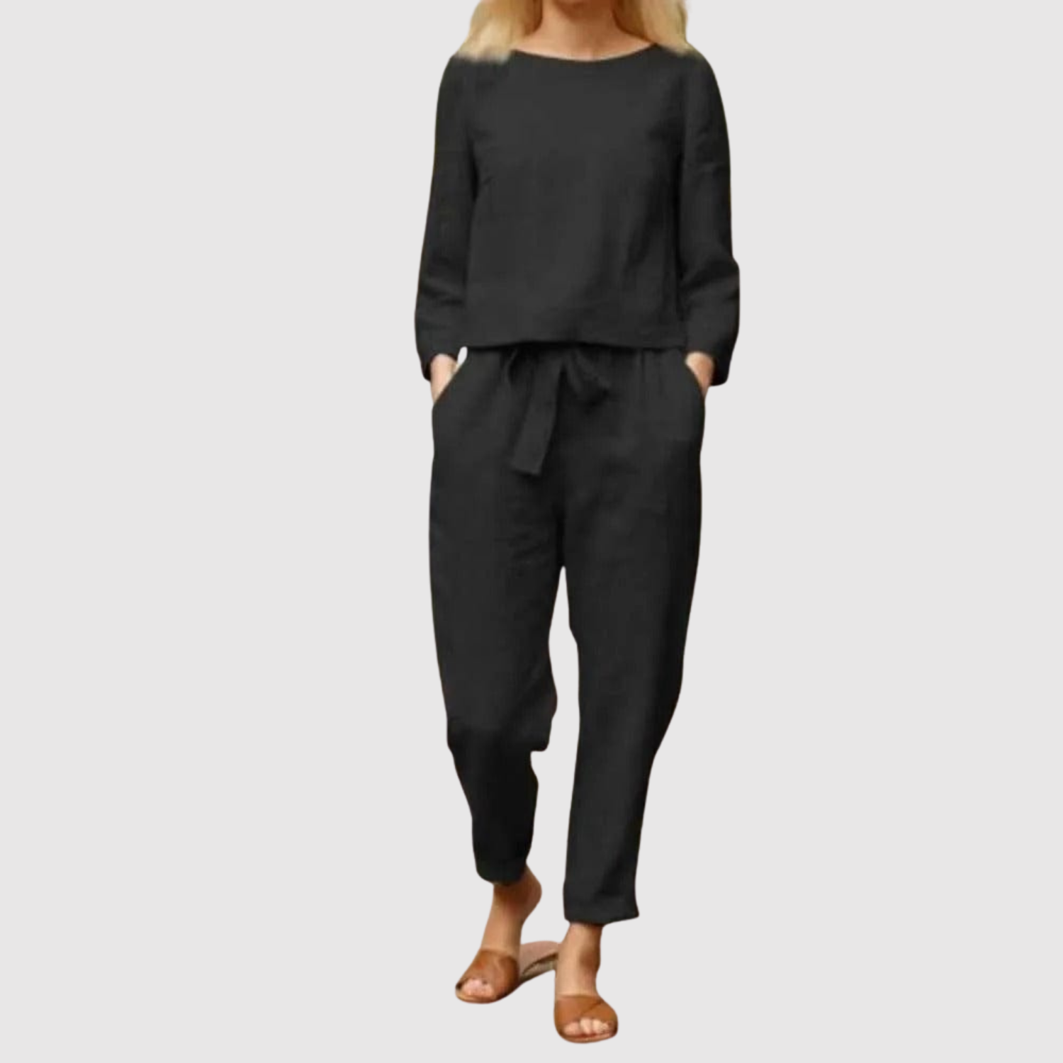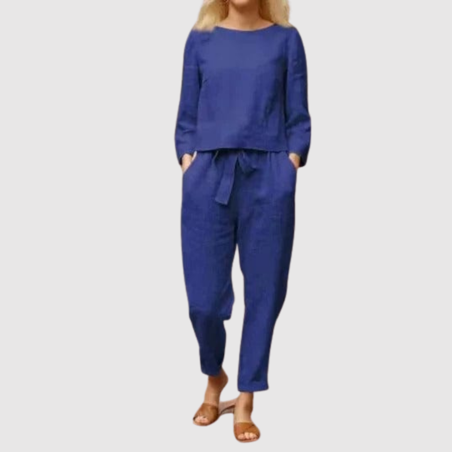 Вечен комплект, състоящ се от дълги панталони и съвпадаща блуза с удобен силует. Идеален за работа, свободно време и пътувания, когато искате баланс между комфорт и елегантност. Материята е лека и дишаща, перфектна за всички сезони.