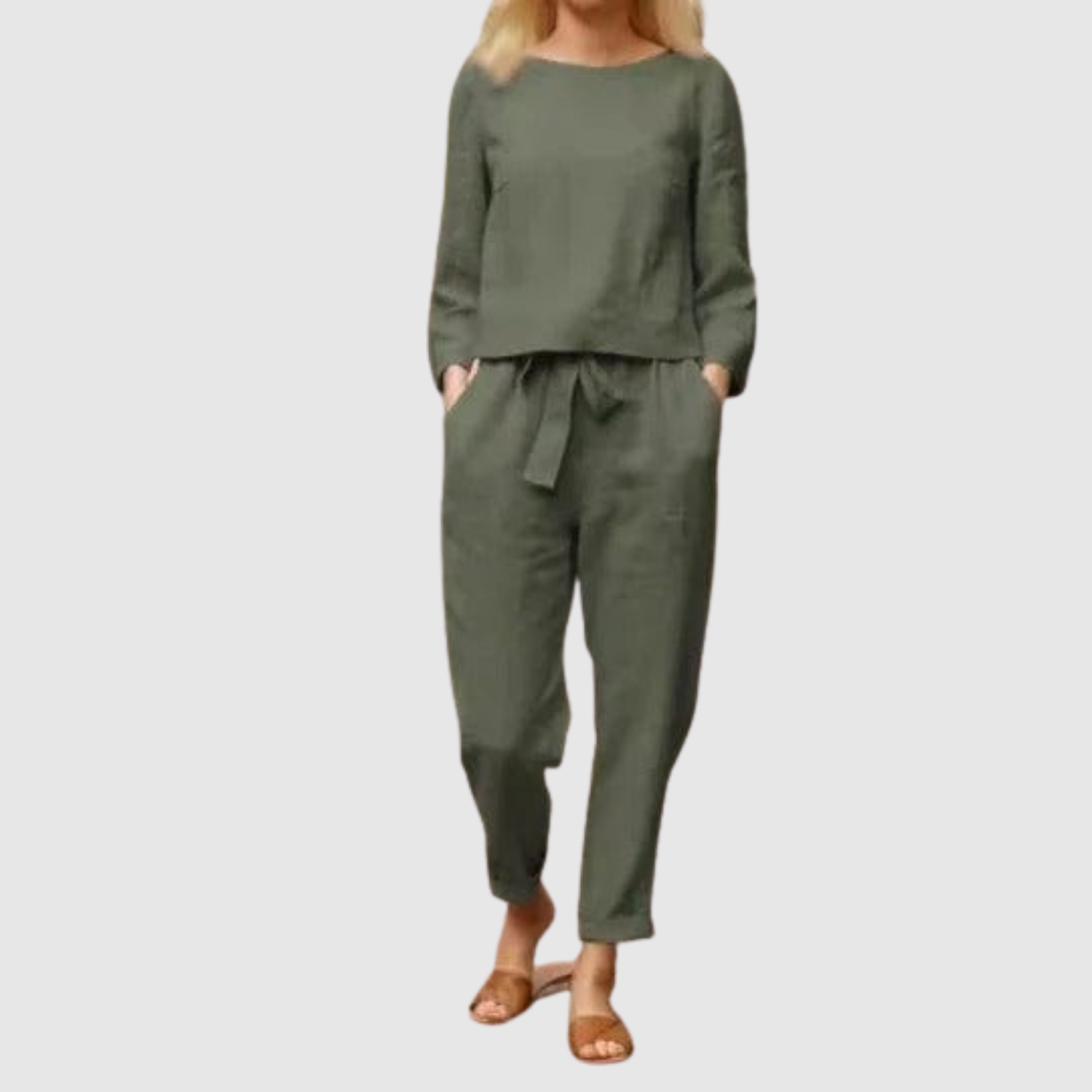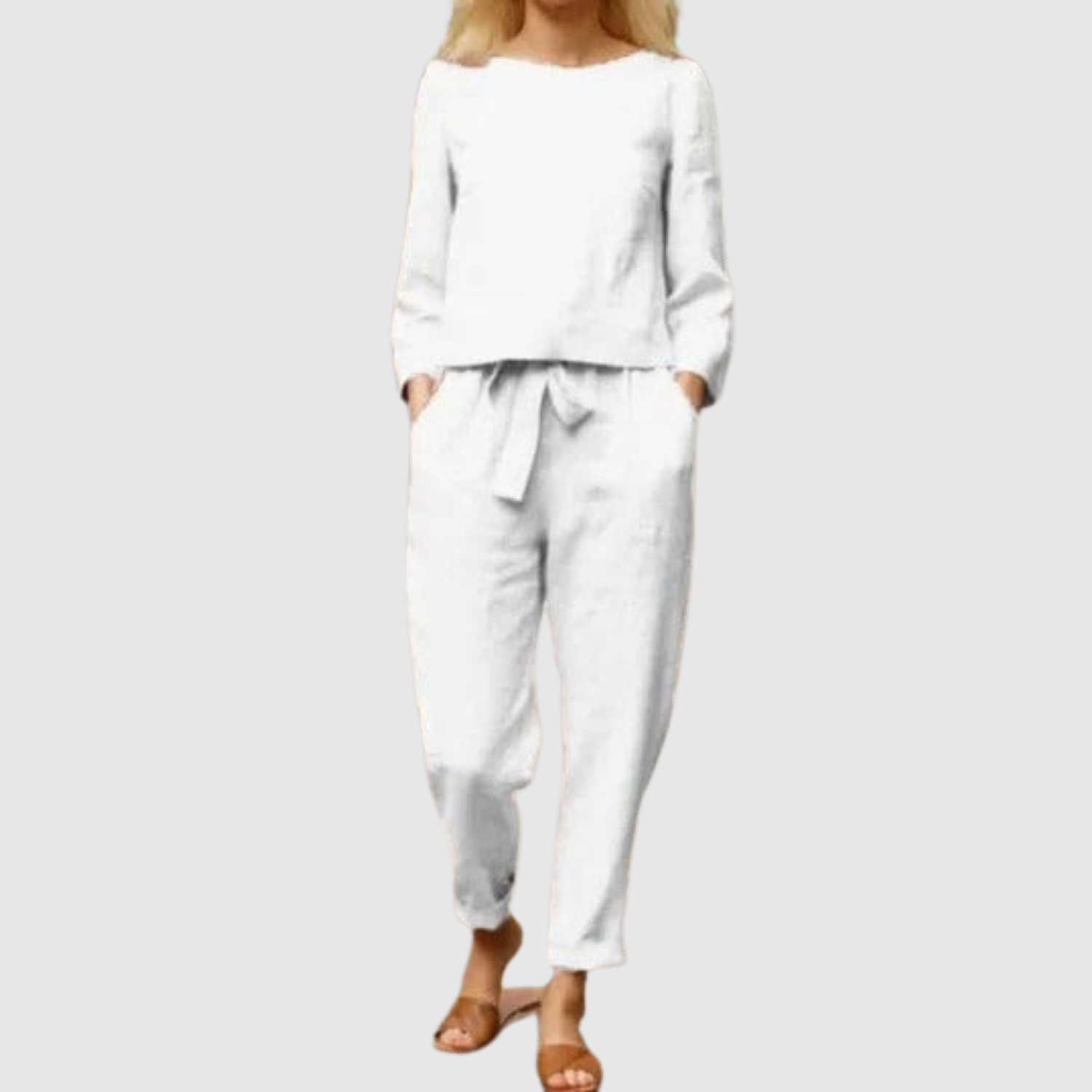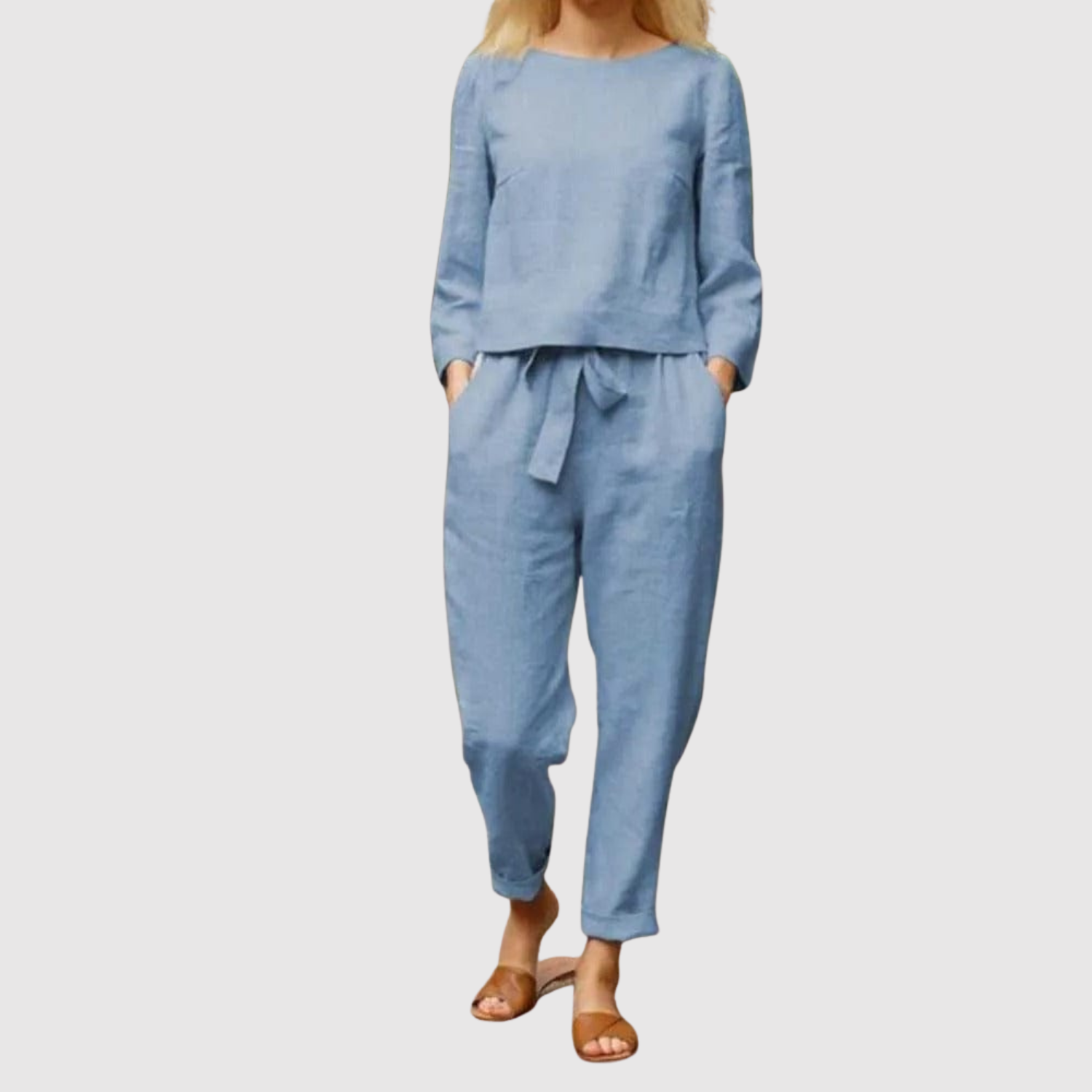 Вечен комплект, състоящ се от дълги панталони и съвпадаща блуза с удобен силует. Идеален за работа, свободно време и пътувания, когато искате баланс между комфорт и елегантност. Материята е лека и дишаща, перфектна за всички сезони.