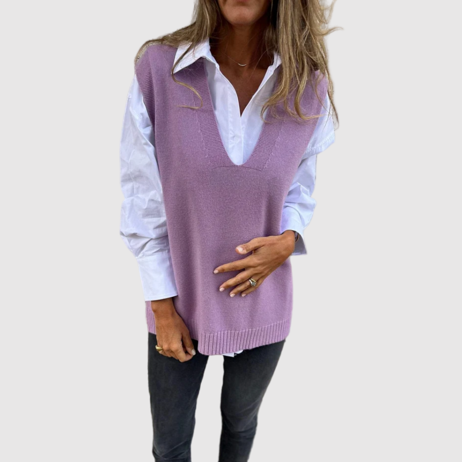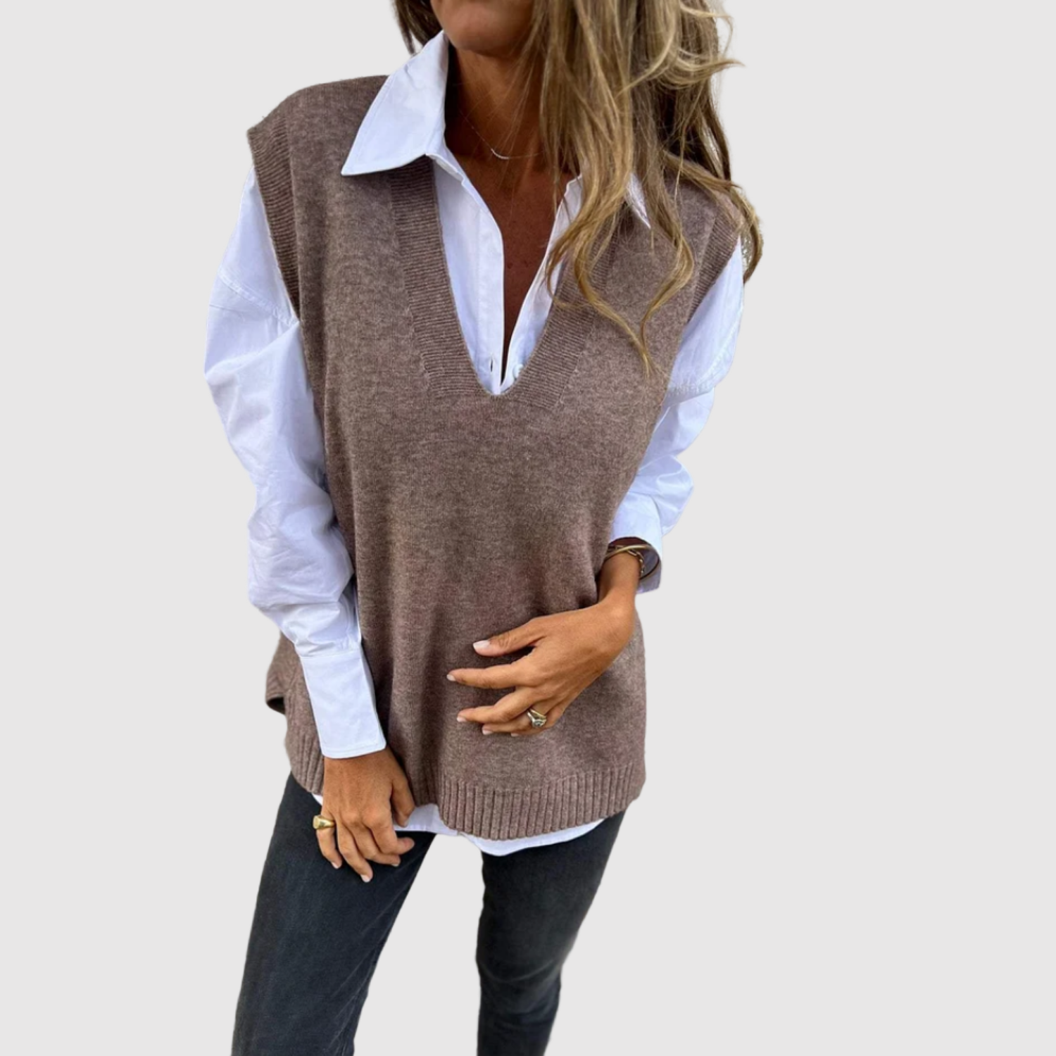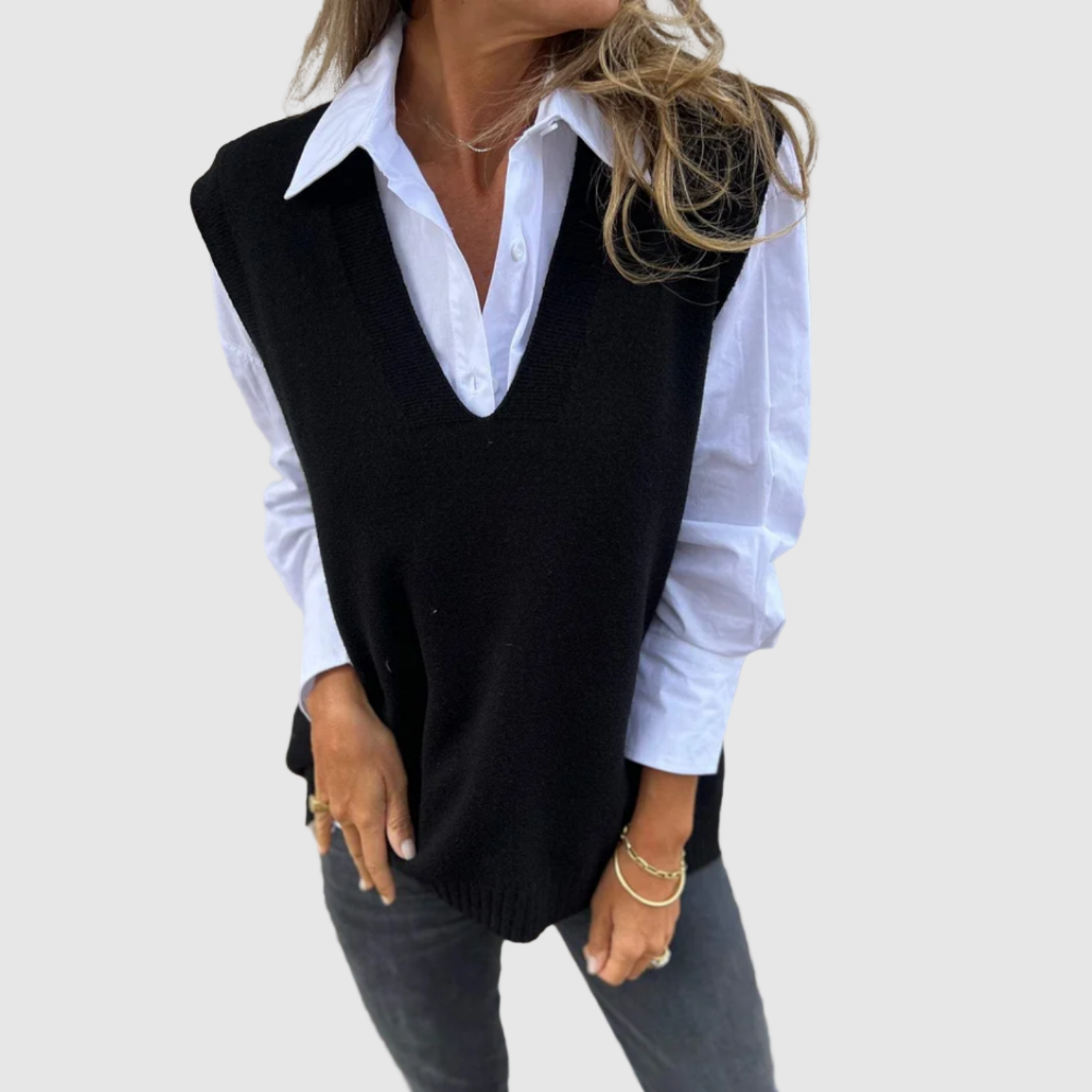 Тази елегантна плетена жилетка комбинира класически дизайн с модерна минималистичност. Мекото качество и V-образното деколте я правят идеална за наслагване върху ризи или рокли. Перфектна както за офиса, така и за неформални делници.