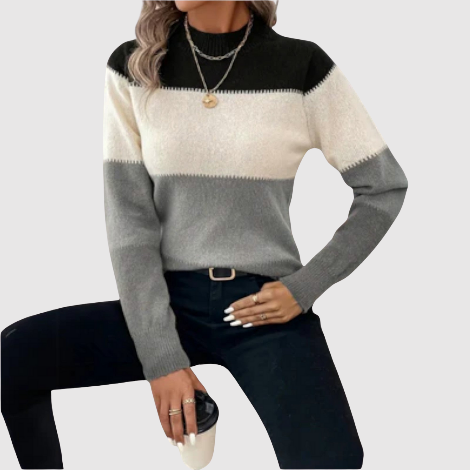 Този пуловер комбинира простота и комфорт с модерно трицветно дизайнерско решение. Мекото качество осигурява удобно прилягане, докато играта на цветове придава стилен и забележим вид. Перфектен за ежедневието и неформални визии.