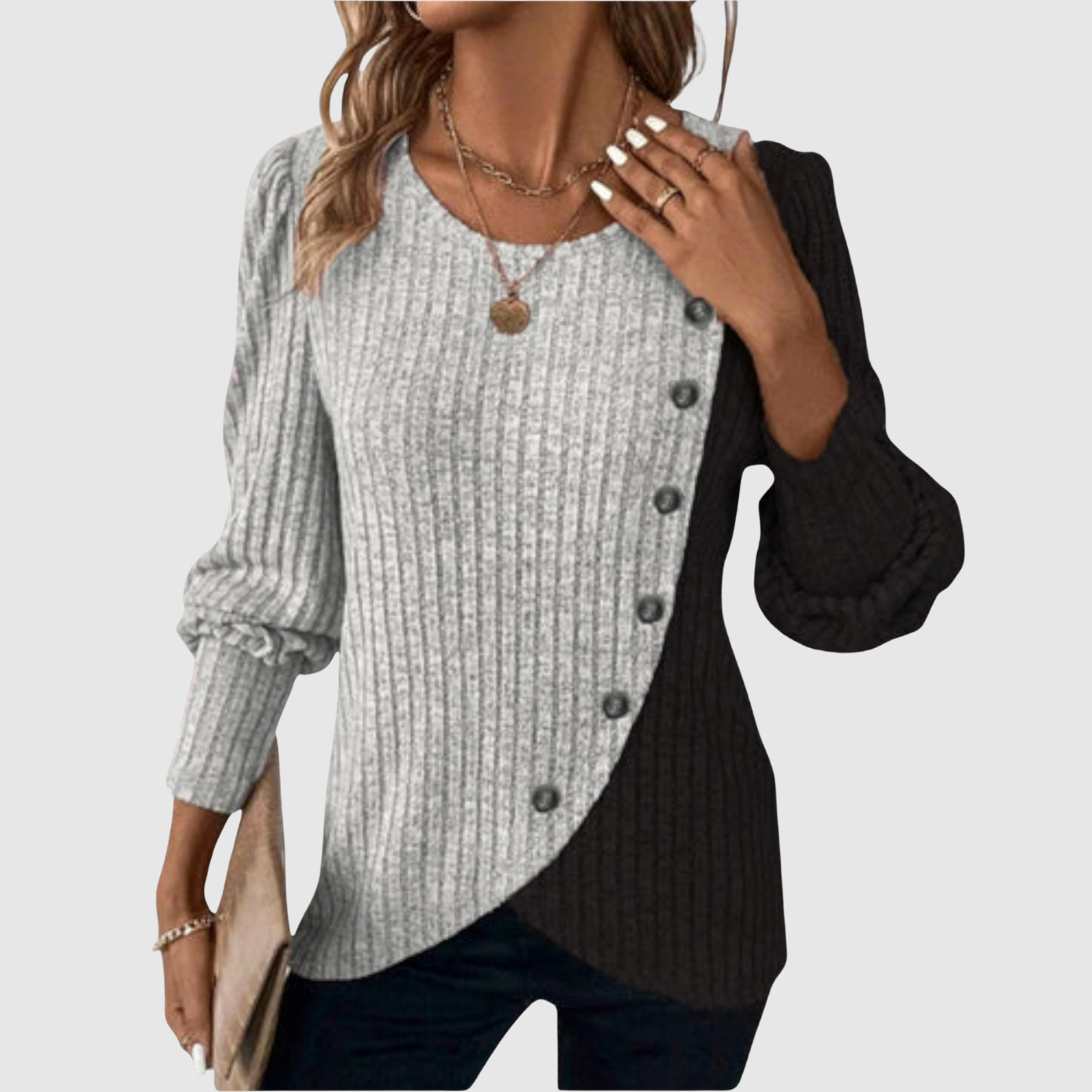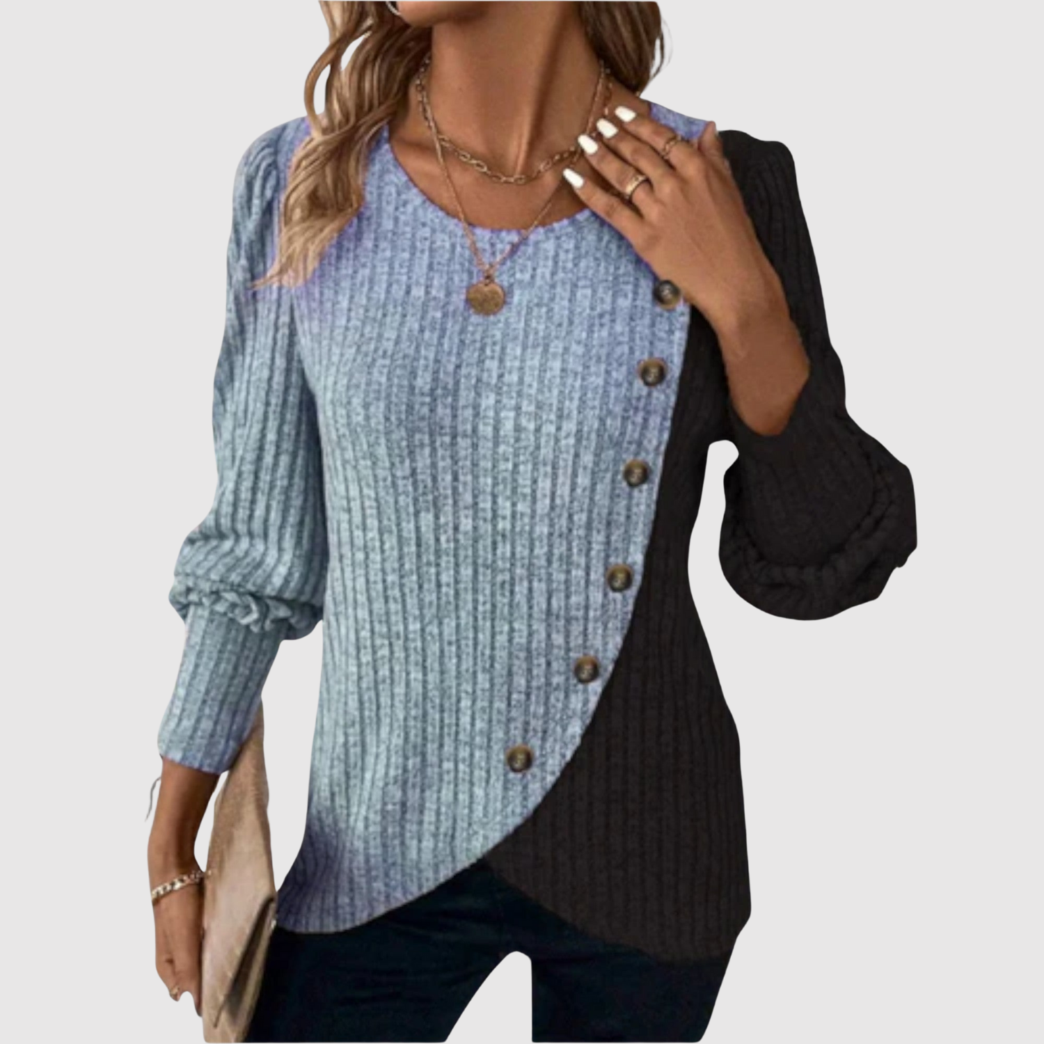 Този пуловер съчетава две цветове в асиметричен дизайн, който създава модерен и забележим вид. Мекото качество и декоративните копчета предлагат както комфорт, така и стил, идеален за освежаване на ежедневния вид.