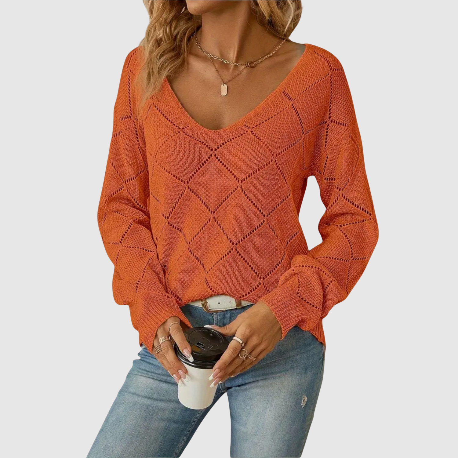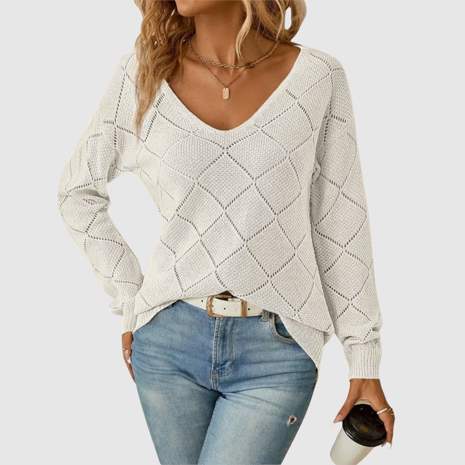 Този пуловер има красив десен, съчетан с ласкаво V-образно деколте, което придава вечен и елегантен вид. Леката и мека материя го прави идеален както за ежедневието, така и за специални поводи.
