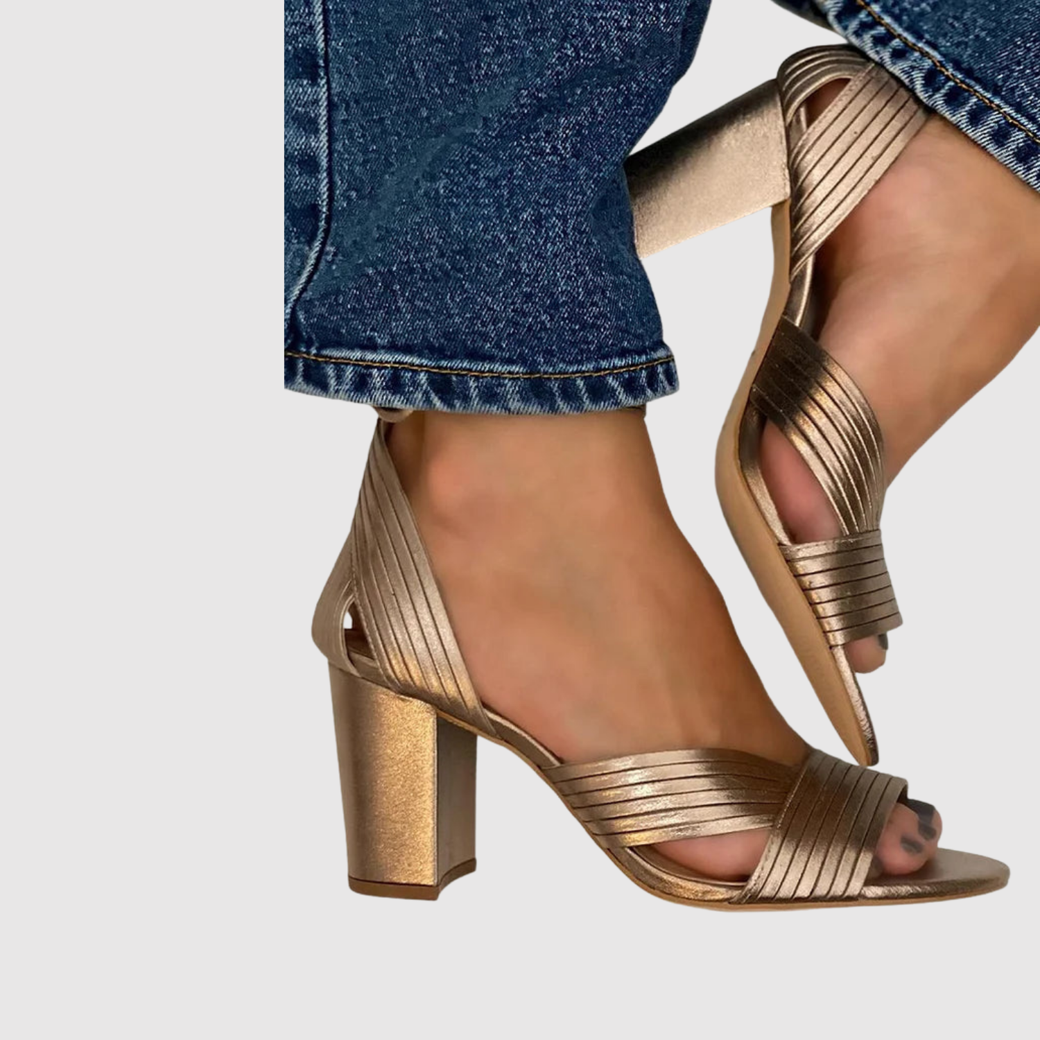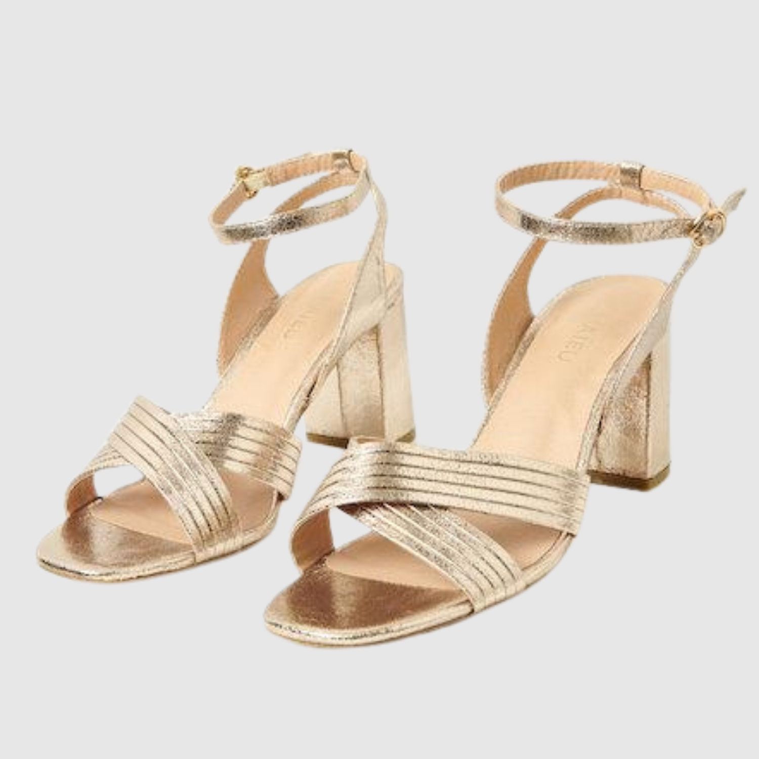 Тези златисти сандали с масивен блоков ток комбинират блясък и комфорт в едно. Диагоналните ремъци обгръщат стъпалото и осигуряват както поддръжка, така и стил. Идеален избор за всичко - от вечери до празнични поводи.