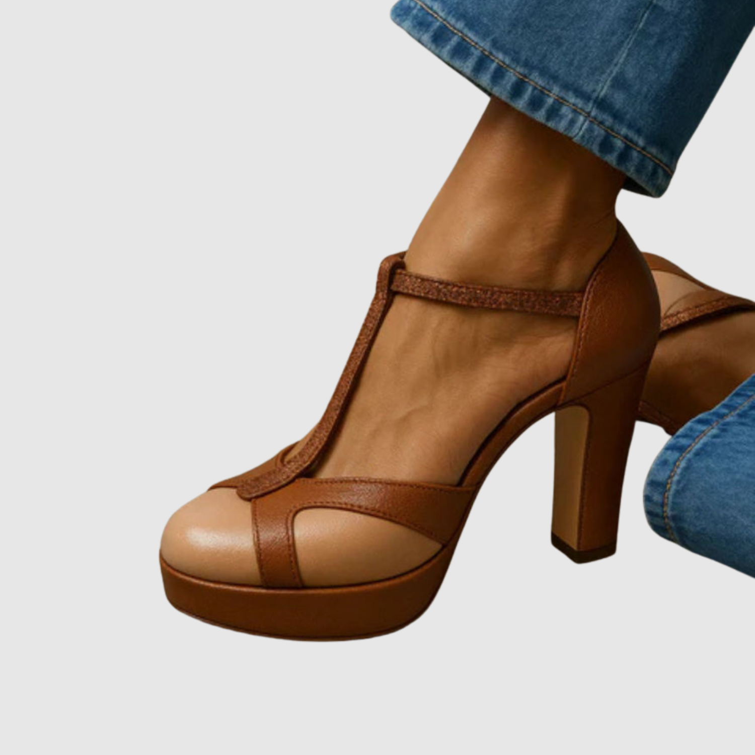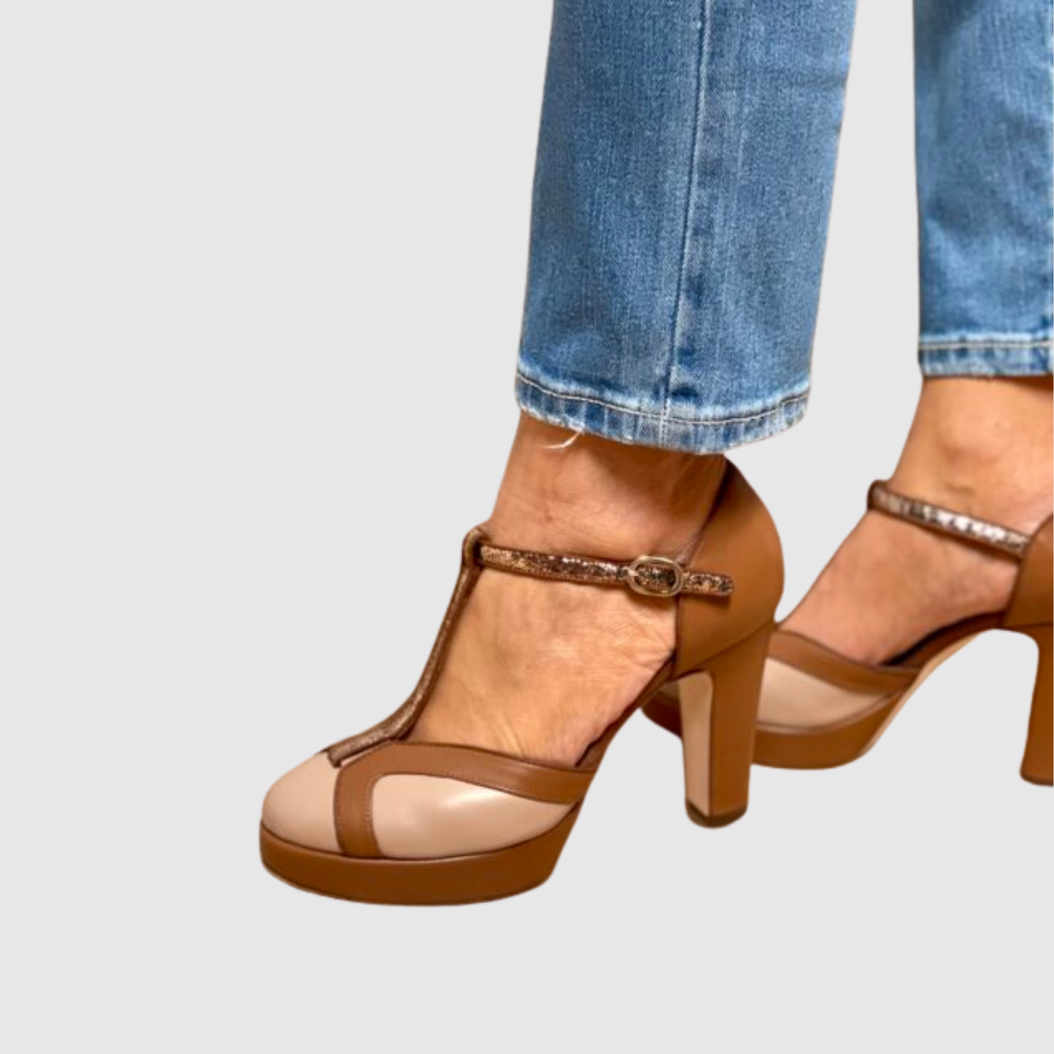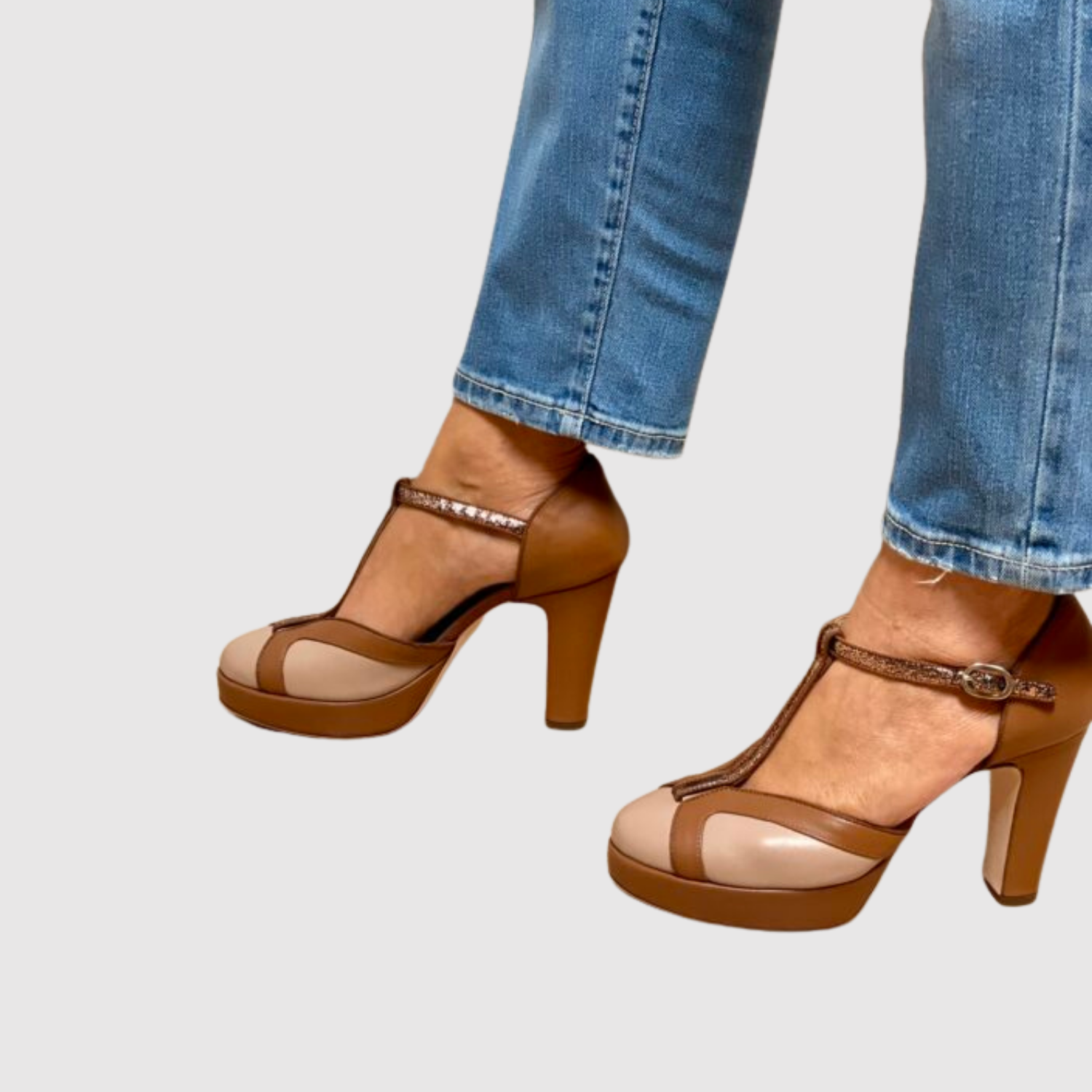 Тези стилни токчета комбинират бежово и кафяво в една вечна цветова комбинация. T-ремът осигурява добро прилягане и стабилност, докато високият ток с леко извита основа ги прави идеални както за работа, така и за вечерно носене. Пара обувки, които съчетават комфорт с характер.
