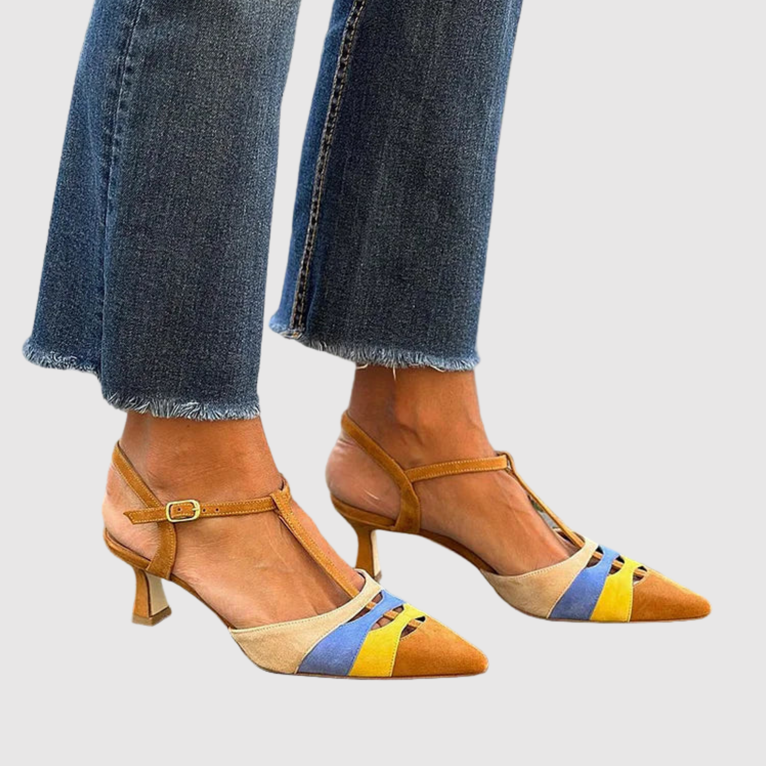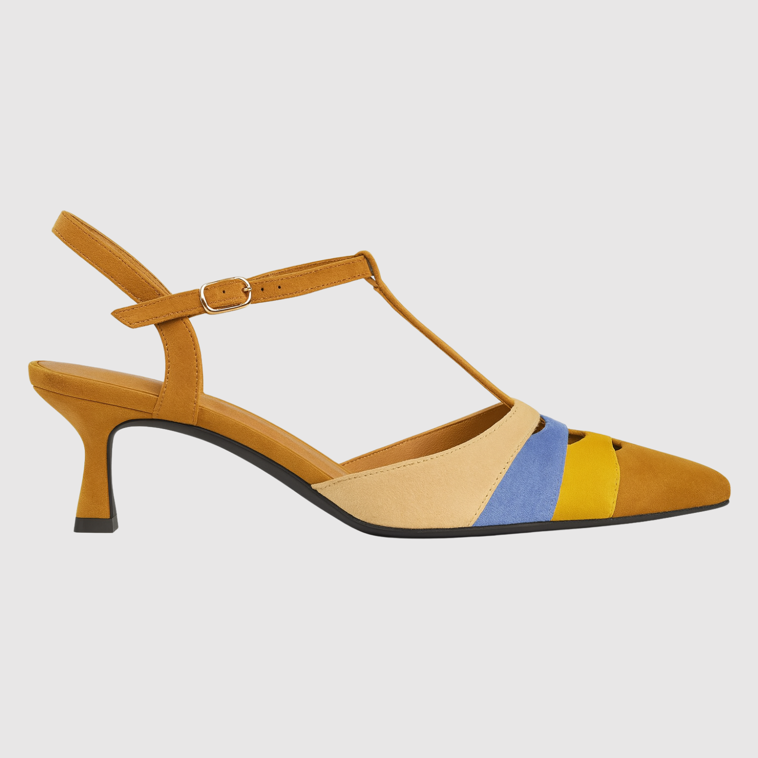 Тези помпи съчетават игриво цветово съчетание на синьо, жълто и кафяво с елегантен нисък ток. Фината каишка на глезена осигурява стабилност и женствено излъчване, докато удобното прилягане прави обувките перфектни както за ежедневна употреба, така и за специални поводи.