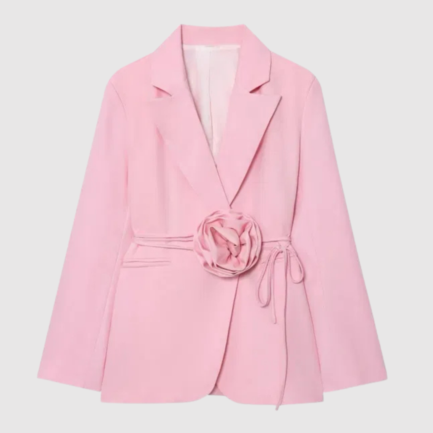 Този блейзър комбинира класическа елегантност с уникален цветен детайл в талията. Фигурата е прилягаща, което създава изискано излъчване, перфектно за формални и празнични поводи.