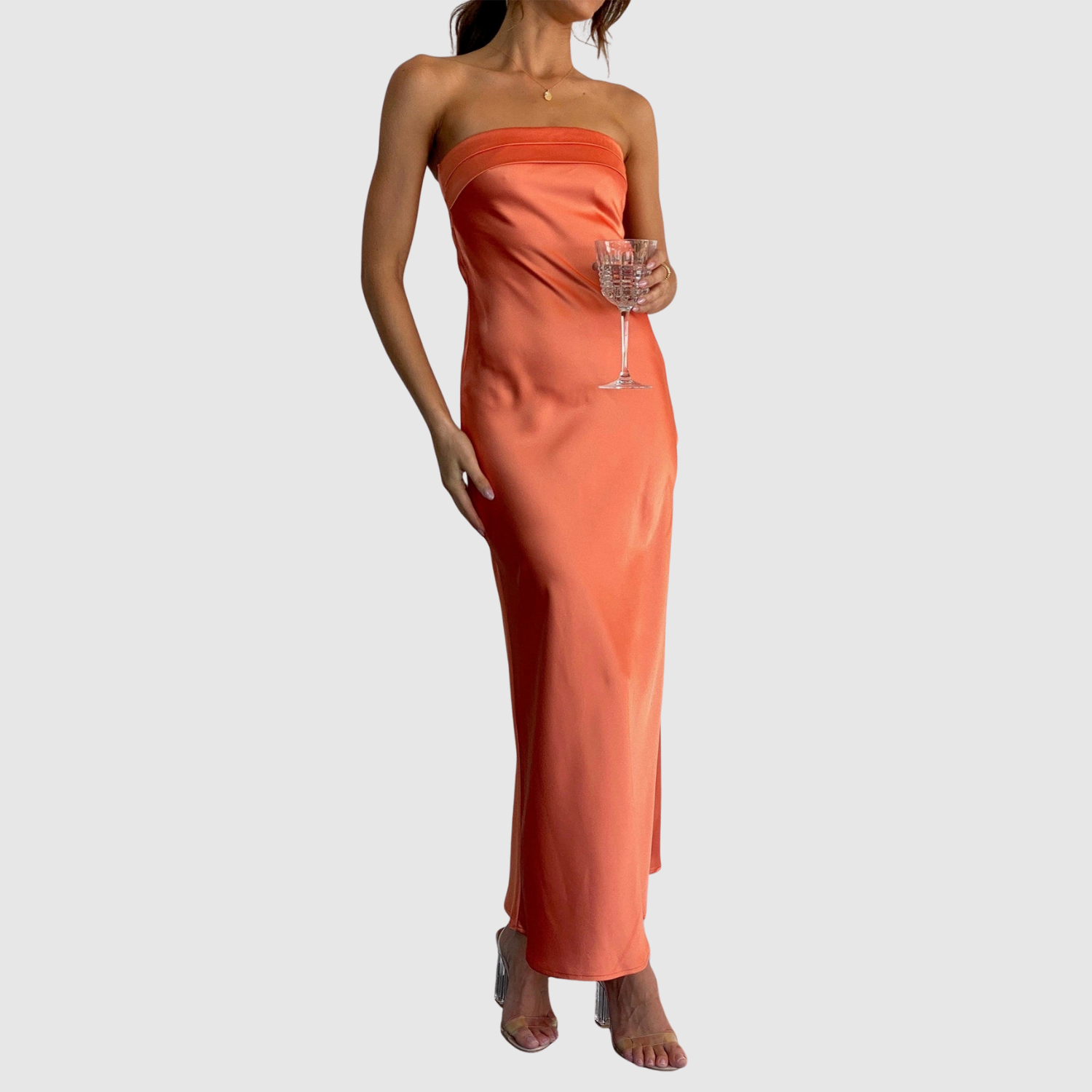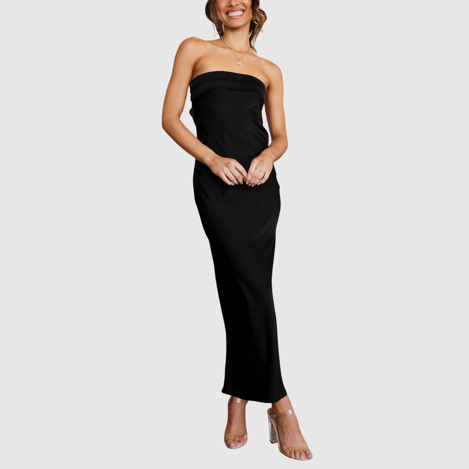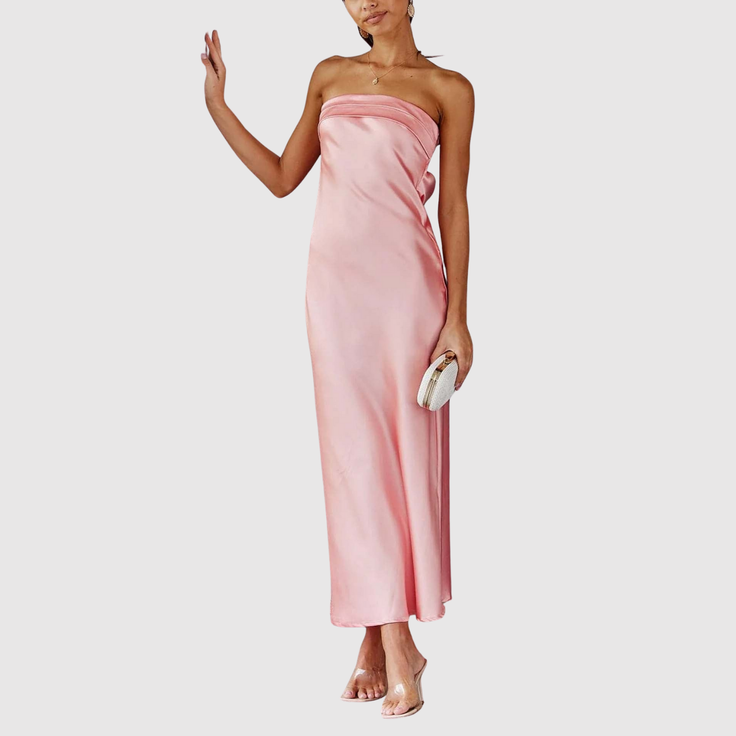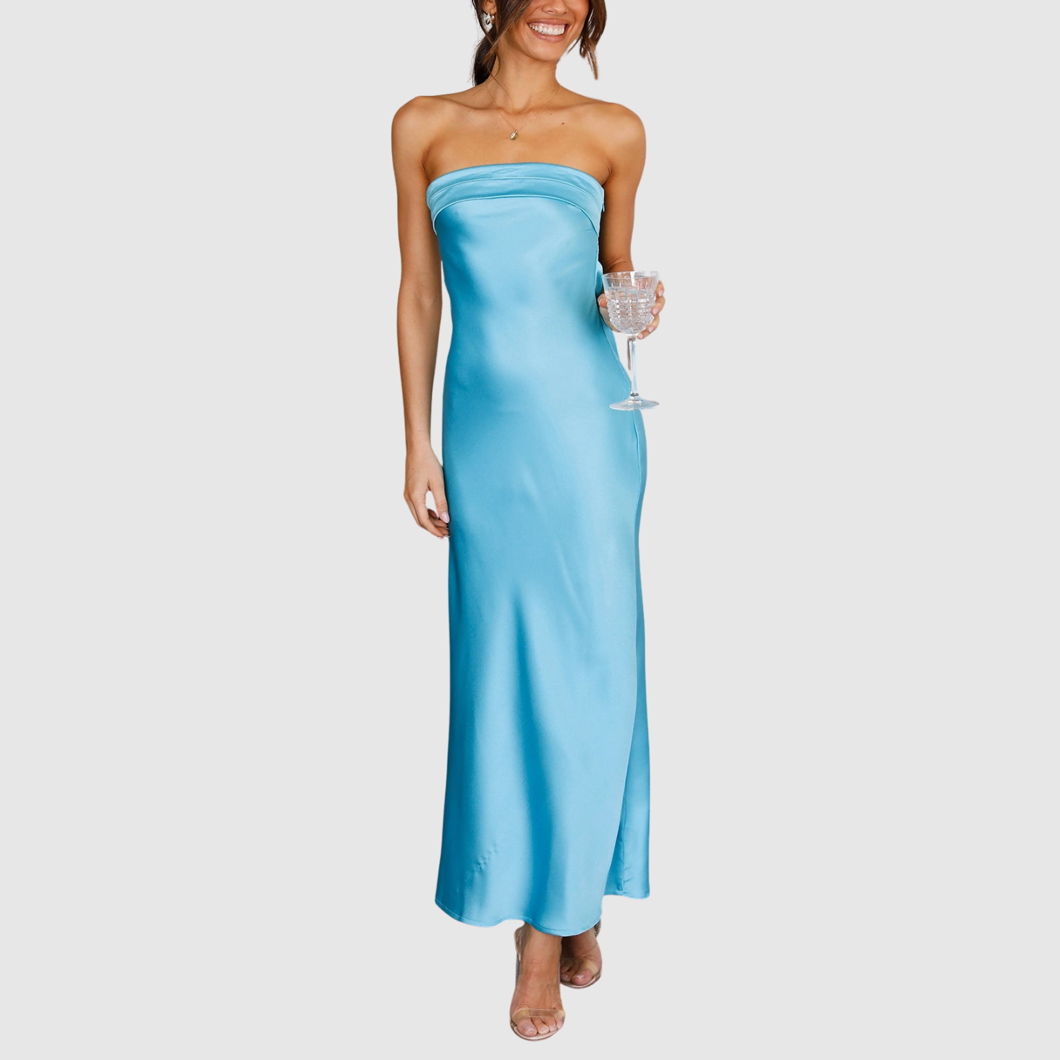 Лилия – Без презрамки дълга рокля с сатенен вид