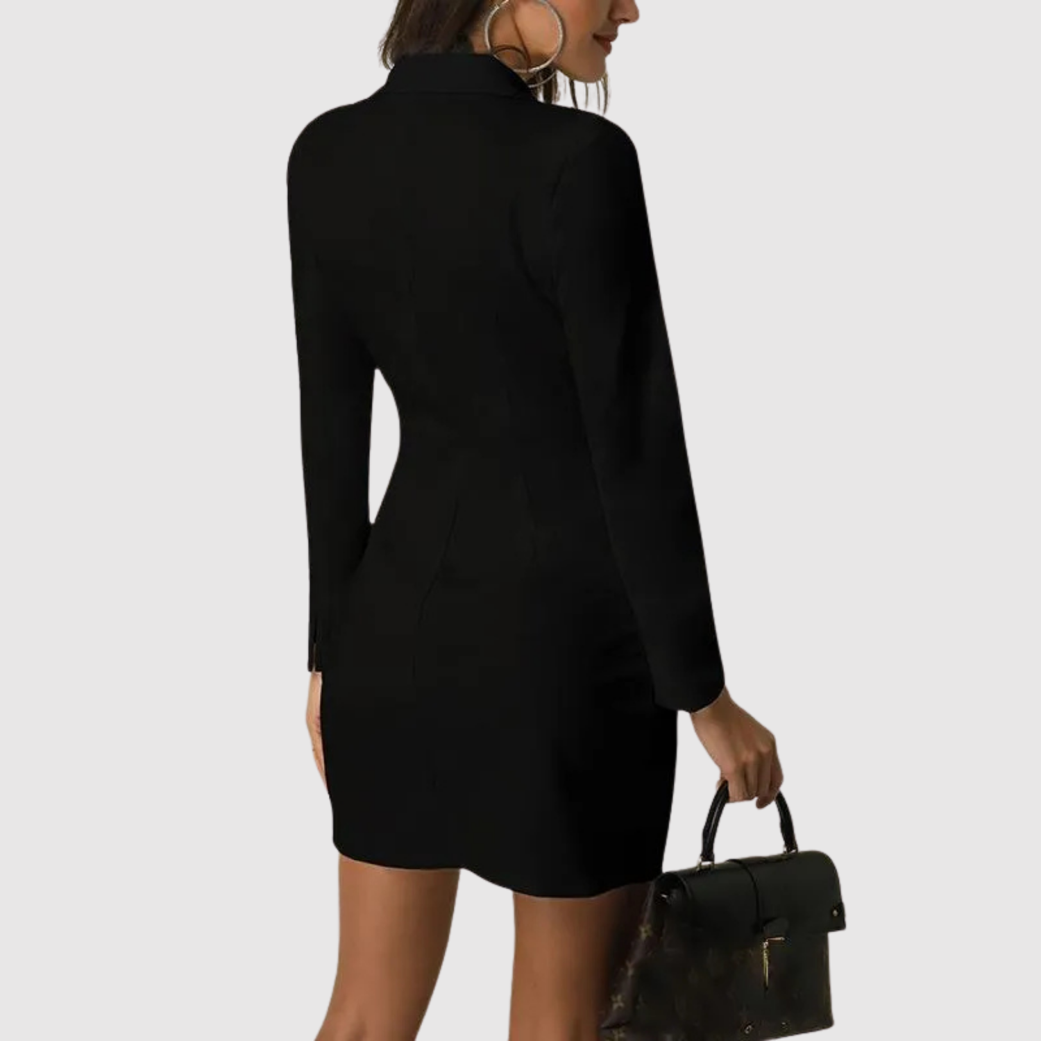 Фигурна рокля, вдъхновена от класическия блейзър дизайн. Двуредното закопчаване и изразителните рамене придават професионален, но женствен вид – идеална както за бизнес срещи, така и за вечерни събития.