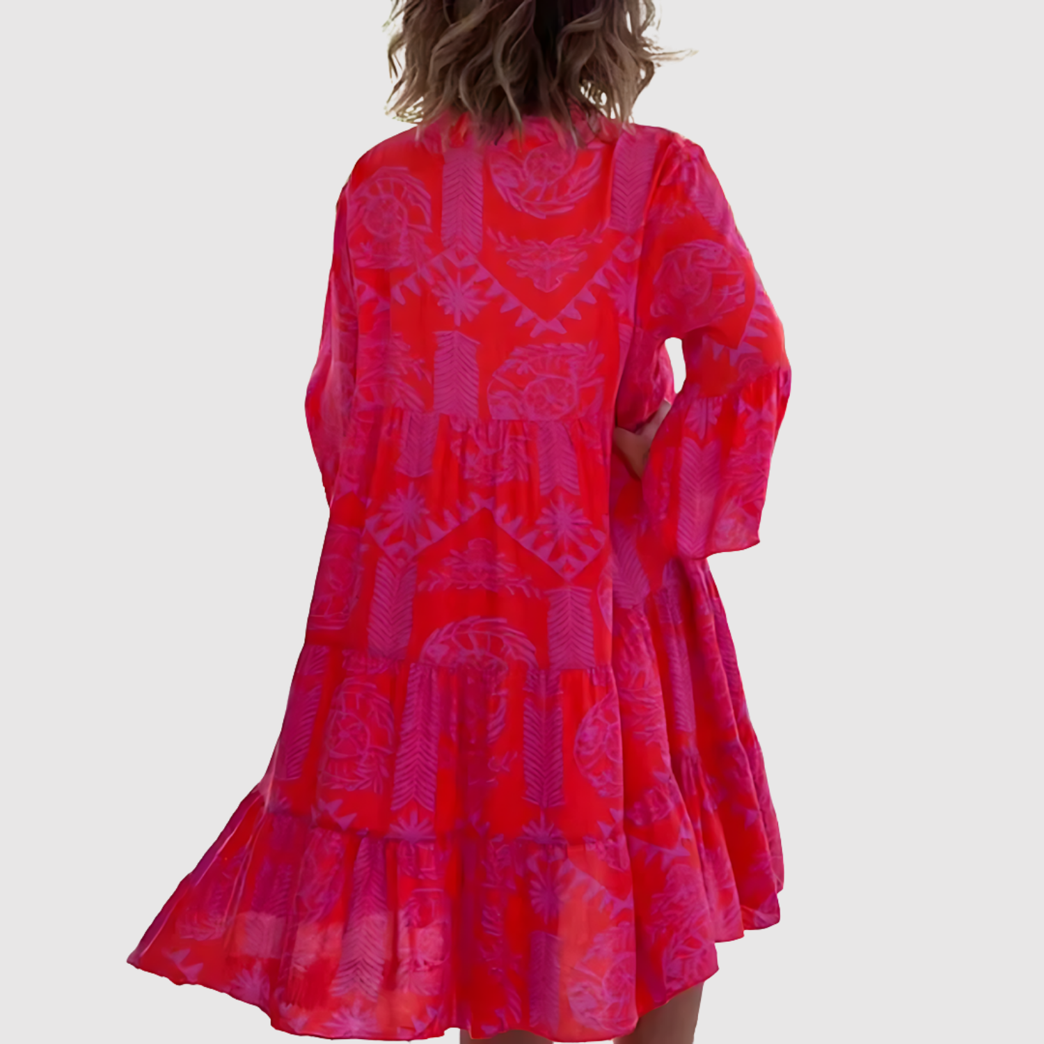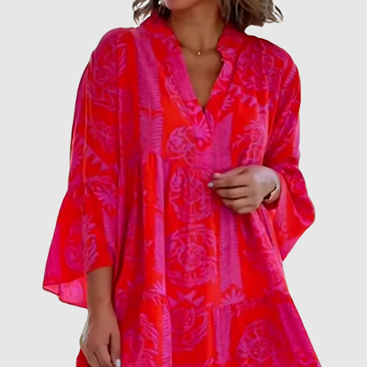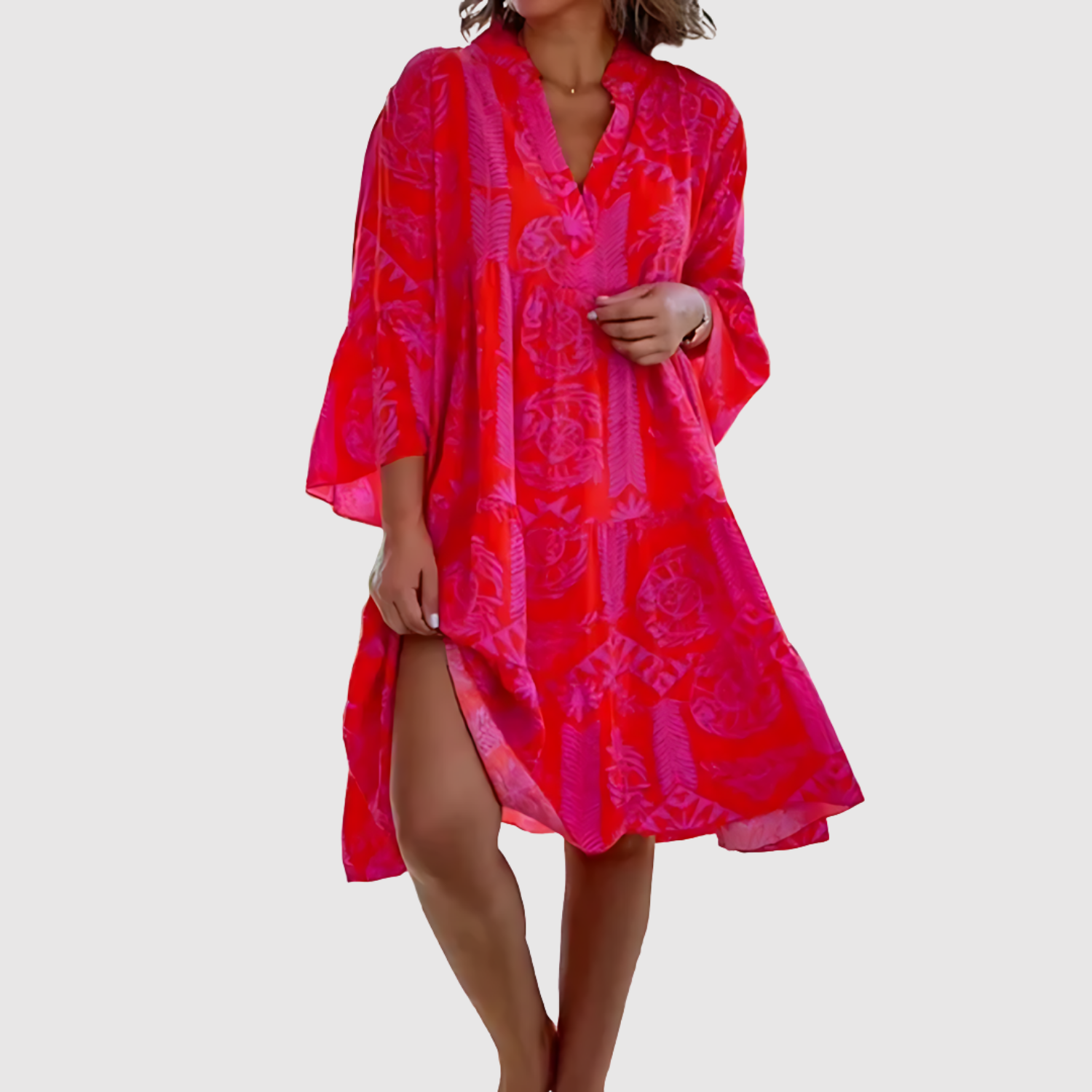 Бохемски вдъхновена рокля с свободна кройка, три четвърти ръкави и живописен модел в розови и червени нюанси. Перфектна за летни дни, ваканции или спокойни разходки по плажа.