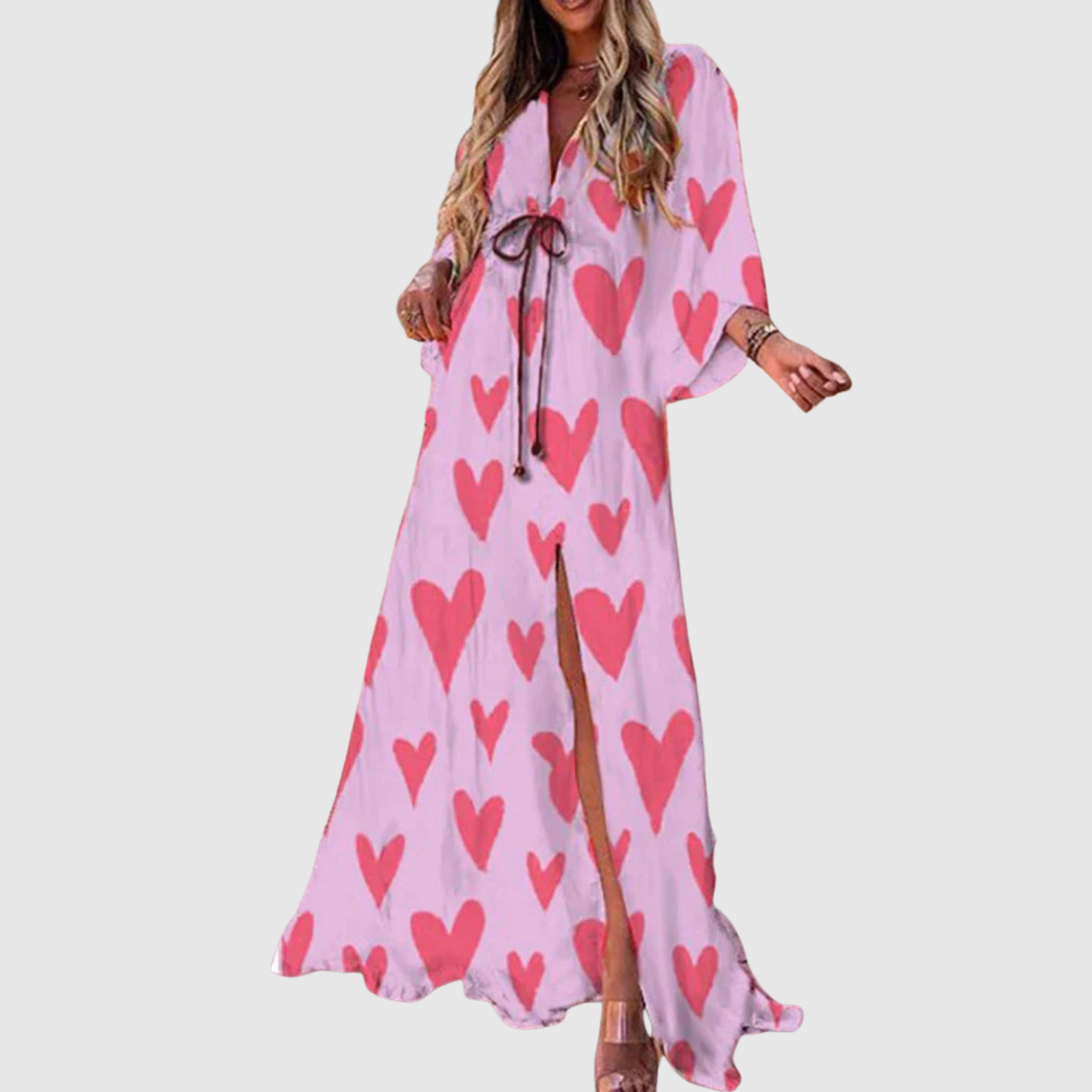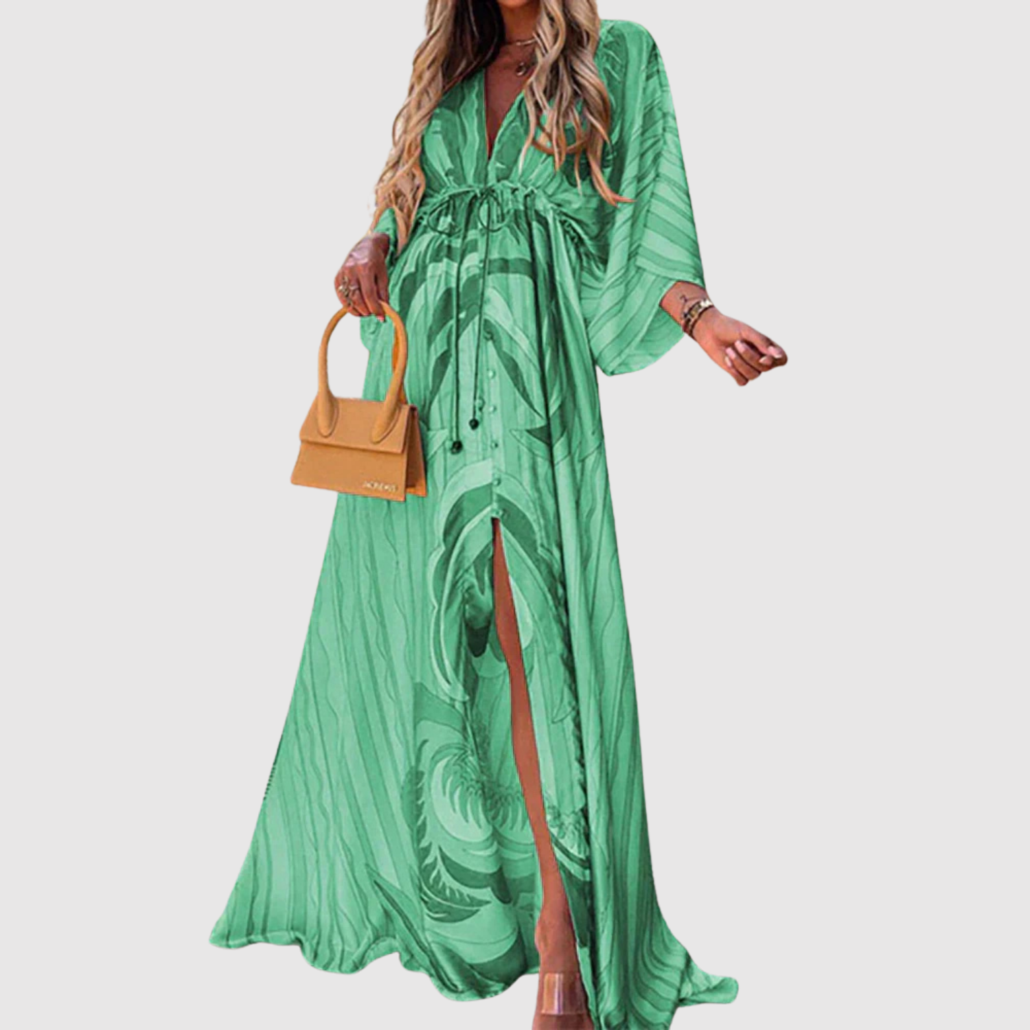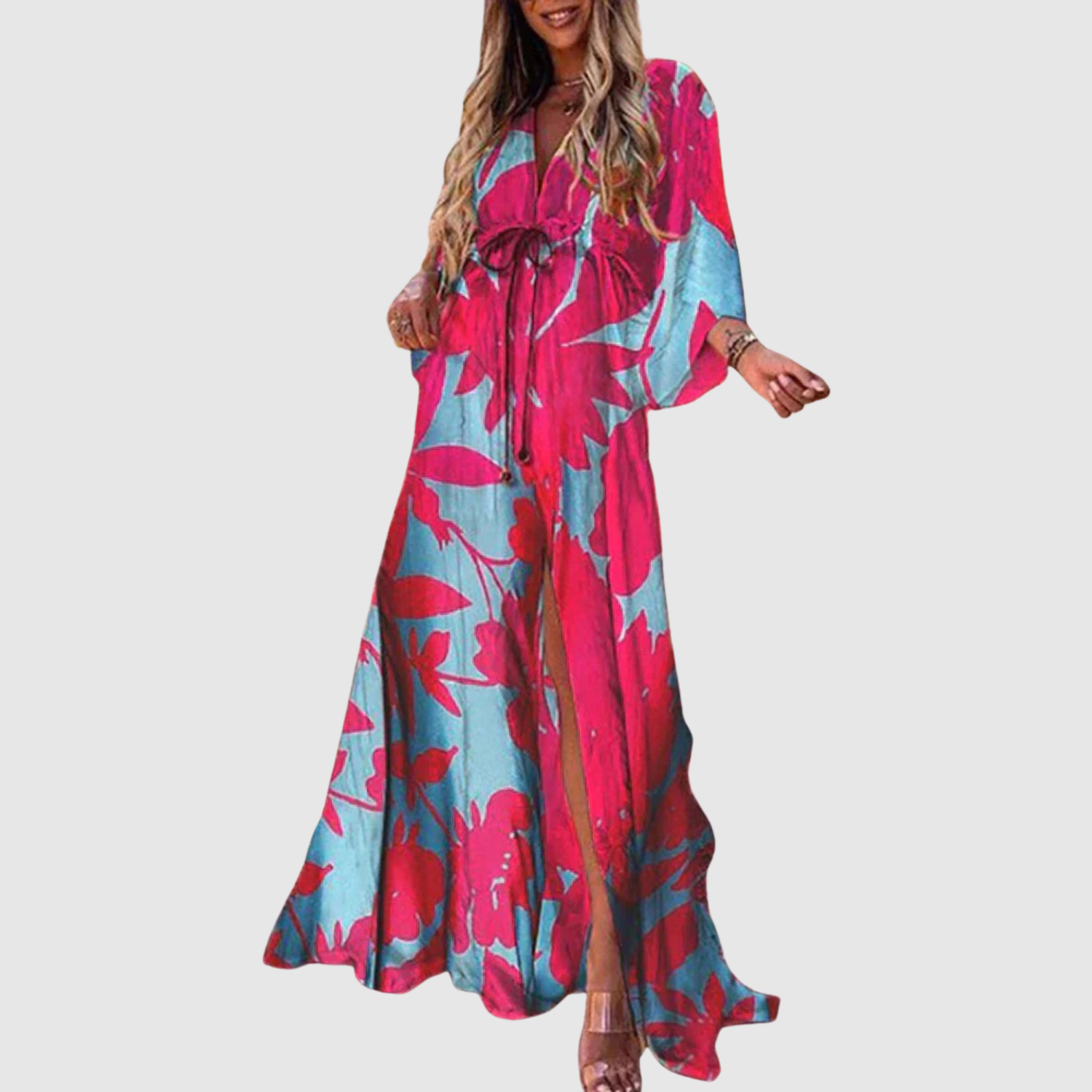 Тази макси рокля комбинира леко платно с уникални десени и цветове, които придават привлекателен вид. Свободната кройка и дългата силует я правят перфектна за летни дни, ваканции и празнични поводи, където комфортът среща стил.