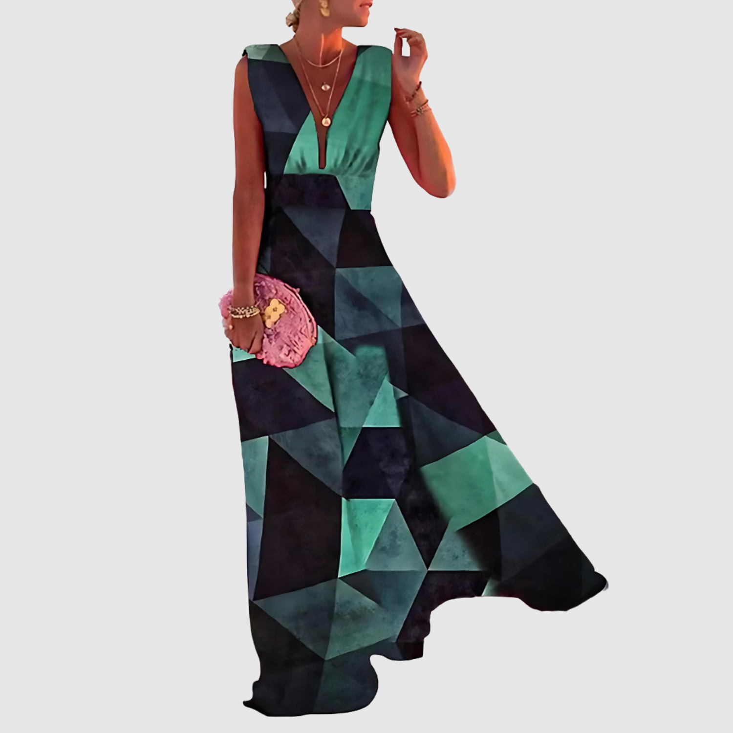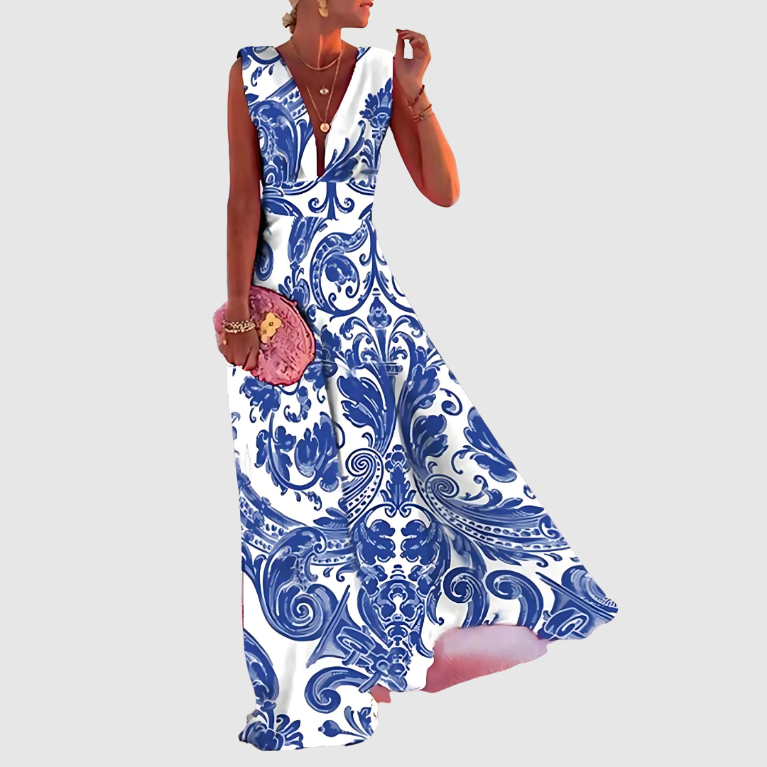 Течаща макси рокля с дълбоко V-образно деколте, която съчетава елегантност и комфорт. Перфектна за летни партита, ваканции или романтична вечер навън. Лекото материал пада красиво и придава изискан вид както в едноцветен, така и в шарен дизайн.