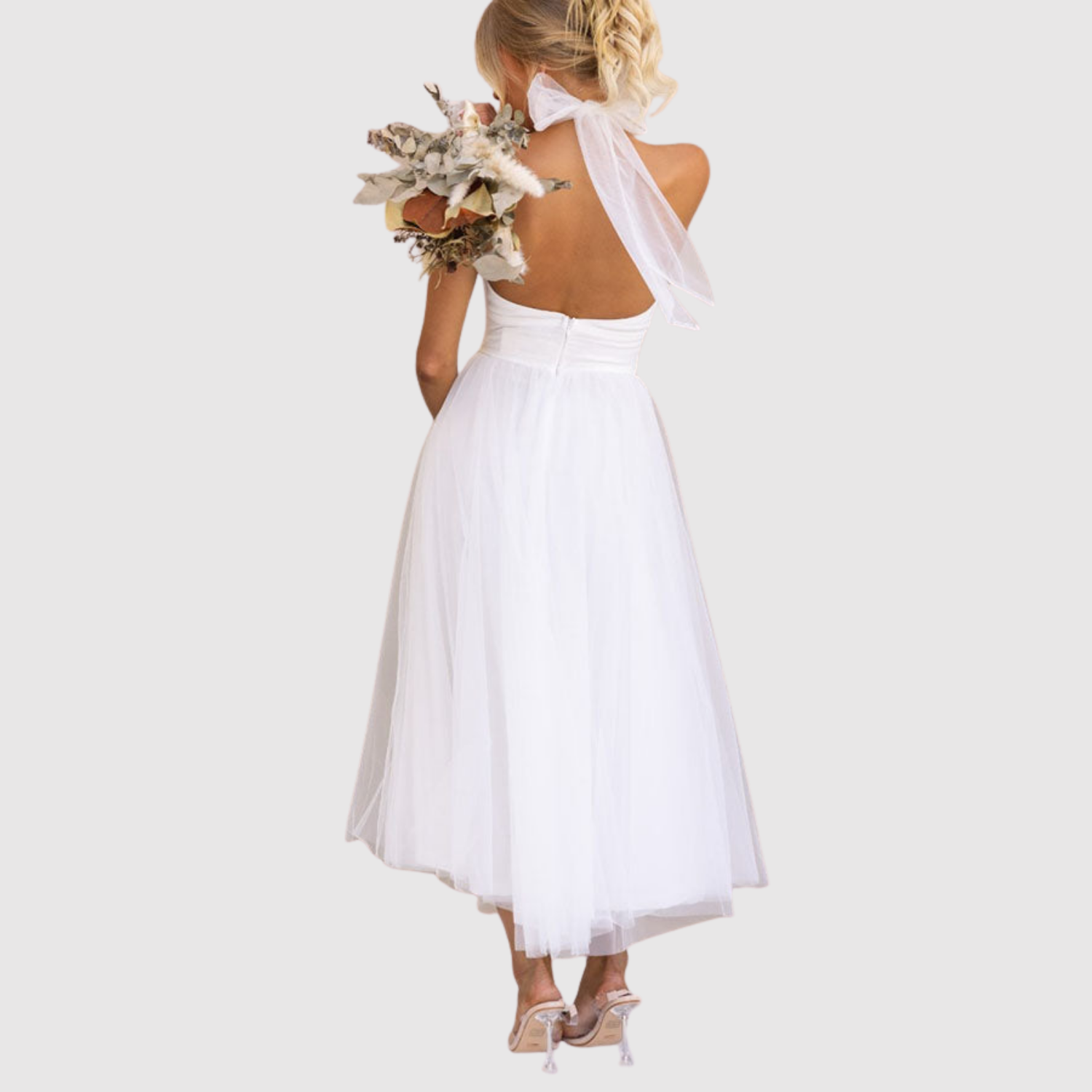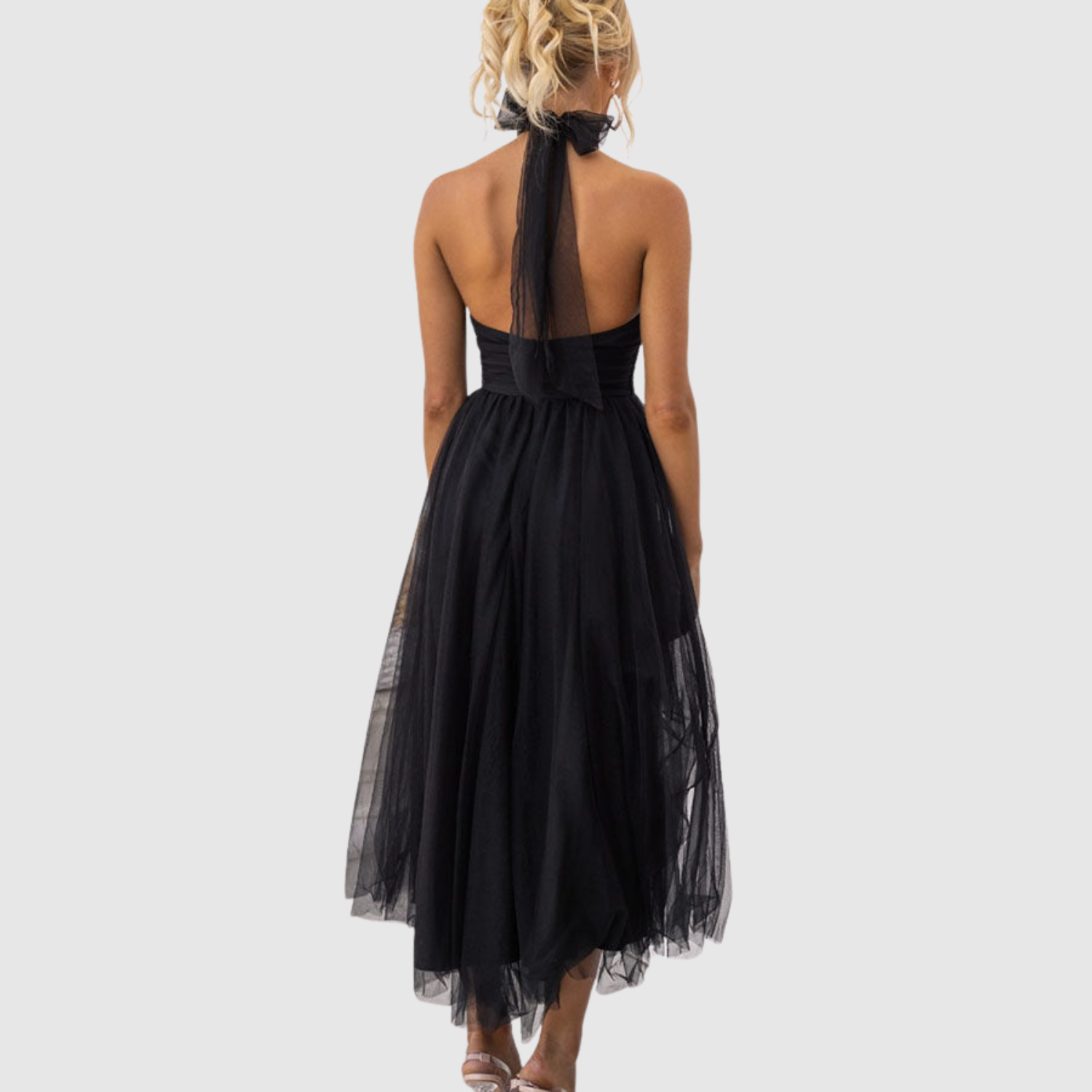 Очарователна рокля в слоеве от лек тюл, която пада красиво при всяко движение. Високата яка придава изискан вид, докато елегантният кройка подчертава женствената силует. Перфектна за сватби, партита и специални поводи.