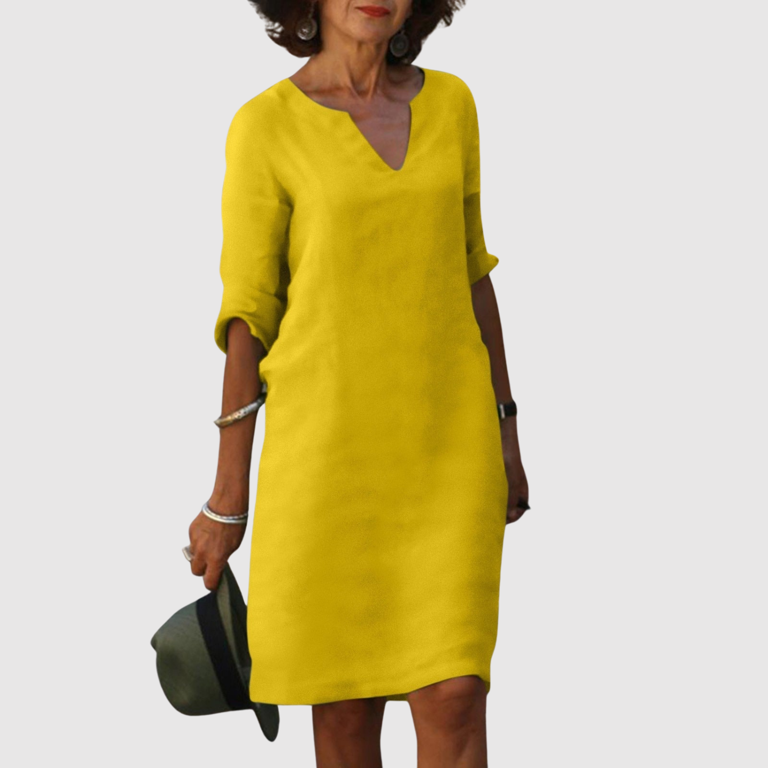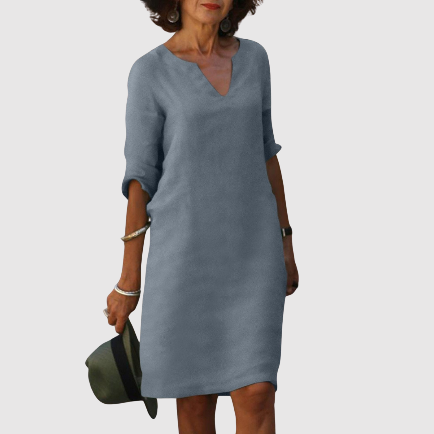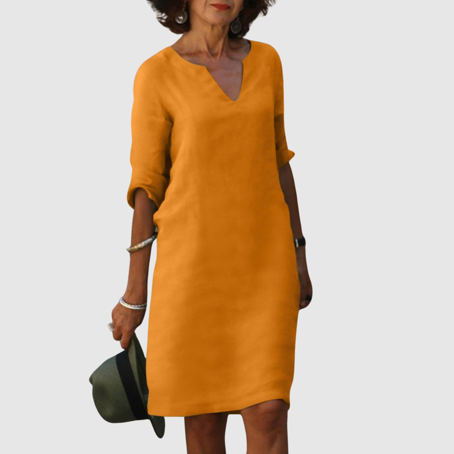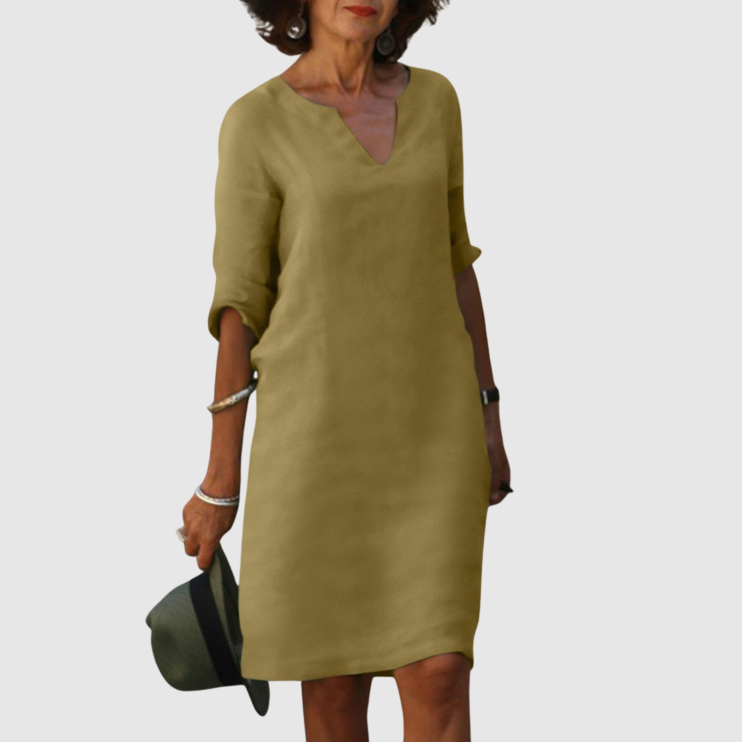 Тази рокля с ленен вид е едновременно лека и удобна за носене. Със своето безвременно оформление и свободен силует, тя е идеална за ежедневна употреба, летни излети или неформална вечеря. Класика, която винаги е сигурен избор.
