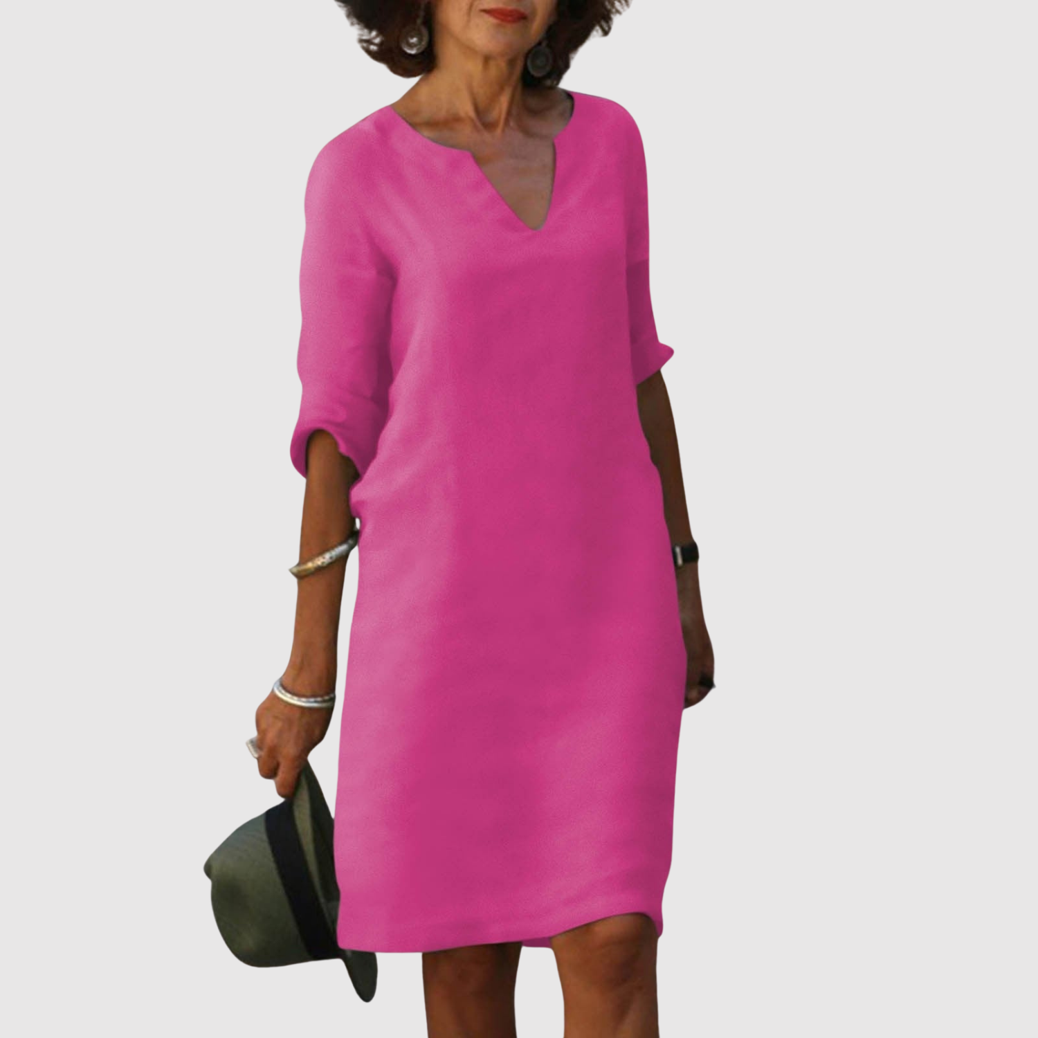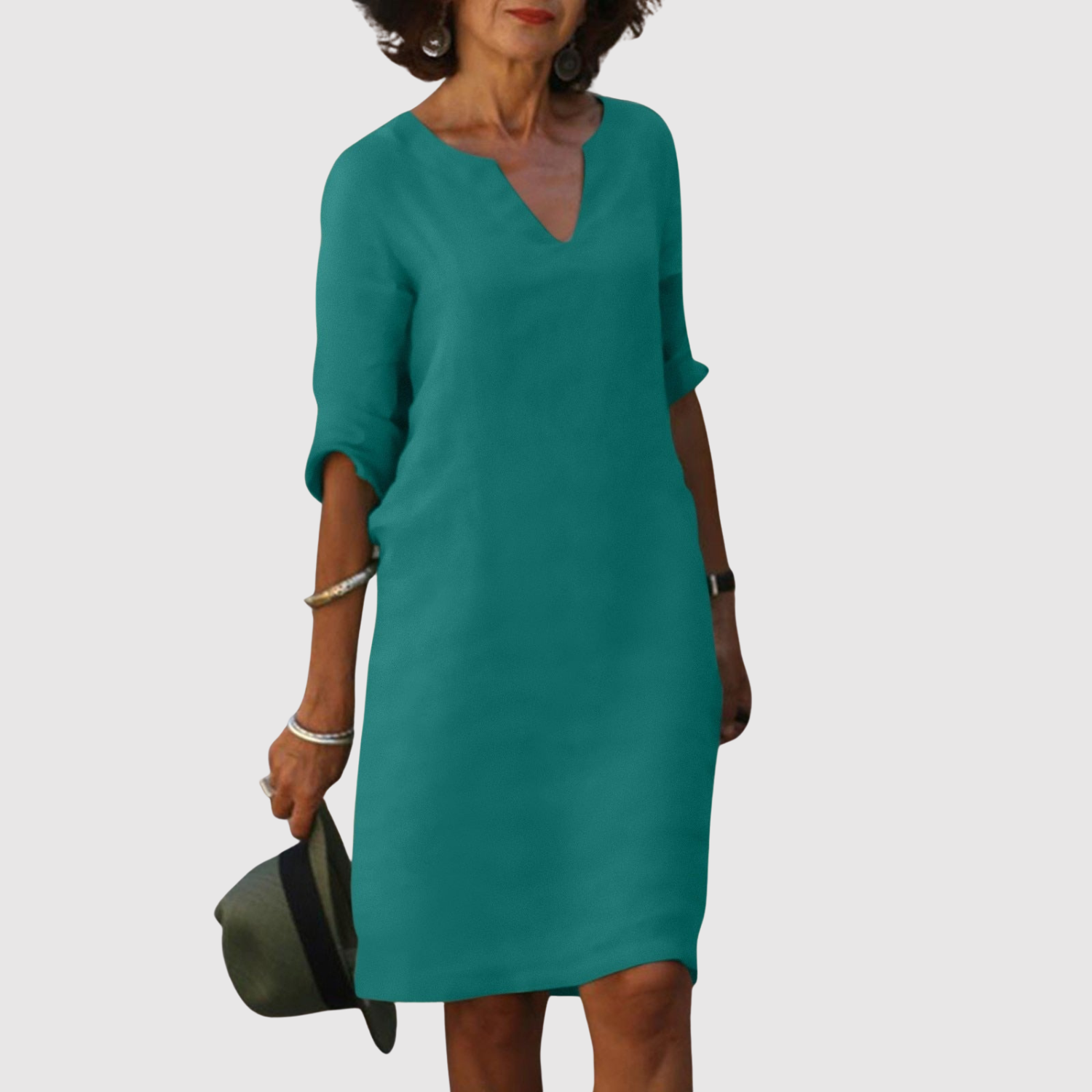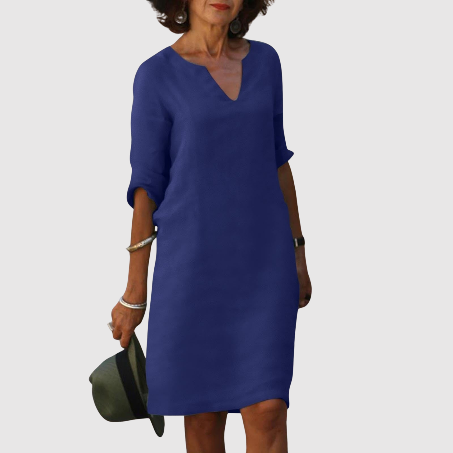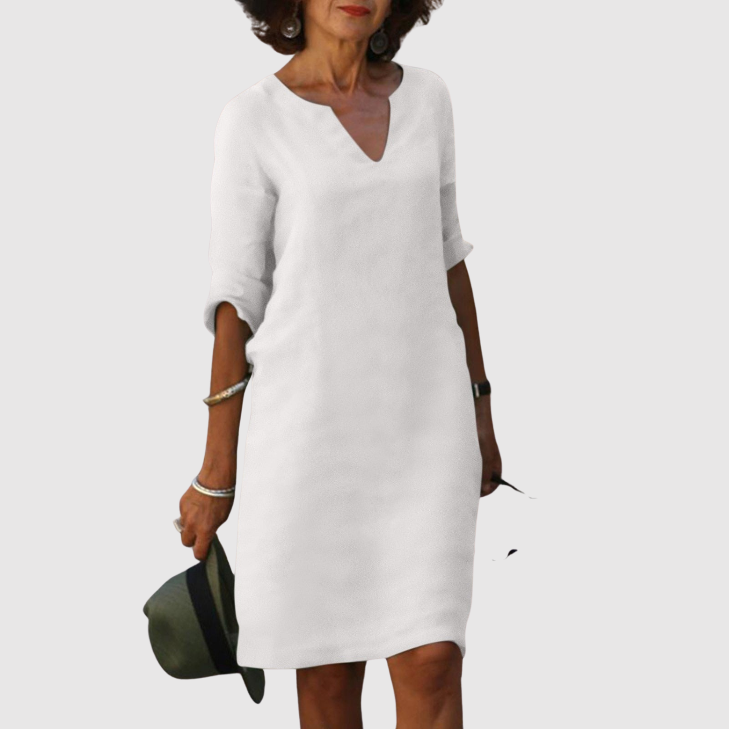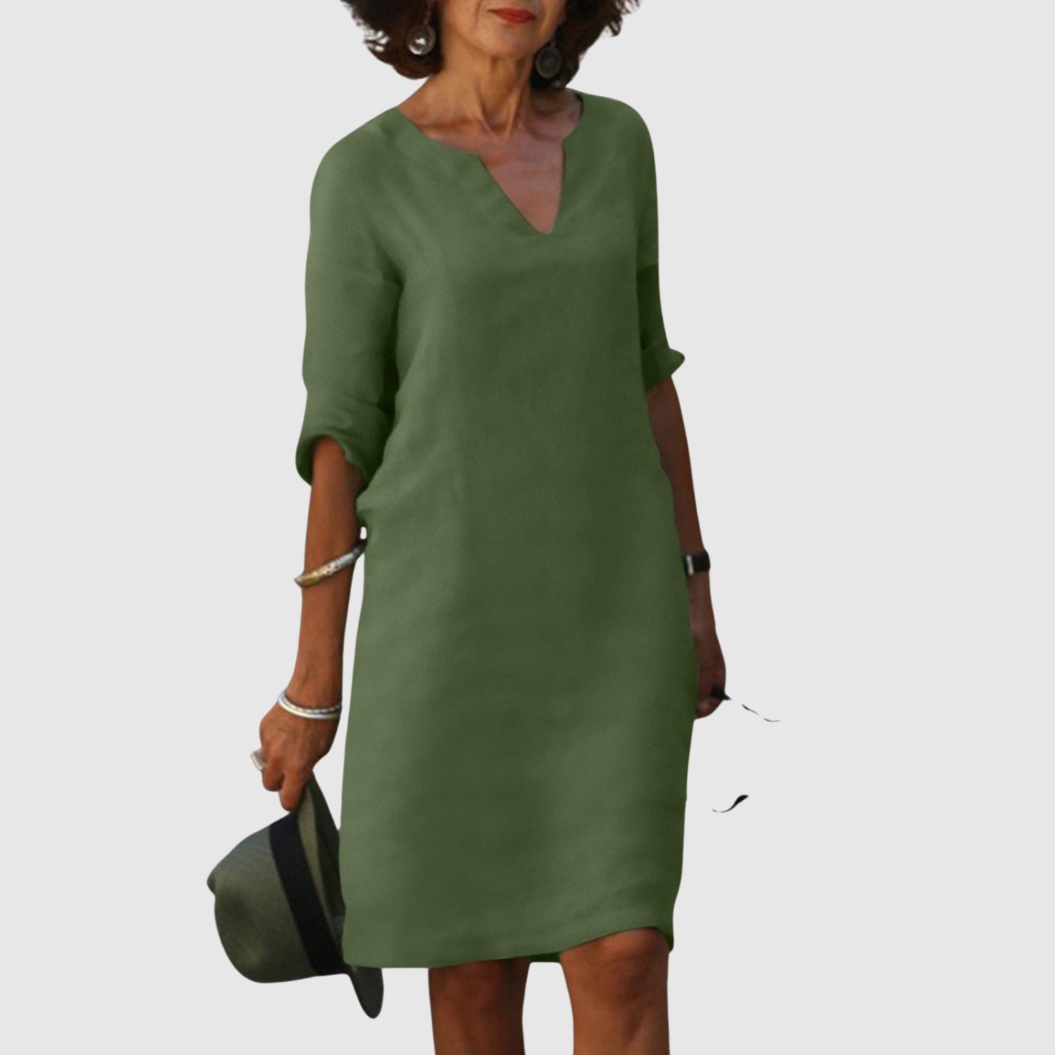 Тази рокля с ленен вид е едновременно лека и удобна за носене. Със своето безвременно оформление и свободен силует, тя е идеална за ежедневна употреба, летни излети или неформална вечеря. Класика, която винаги е сигурен избор.