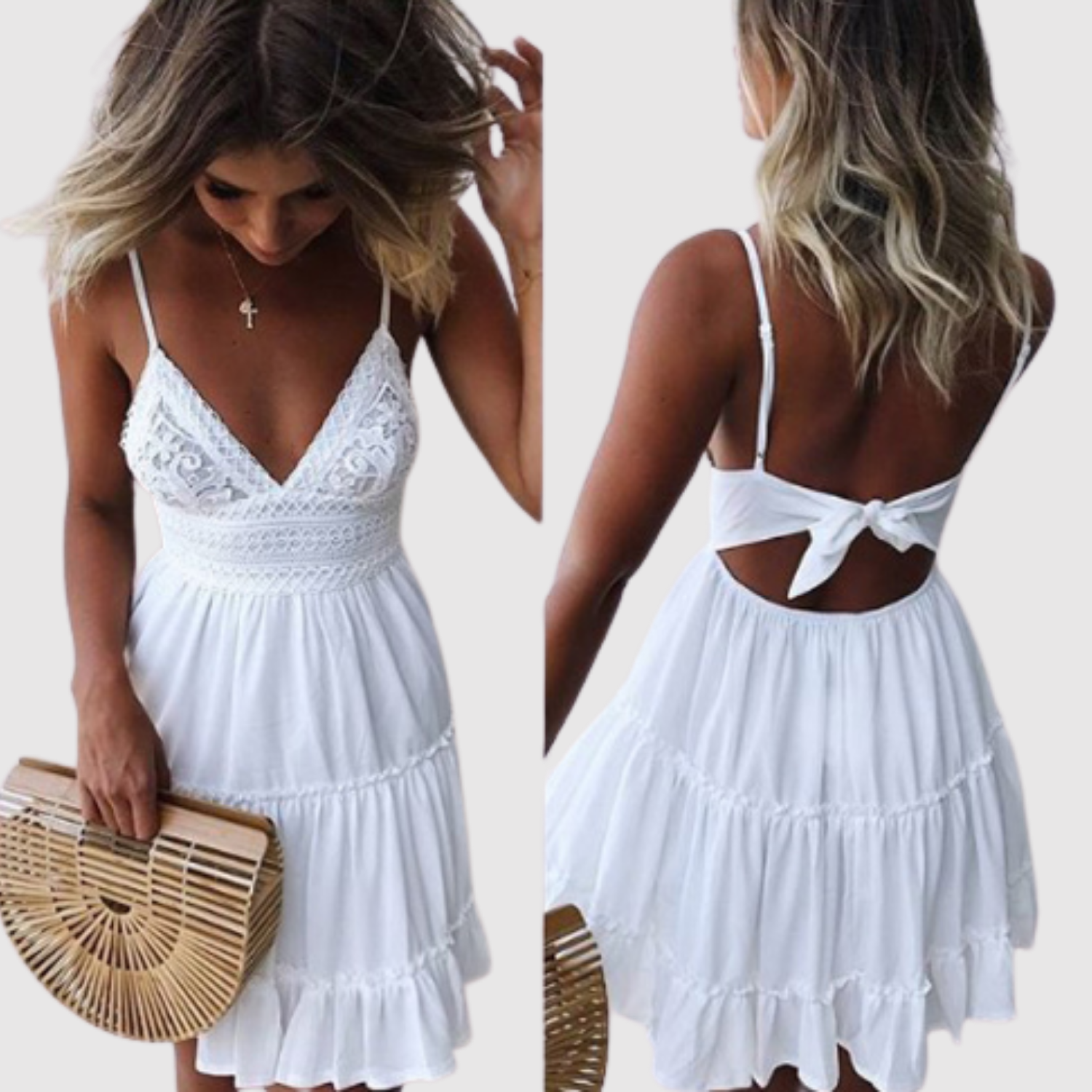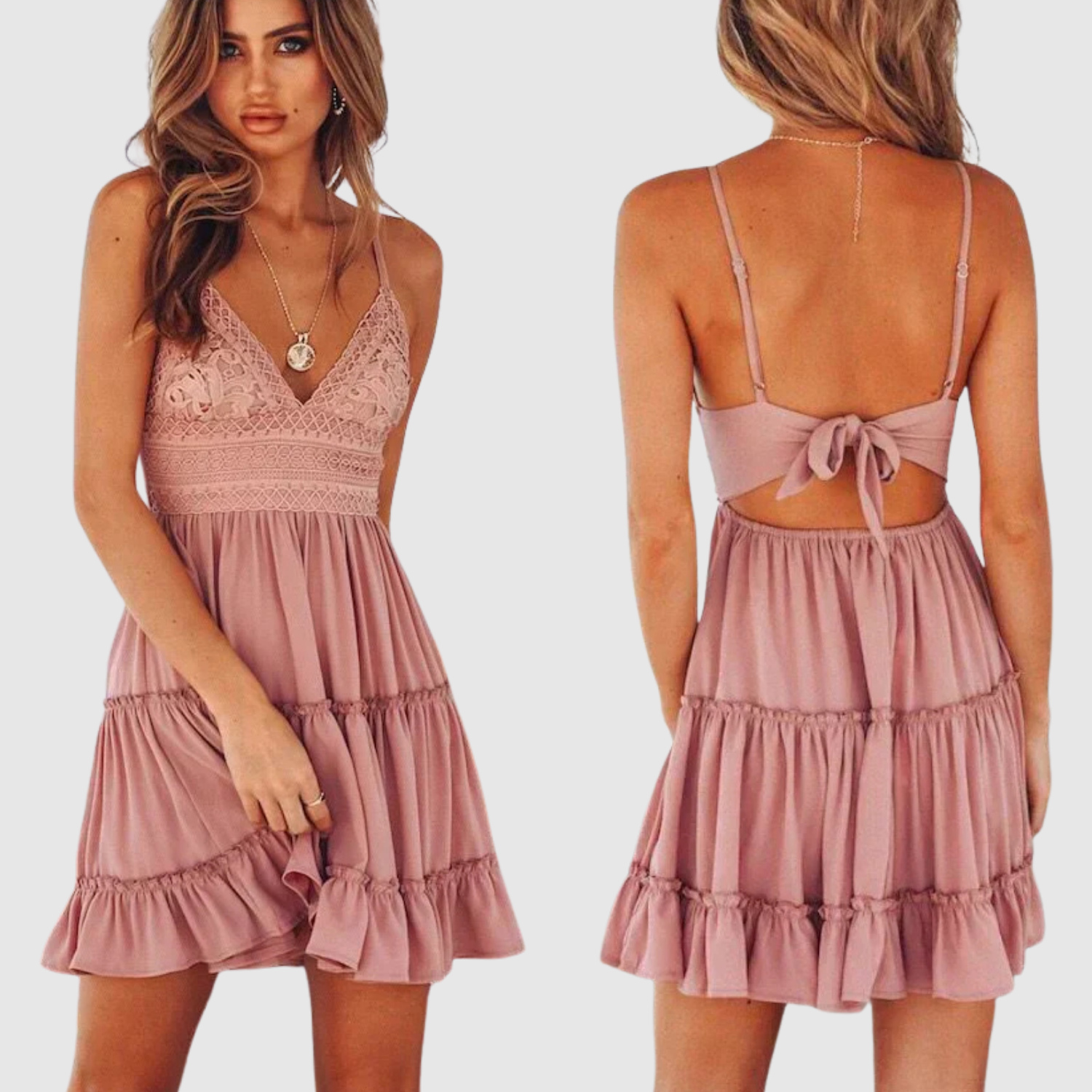 Въздушна лятна рокля с ласкаво кроене и открит гръб, която придава свеж и женствен вид. Перфектна за плажни излети, летни партита или един релаксиращ ден на слънце.