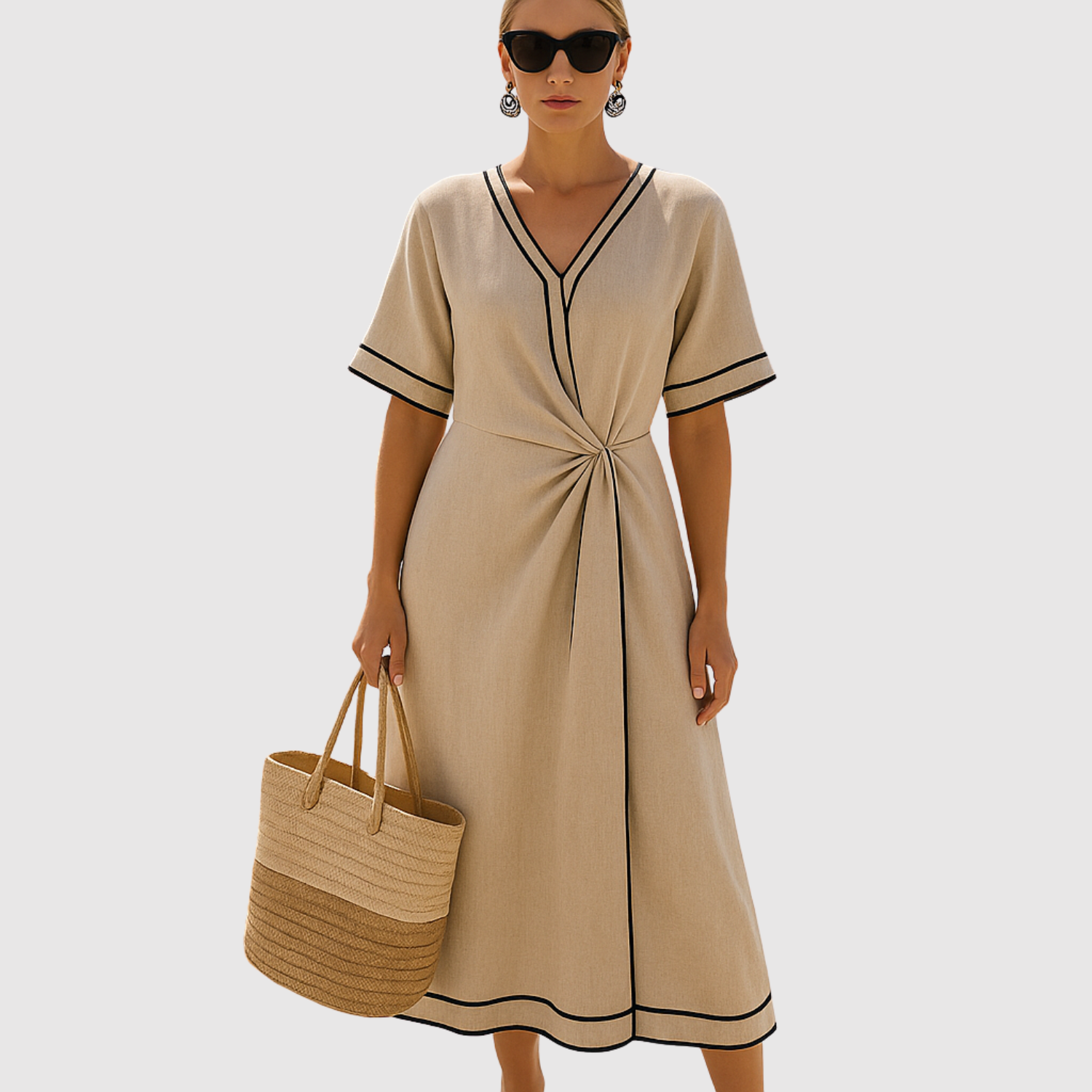 Тази рокля е олицетворение на свежест и летен стил. С лек и плавен силует, който осигурява пълна свобода на движение, тя се откроява с елегантната си странична панделка, която подчертава силуета, както и с контрастни ръбове, които придават модерен вид. Перфектна за разходки, ваканции или неформални събирания – универсална рокля, която комбинира комфорт и изтънченост в едно дизайнерско решение.