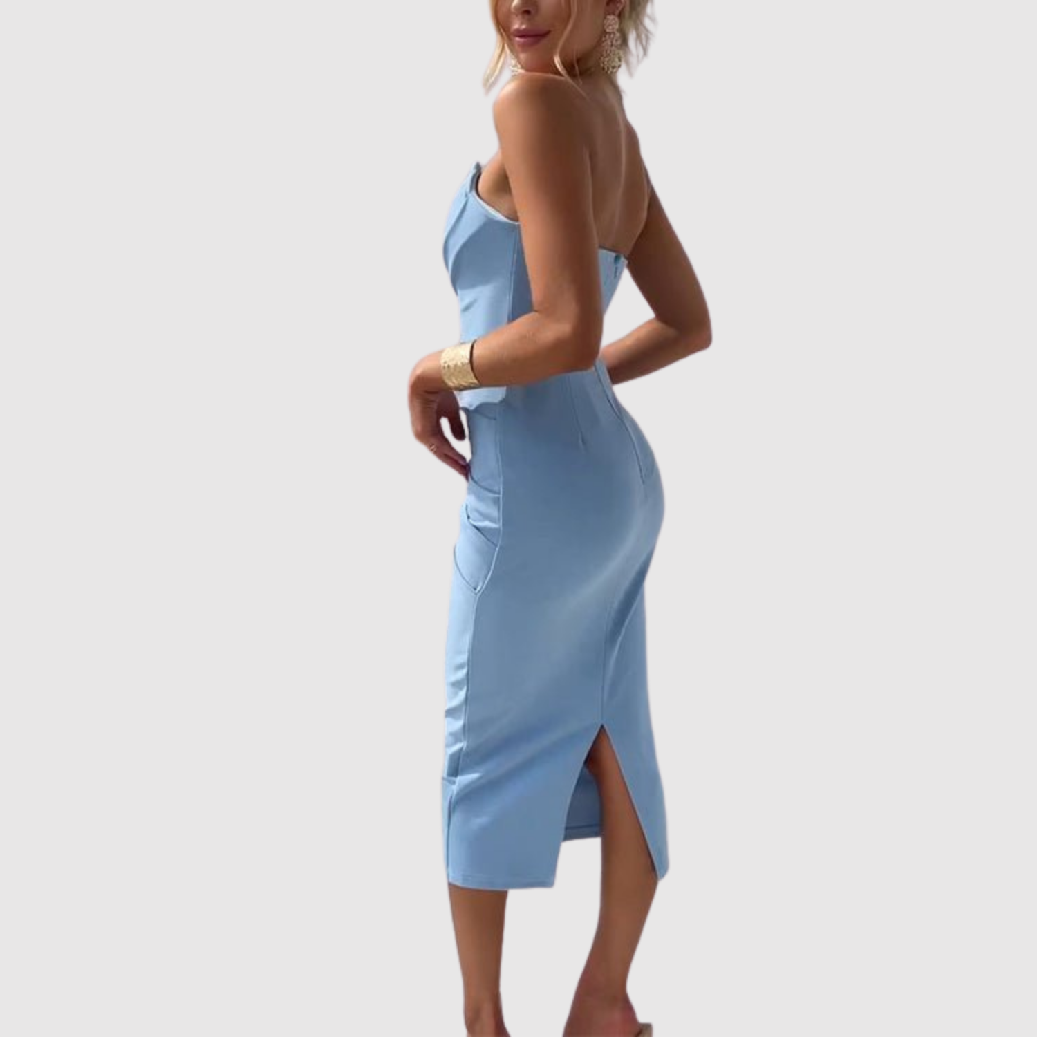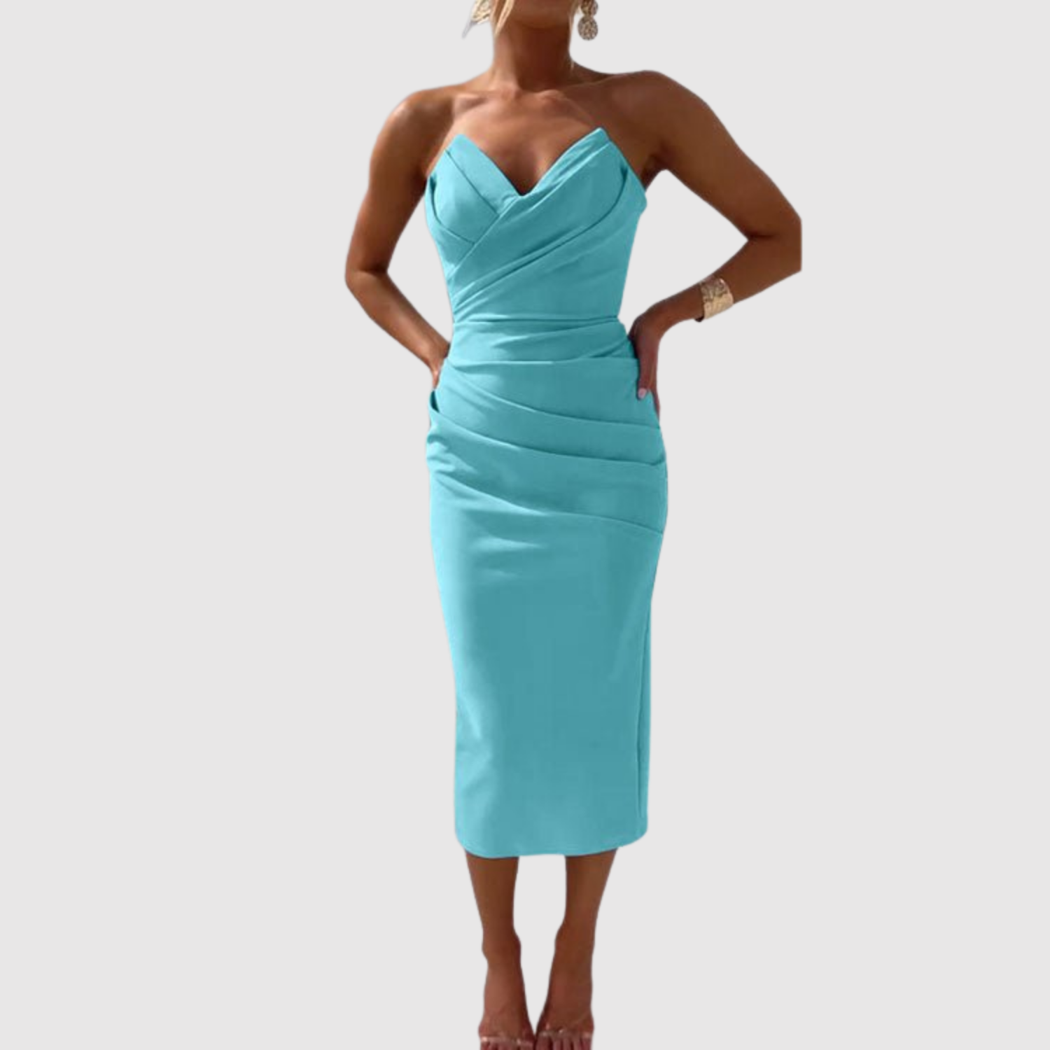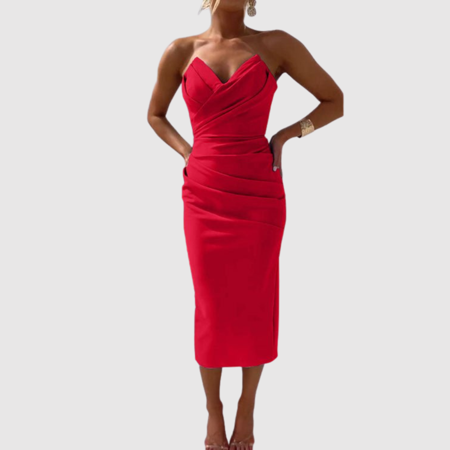 Софистицирана миди рокля с V-образно деколте и леки драперии отпред, която подчертава фигурата по елегантен начин. Изработена от еластичен материал, който съчетава комфорт с вечен дизайн – перфектна както за празнични вечери, така и за специални събития.