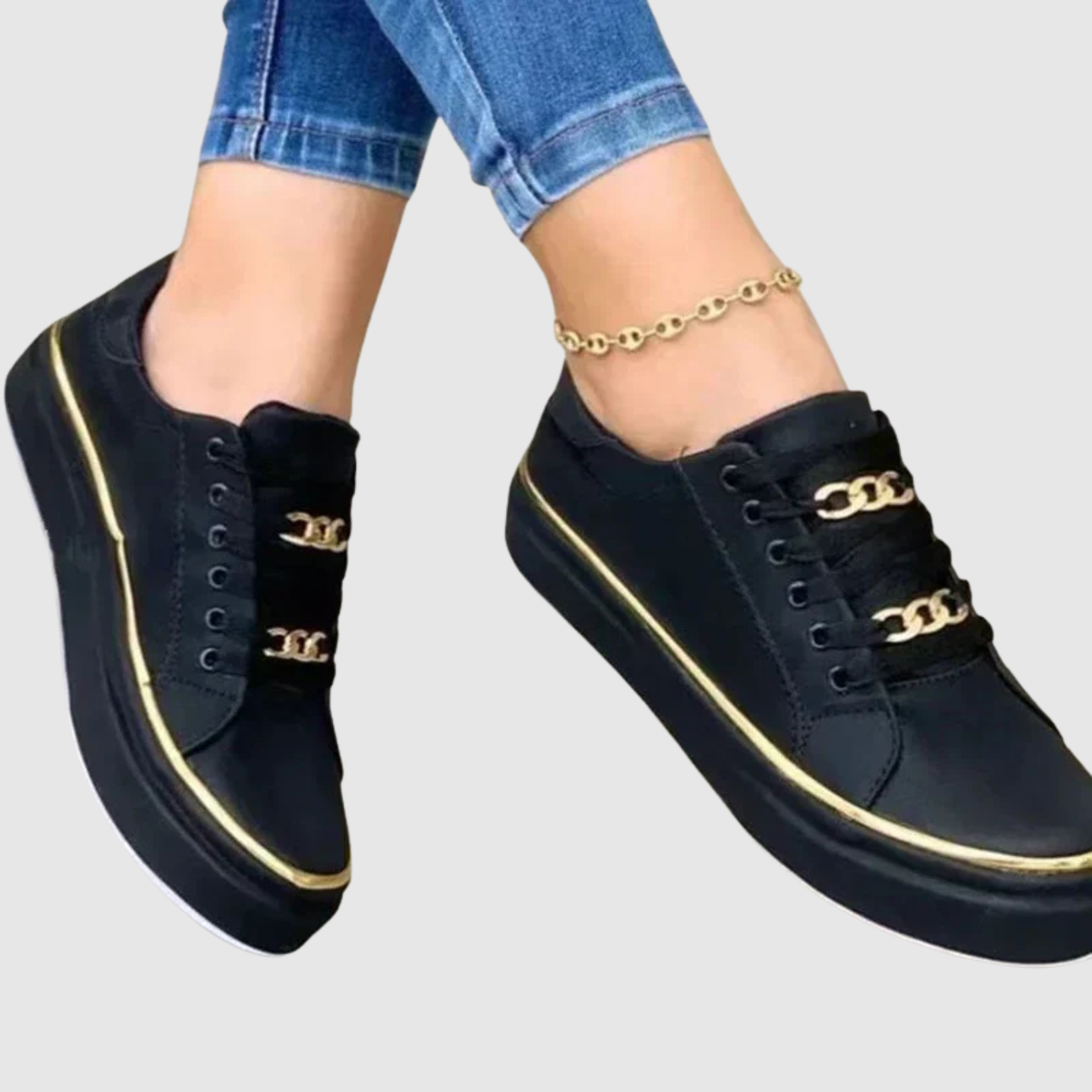 Маратонките Клара придават модерен и луксозен вид благодарение на златните детайли. Удобното прилягане и гъвкавата подметка ги правят идеални за ежедневна употреба и специални поводи. Перфектни за вас, които искате да съчетаете комфорт и елегантност.