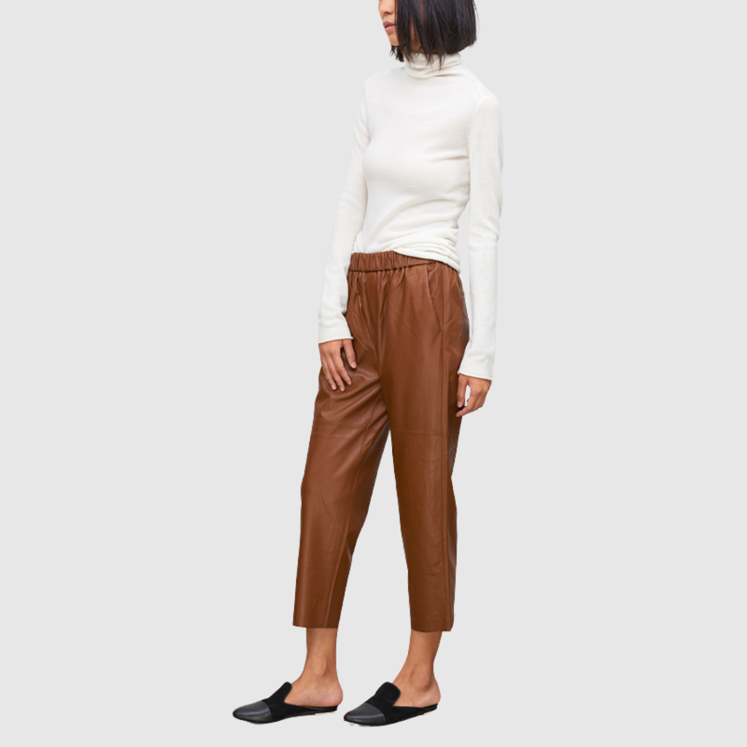 Тези панталони с кожен вид придават модерен и стилен вид. Еластичната талия осигурява комфорт, така че да можеш да ги носиш през целия ден с лекота.