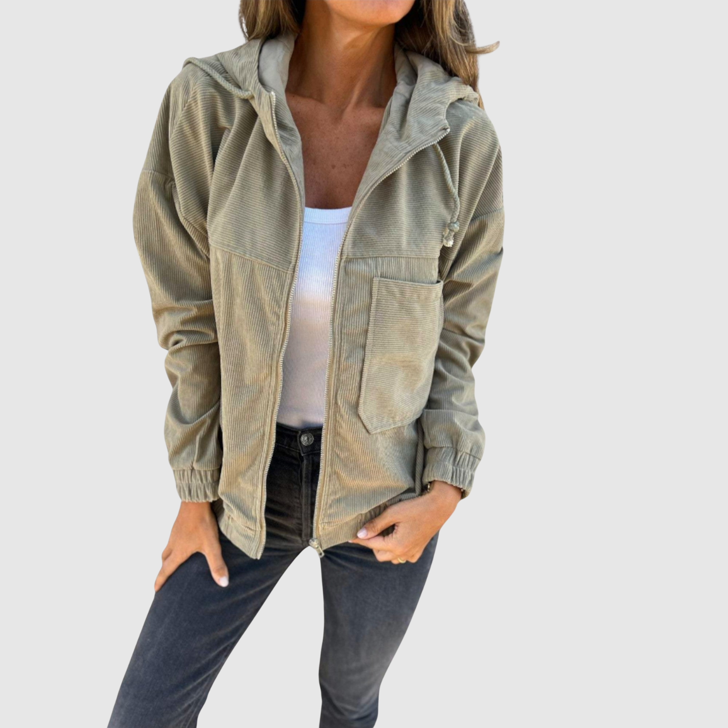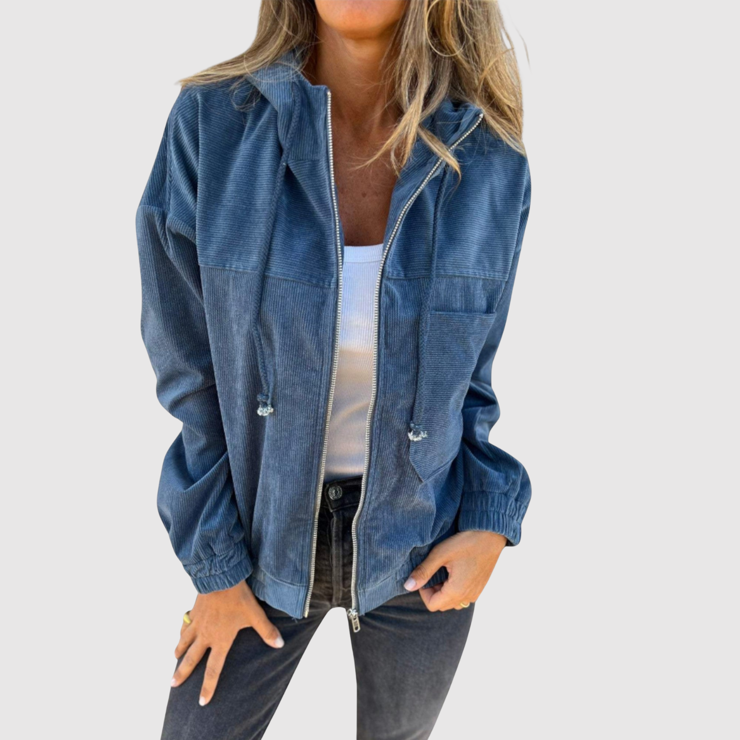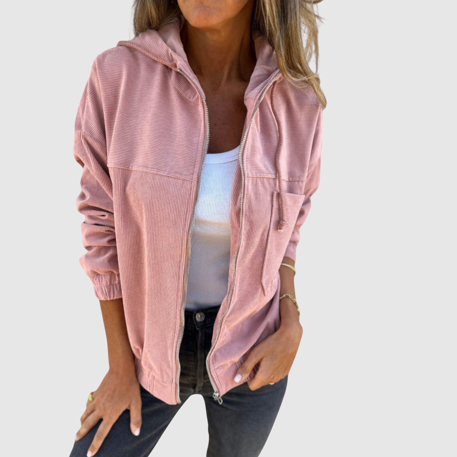 - Класическо закопчаване с цип, качулка и странични джобове
