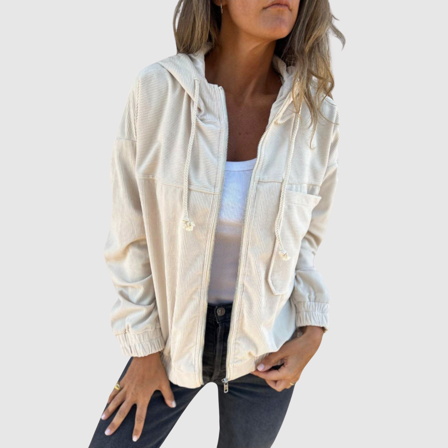 Тази лека яке е перфектният избор за пролетни дни. То комбинира мека, въздушна материя с разкроен, ласкателен силует, който предлага както комфорт, така и безгрижно излъчване.