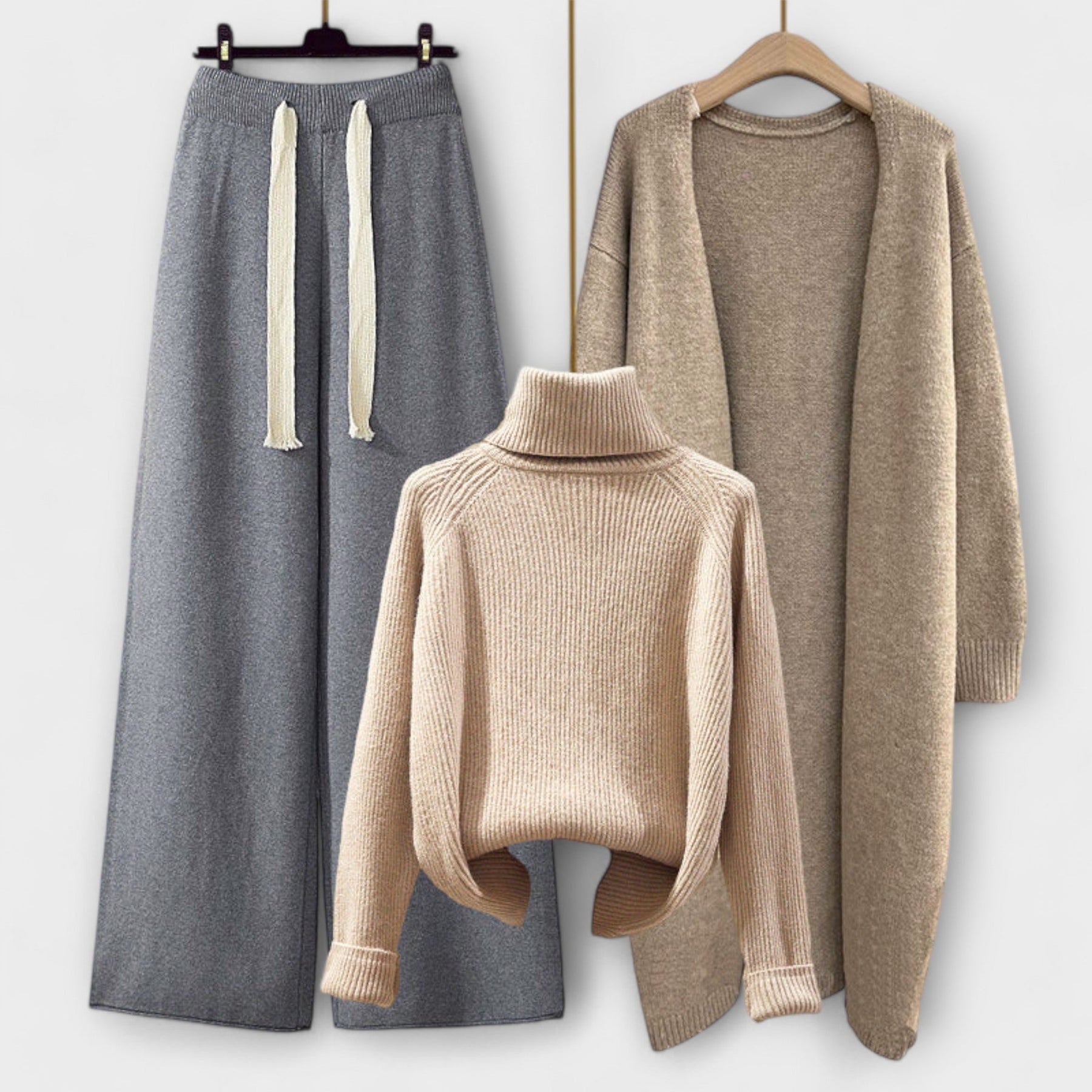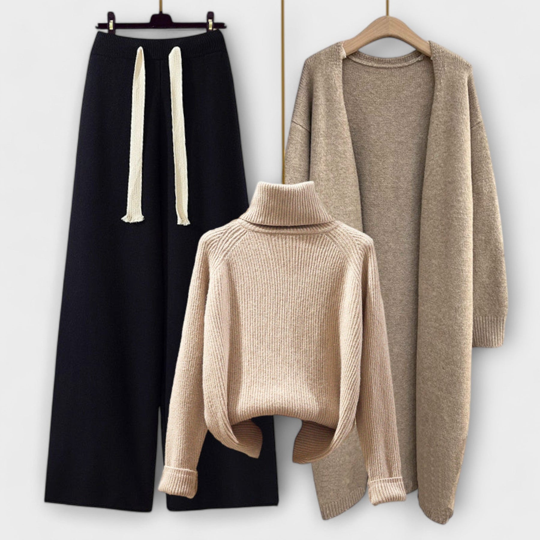 • Pilns trīs daļu komplekts: Izveidots no džemperi ar augstu apkakli, gara kardigāna un augsta jostas, platām biksēm – harmoniskam un stilīgam tēlam.