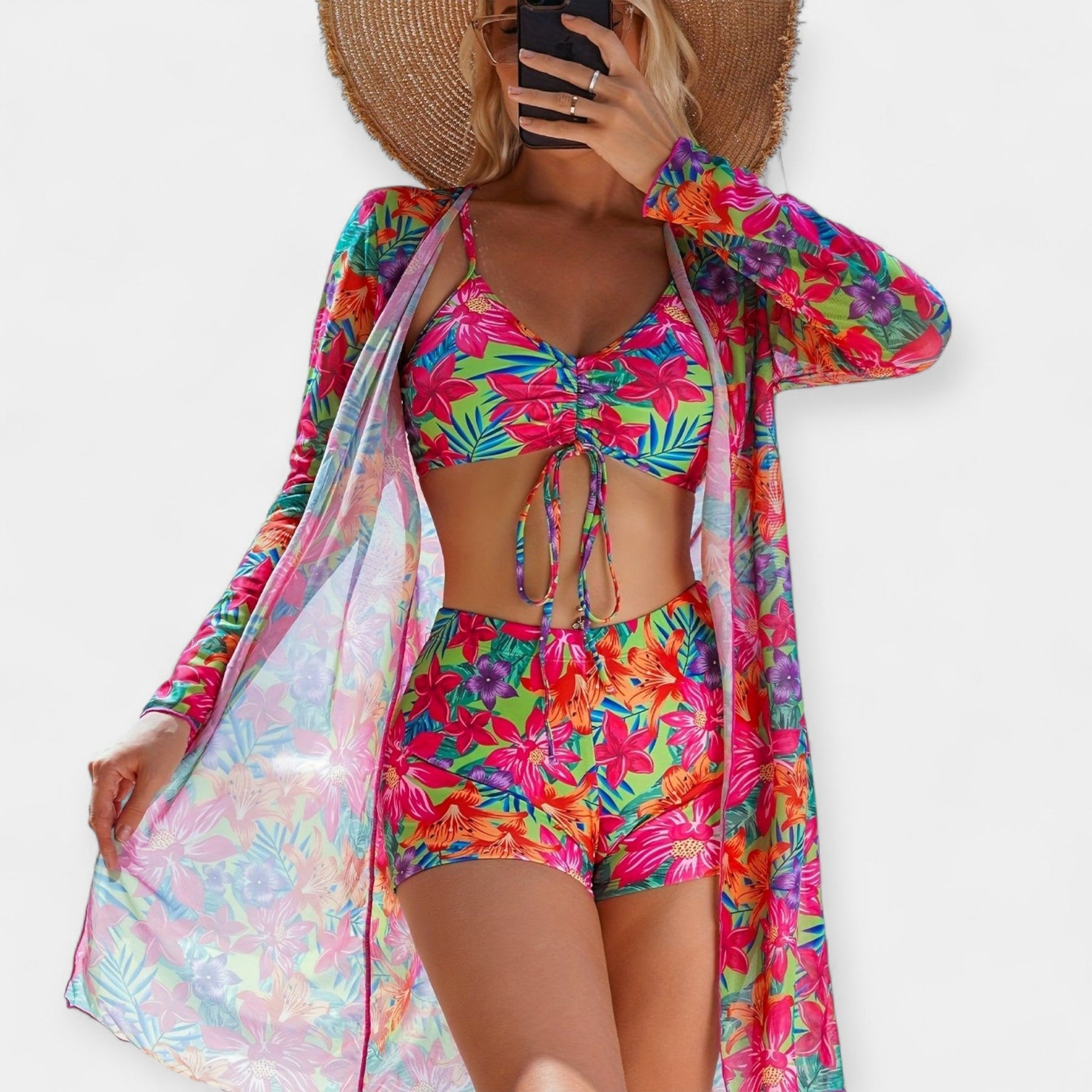 Šis modernais komplekts apvieno komfortu, stilu un eleganci, lai radītu izsmalcinātu vasaras izskatu. Augsta vidukļa bikini izceļ siluetu, tops ar lentīti uzsver krūtis, bet vieglais pludmales apģērbs piešķir rafinētību un daudzpusību.