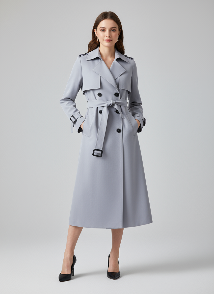 Šis elegants garš tranšējas mētelis apvieno klasiku un mūsdienu stilu. Ar savu jostu, divām pogām un perfektu šuvumu tas ir lielisks izvēle vēsākām dienām, nezaudējot izsmalcinātu izskatu. Piemērots gan ikdienai, gan īpašiem pasākumiem.